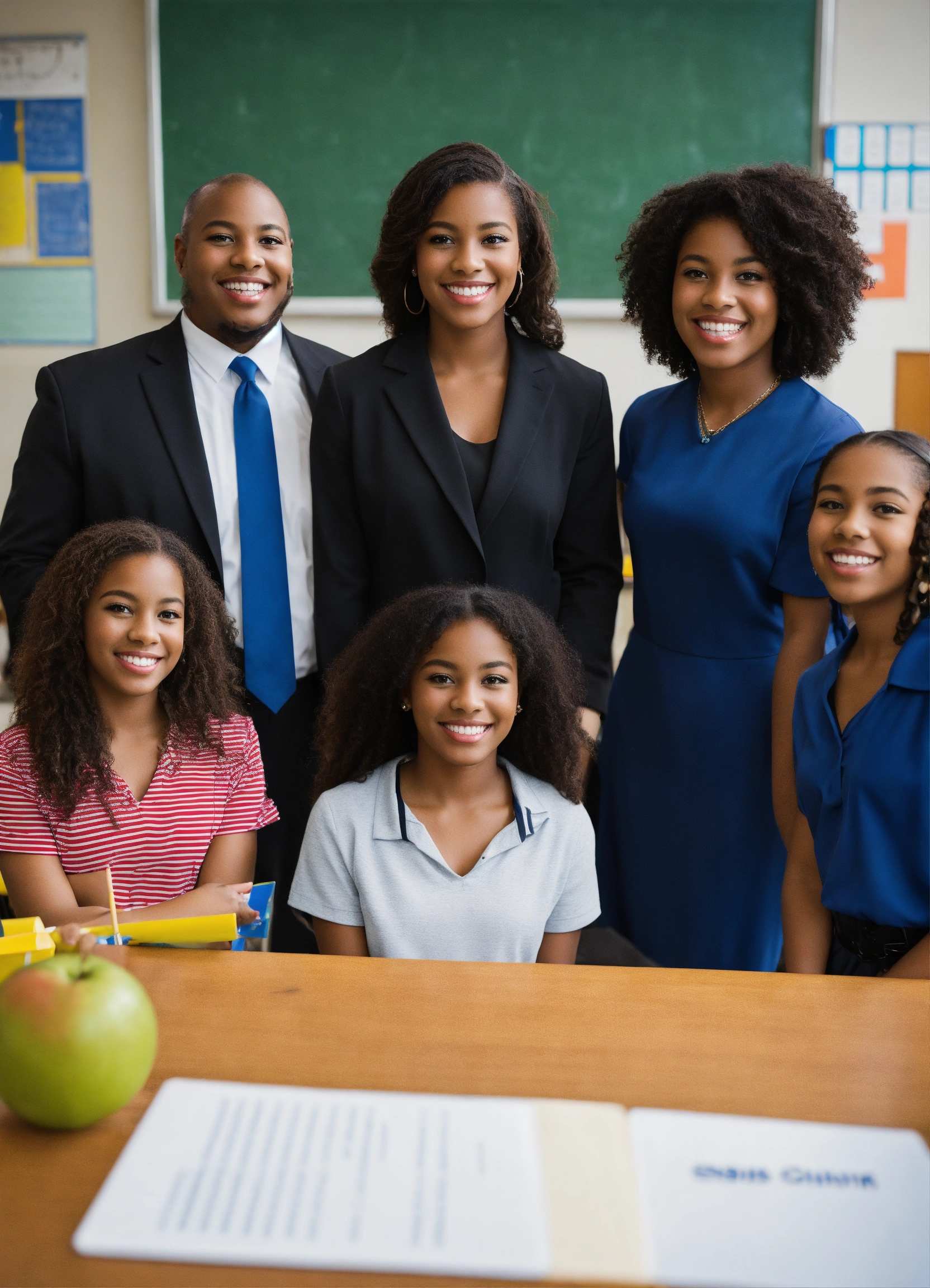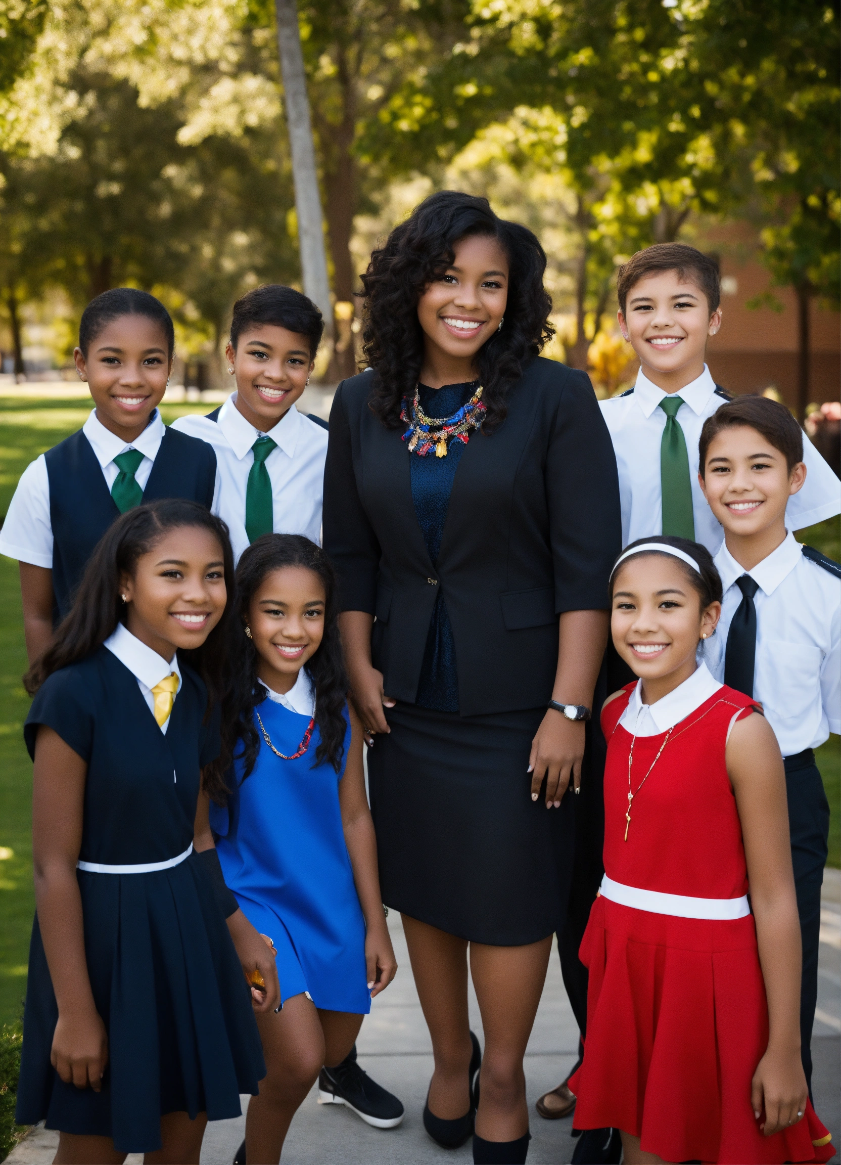 A black sharply dress professional looking school official with smiling group of middle school students of black and hispanic descent