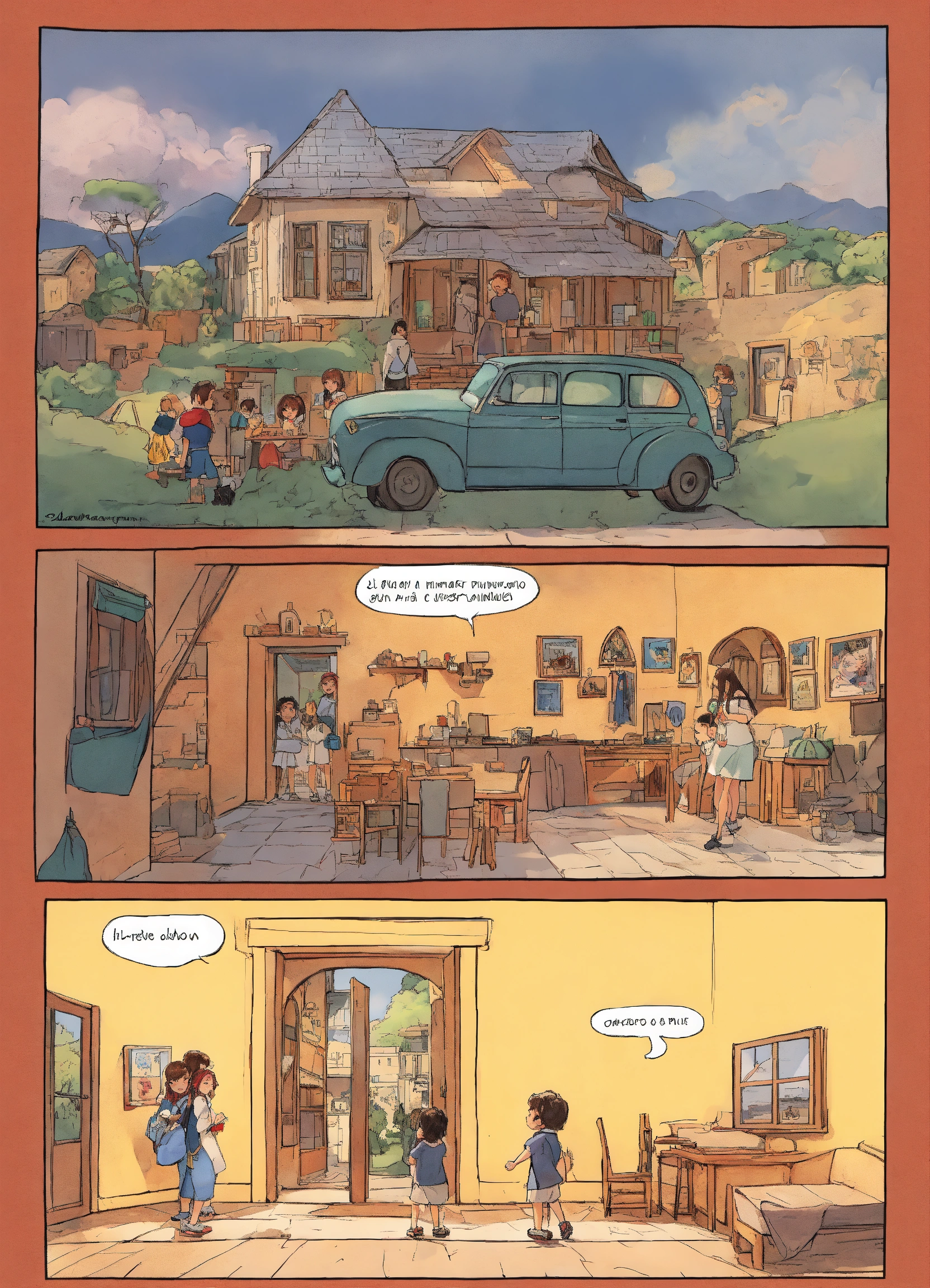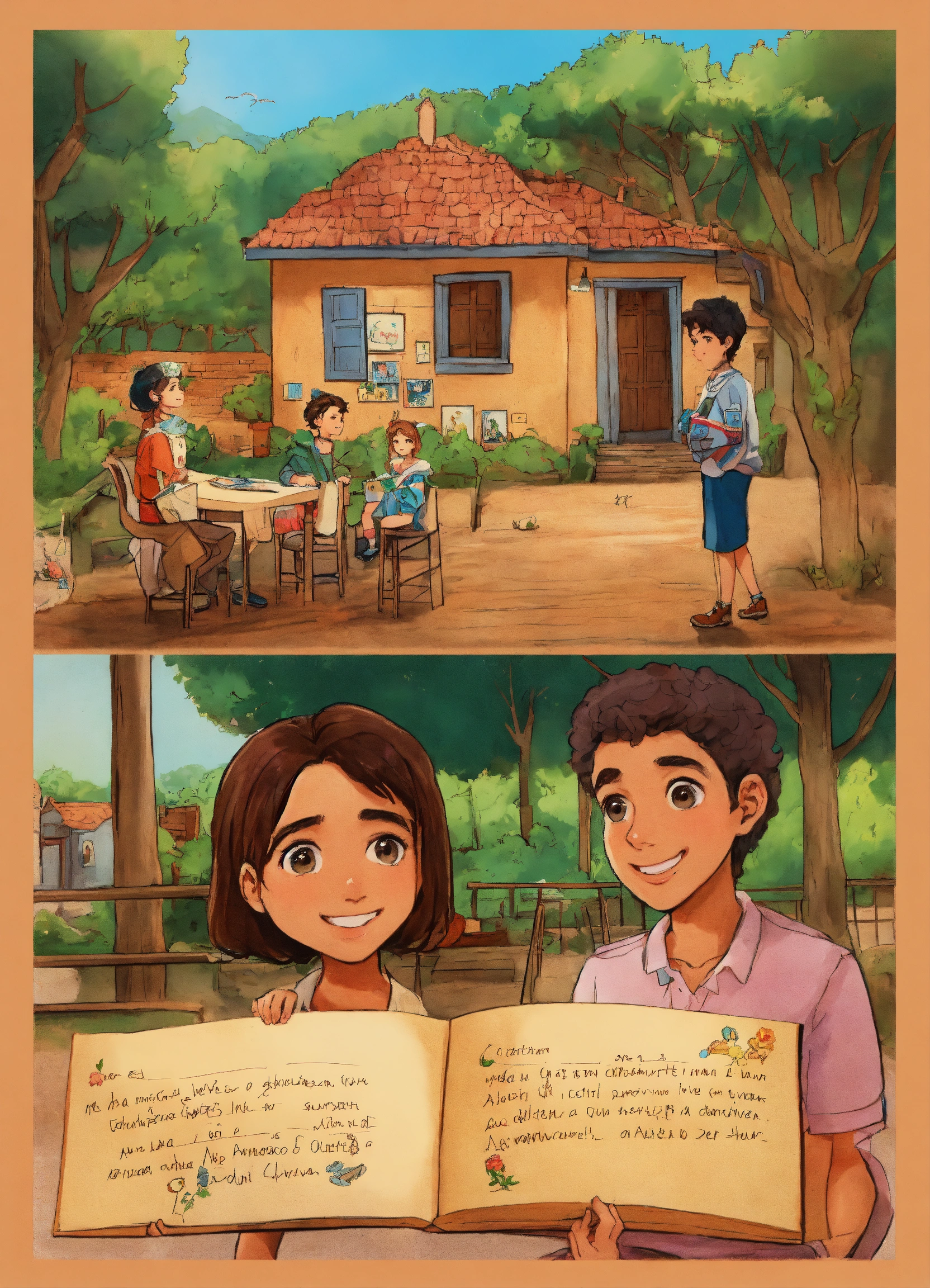 História infantil. desenho lúdico em quadrinhos sobre adriano começar sua jornada visitando sua primeira amiga, ana. ela sugeriu a palavra amor.