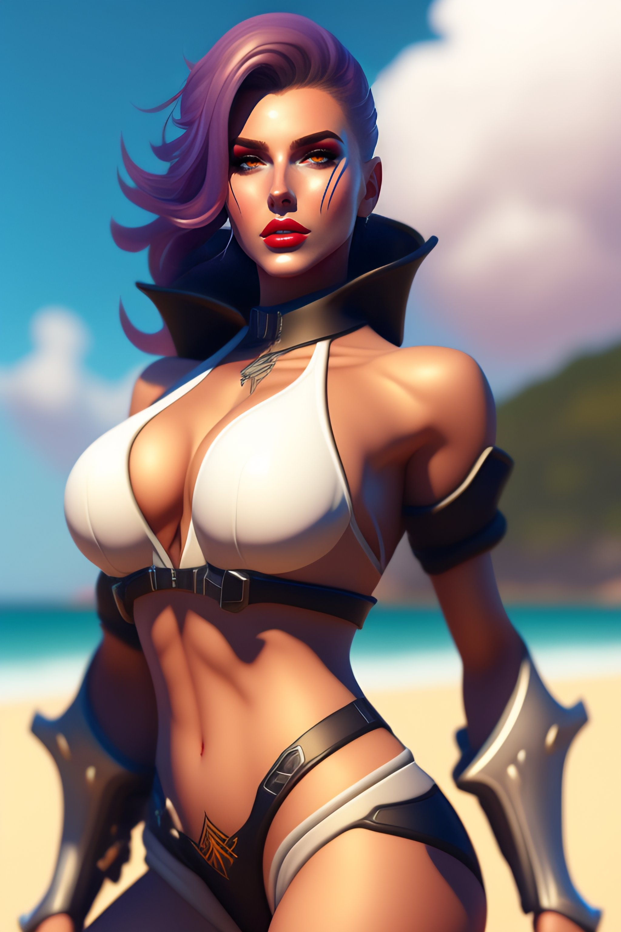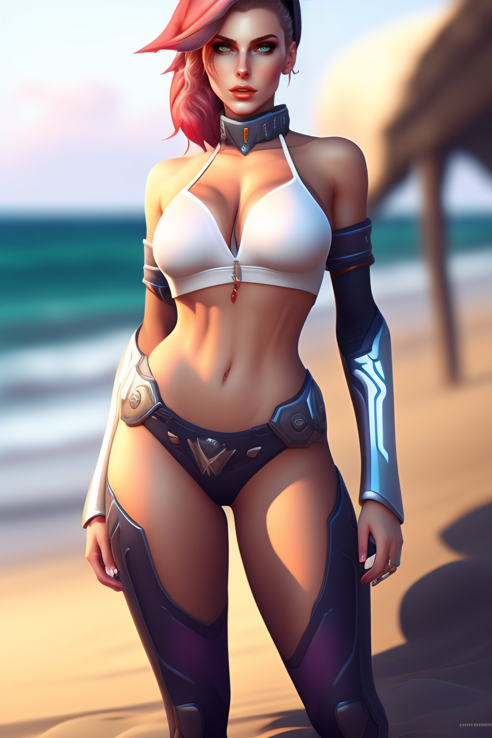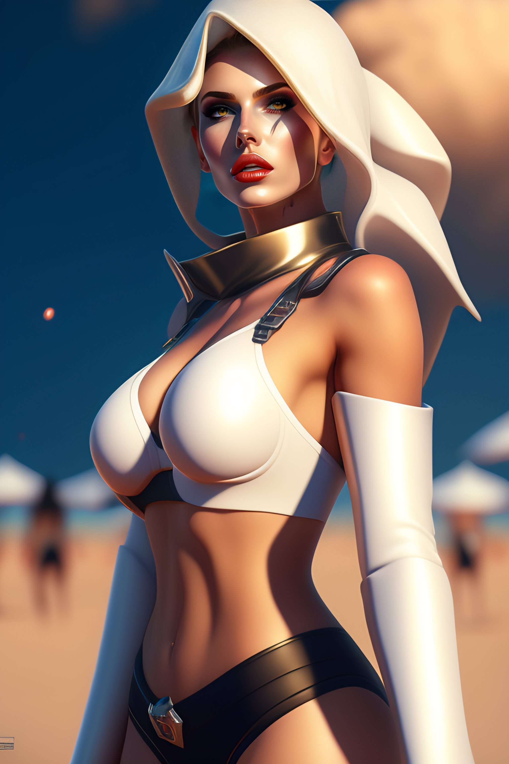 Reaper from overwatch, as a girl, highly detailed, wearing a white bikini, dystopian, big luscious lips, big female chest spheres, digital painting, artstation, concept art, sharp focus, illustration, beautiful face, ripped clothes, at the beach, small waist, nice legs, elegant, attractive, pretty, beautiful model, full-body shot, 4k