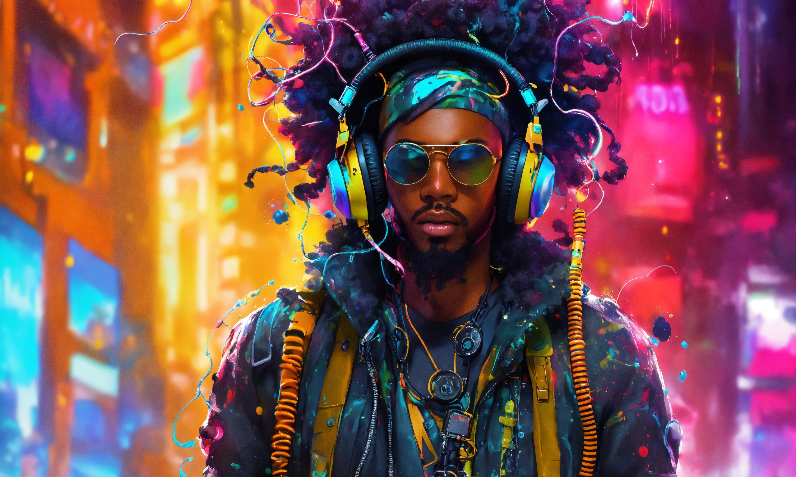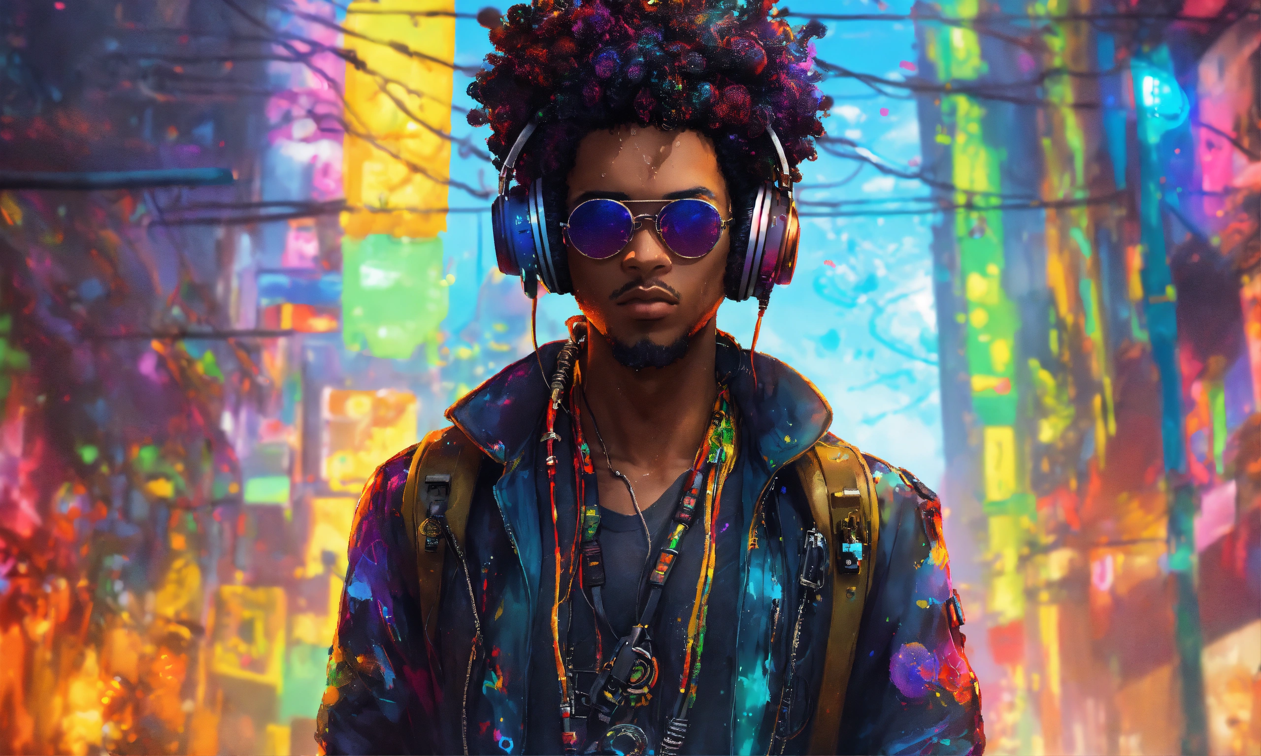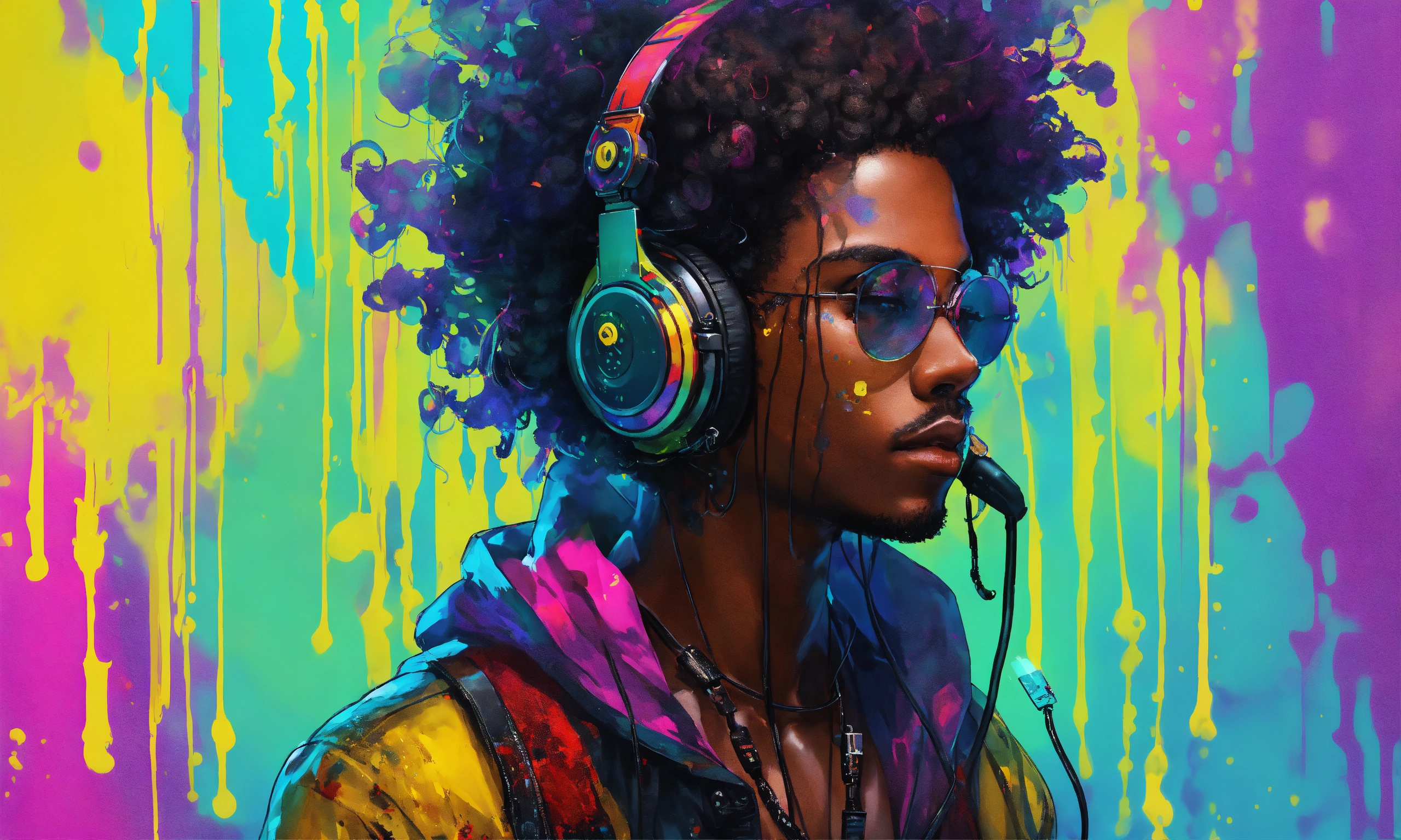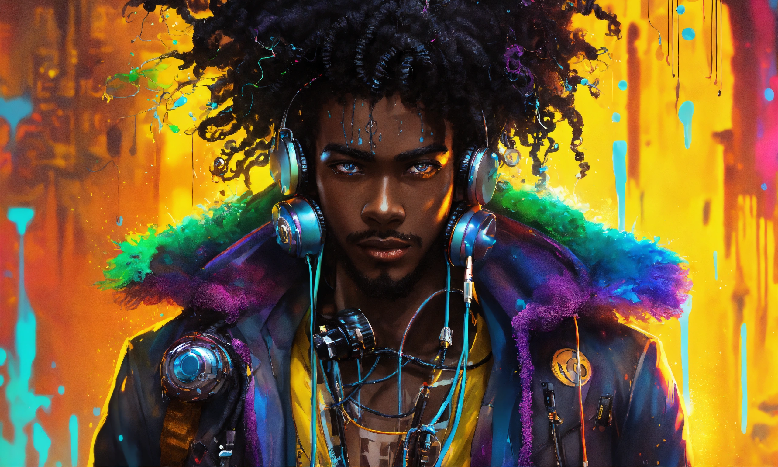 Full body rendition of a gothic-punk african american deep dark complexioned male with curly coiled modern cut high top afro wearing cyber steampunk gear themed drip paint headset. standing tangled in usb-c cables and hdmi cables..brightly colored paint splatters and drips in background. water condensation effect, photograph, intricate detail. rule of thirds. moe ghibli anime mashup