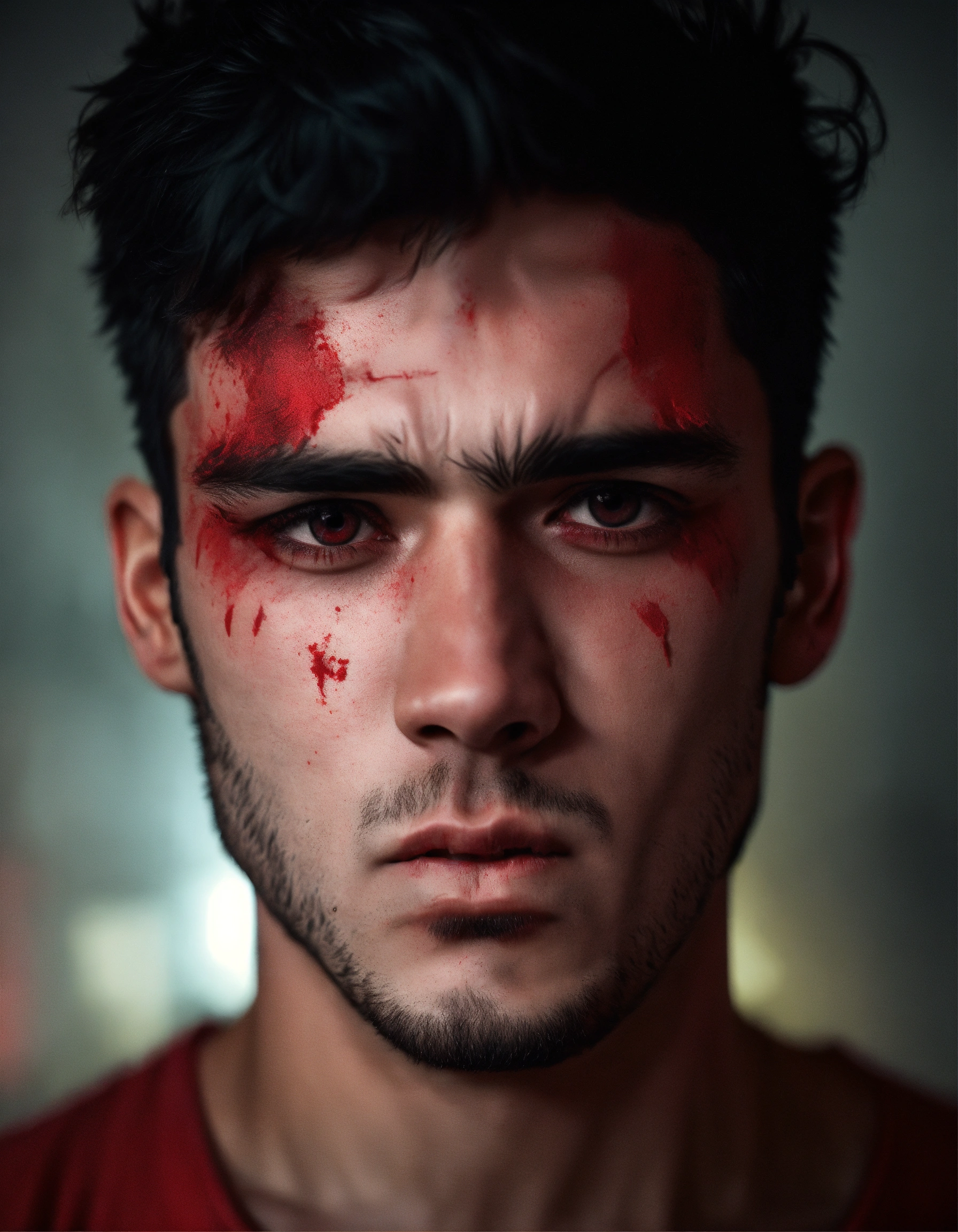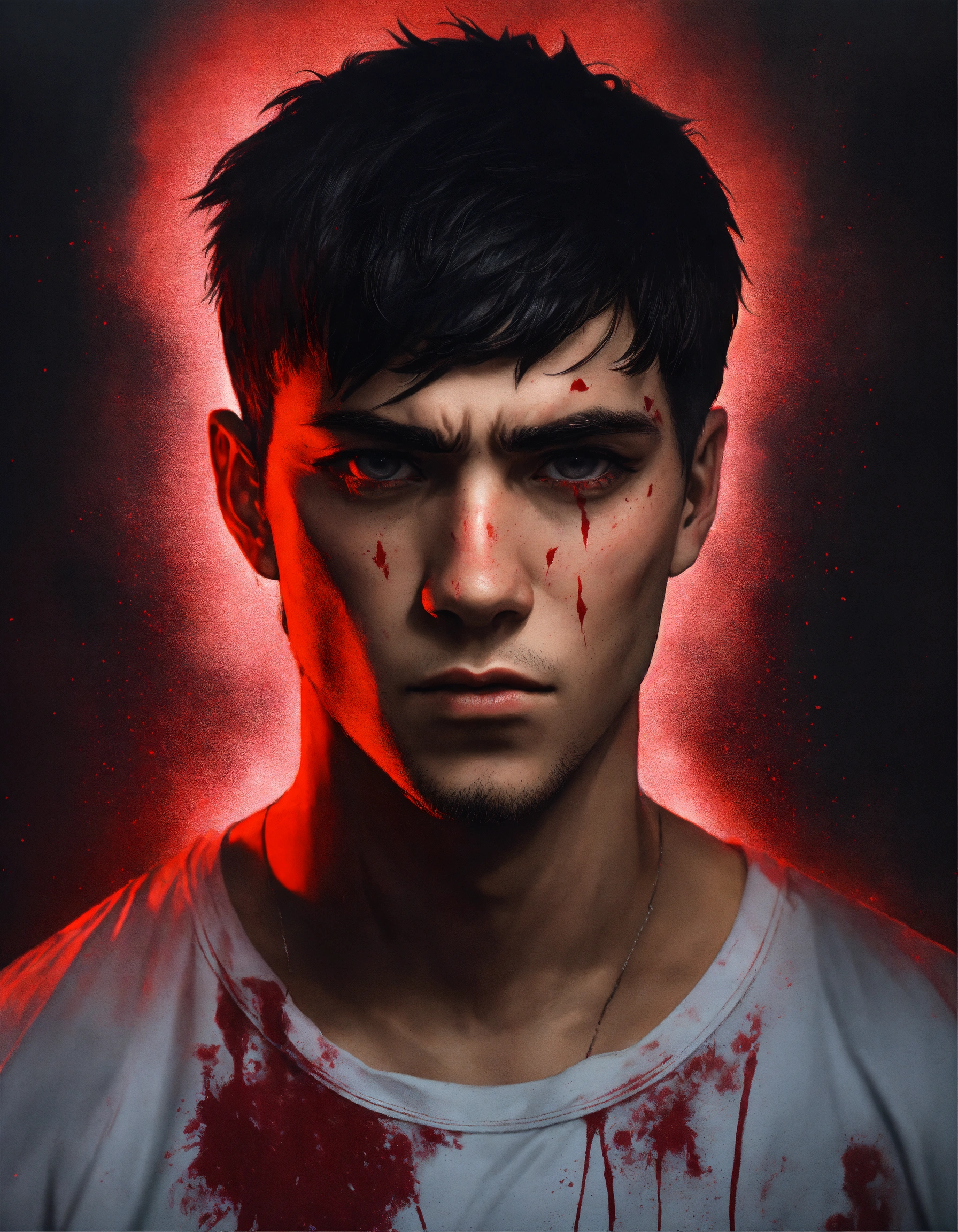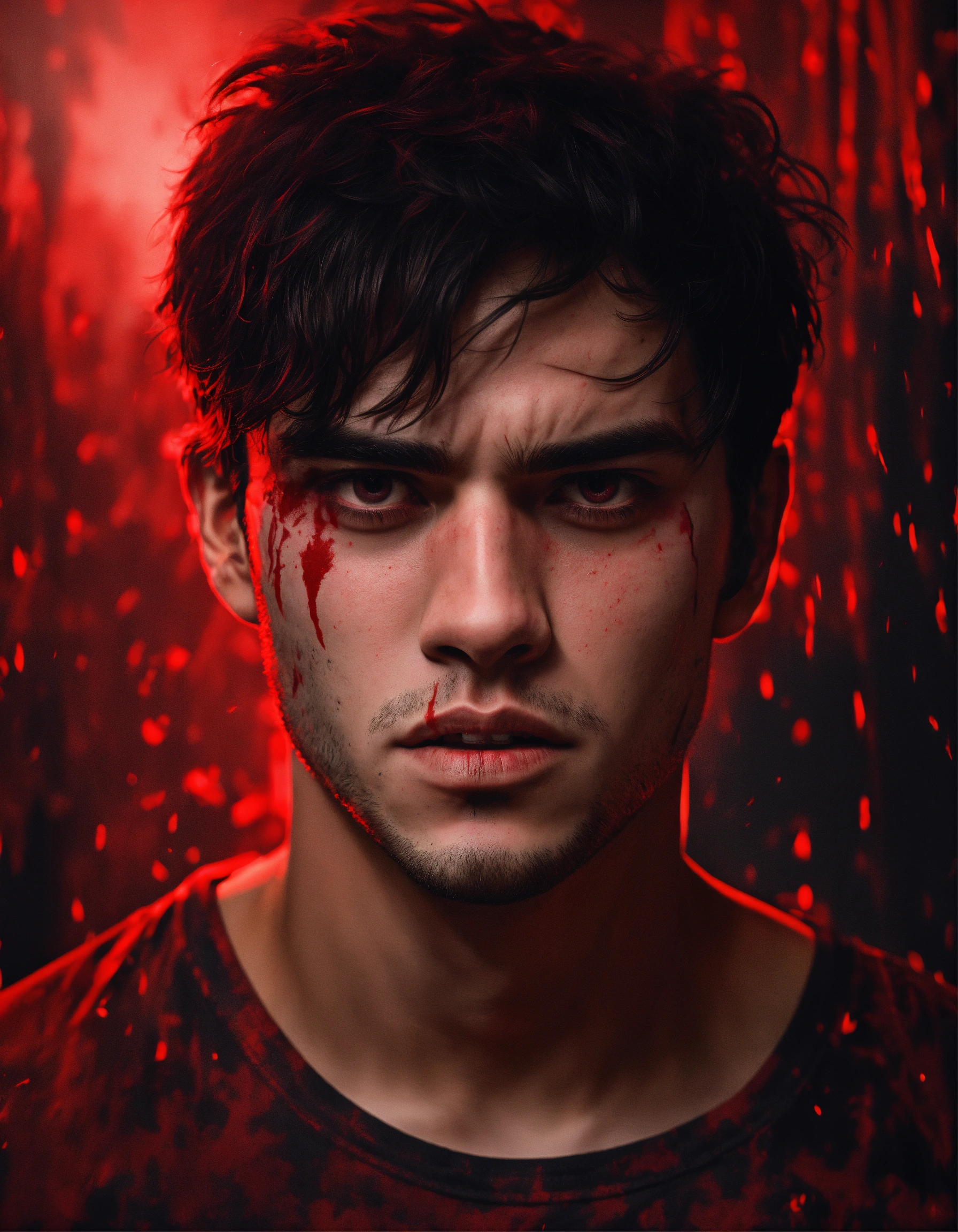 A realistic photograph of a 22-year-old man, with a scary angry expression, black messy short hair, dark black eyes, with a cut scar in the eye, with no beard, strong constitution, wearing a white t-shirt, covered with red dye, with a dark background with red leds, dramatic illumination, hyperdetailed, hyperrealistic, 8 k