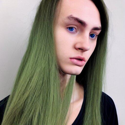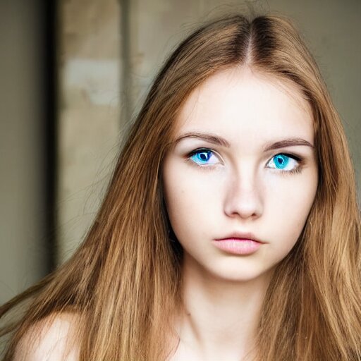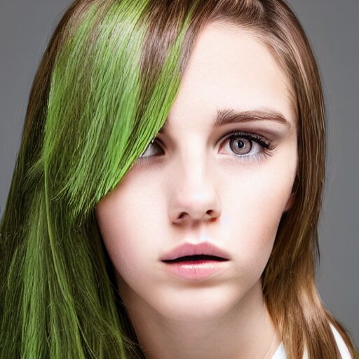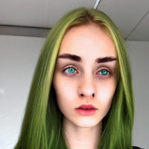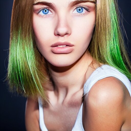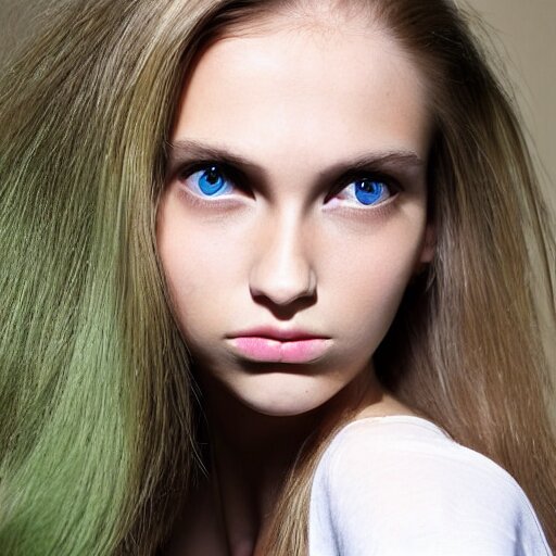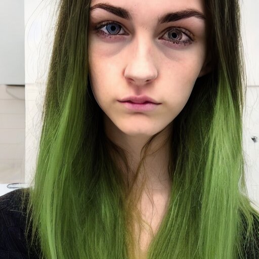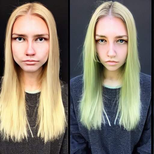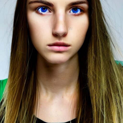 Brunette with dyed blonde hair, 21 years old, 165 cm tall, long flat blonde hair, eyes green, 30% smaller nose, smaller mouth, round shaped face, big forehead, lop eared, thin eyebrows, real life photograph