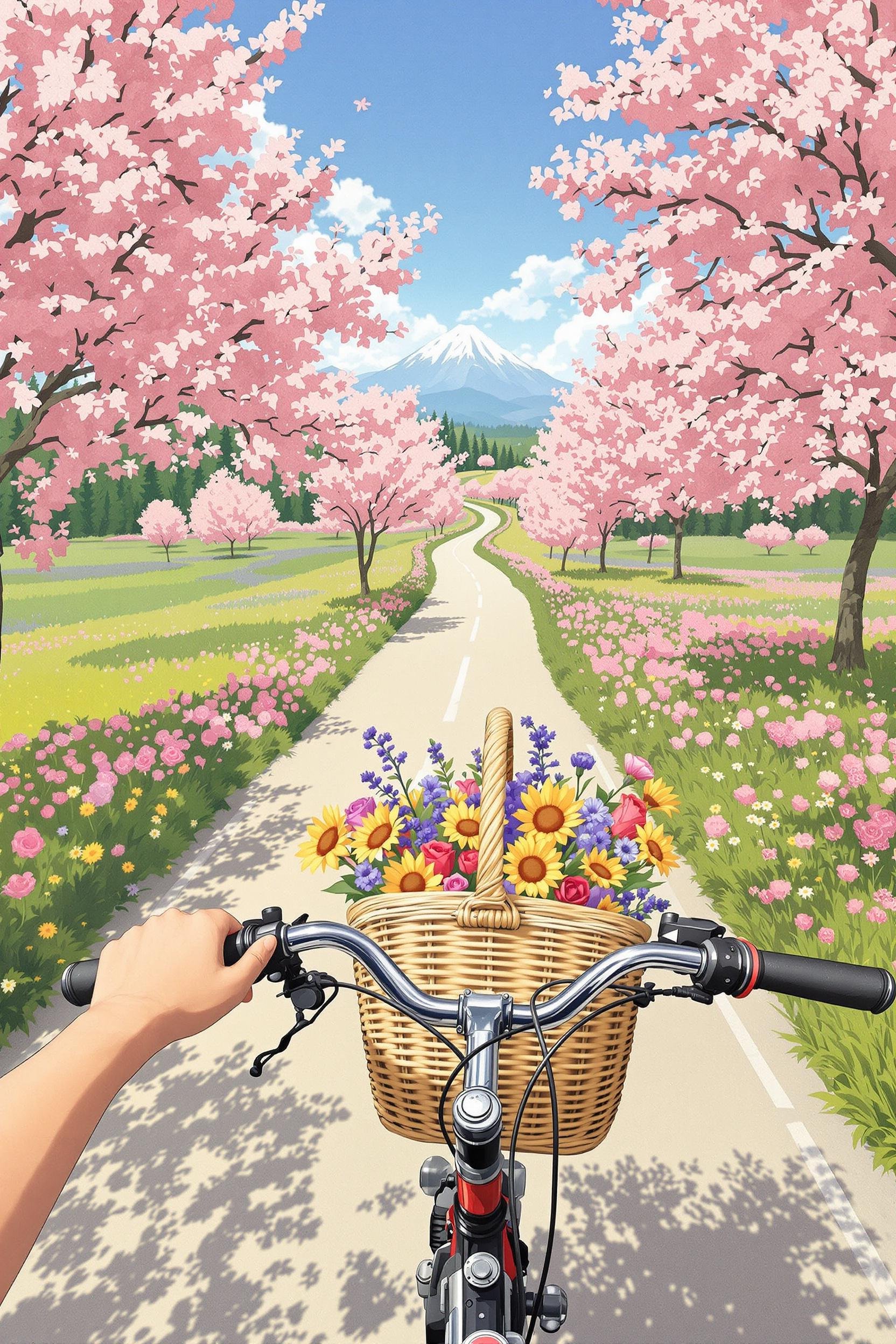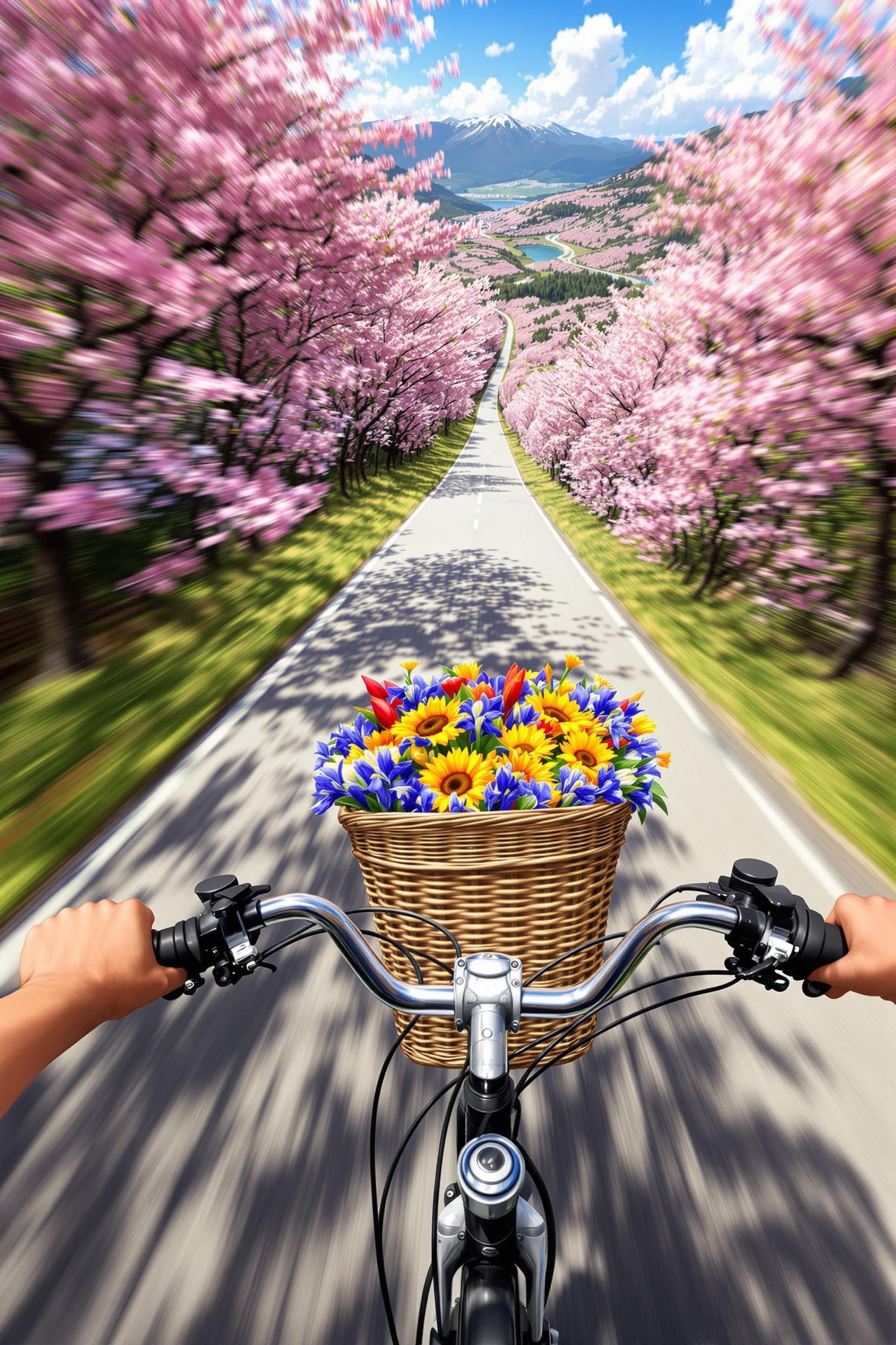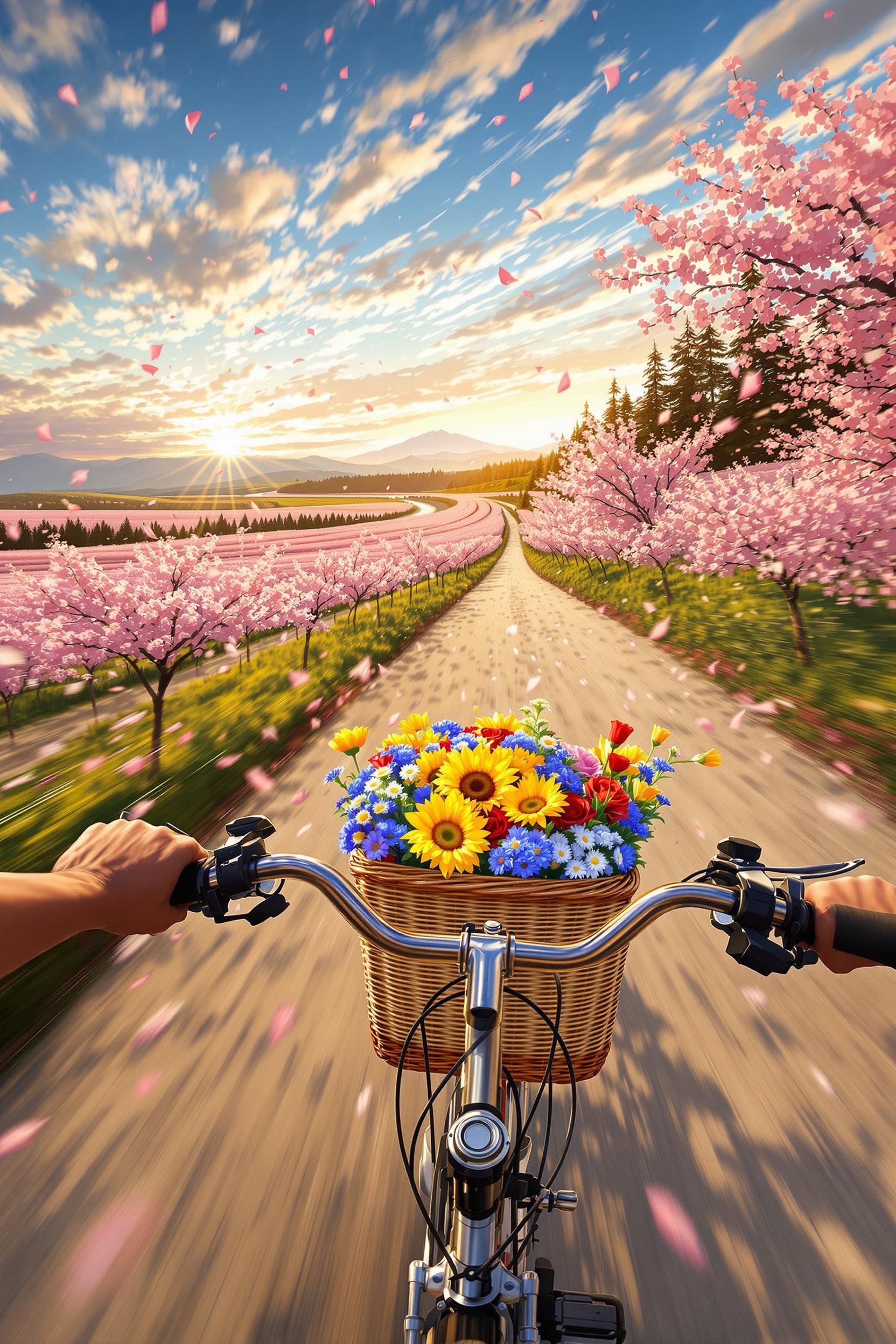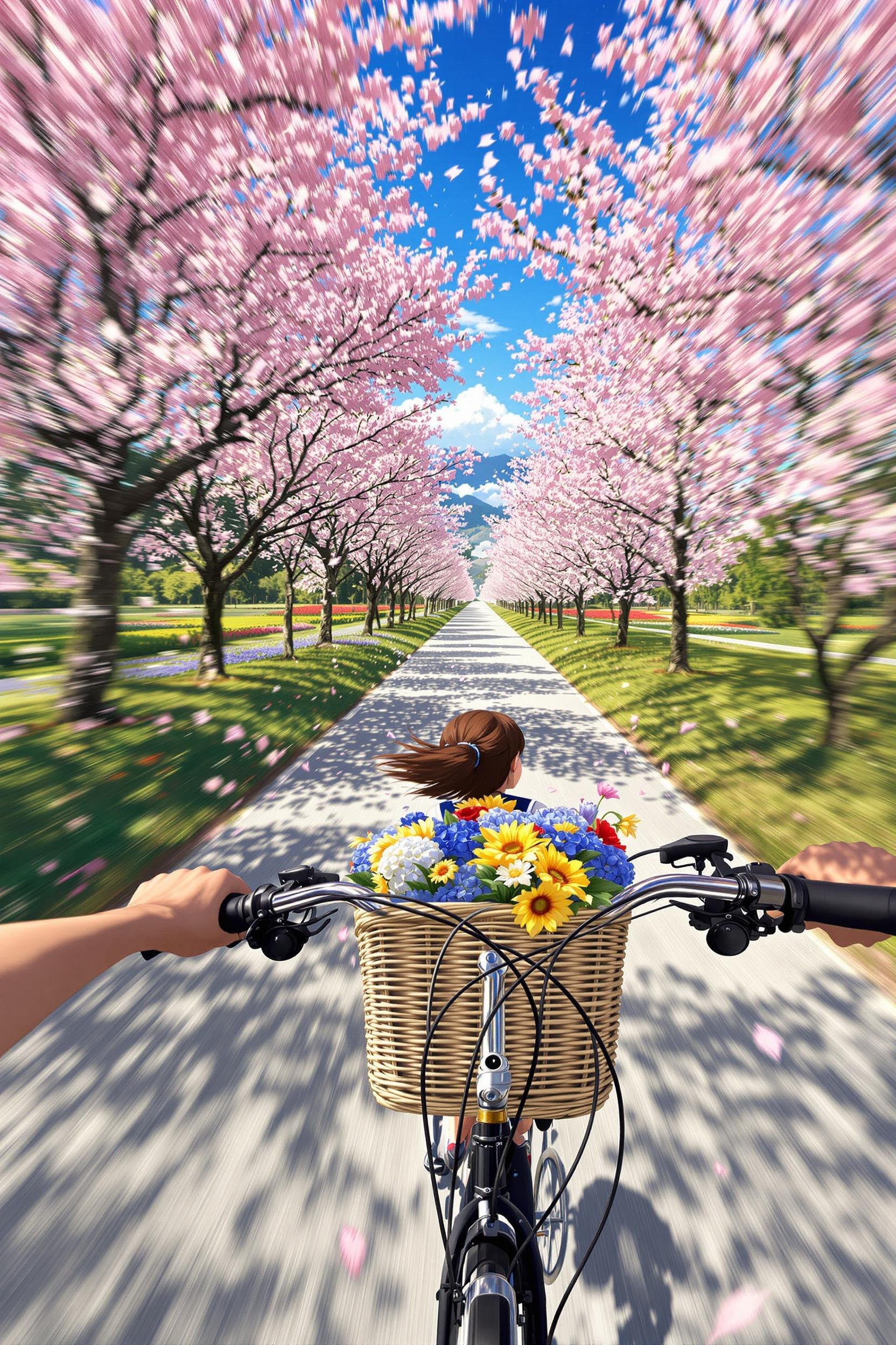 Anime fast paced shot, motion blur, from a first person perspective, a girl holds handlebars with both hands and rides a bicycle on a narrow and winding path. the audience's perspective comes from the front of the bicycle, facing the horizon. on both sides of the road are clusters of pink flowers, with petals dancing in the sky. in the distance are blue skies, white clouds, and forests. in front of the bicycle hangs a wicker basket filled with blue, yellow, and red flowers, adding a touch of nature and charm.