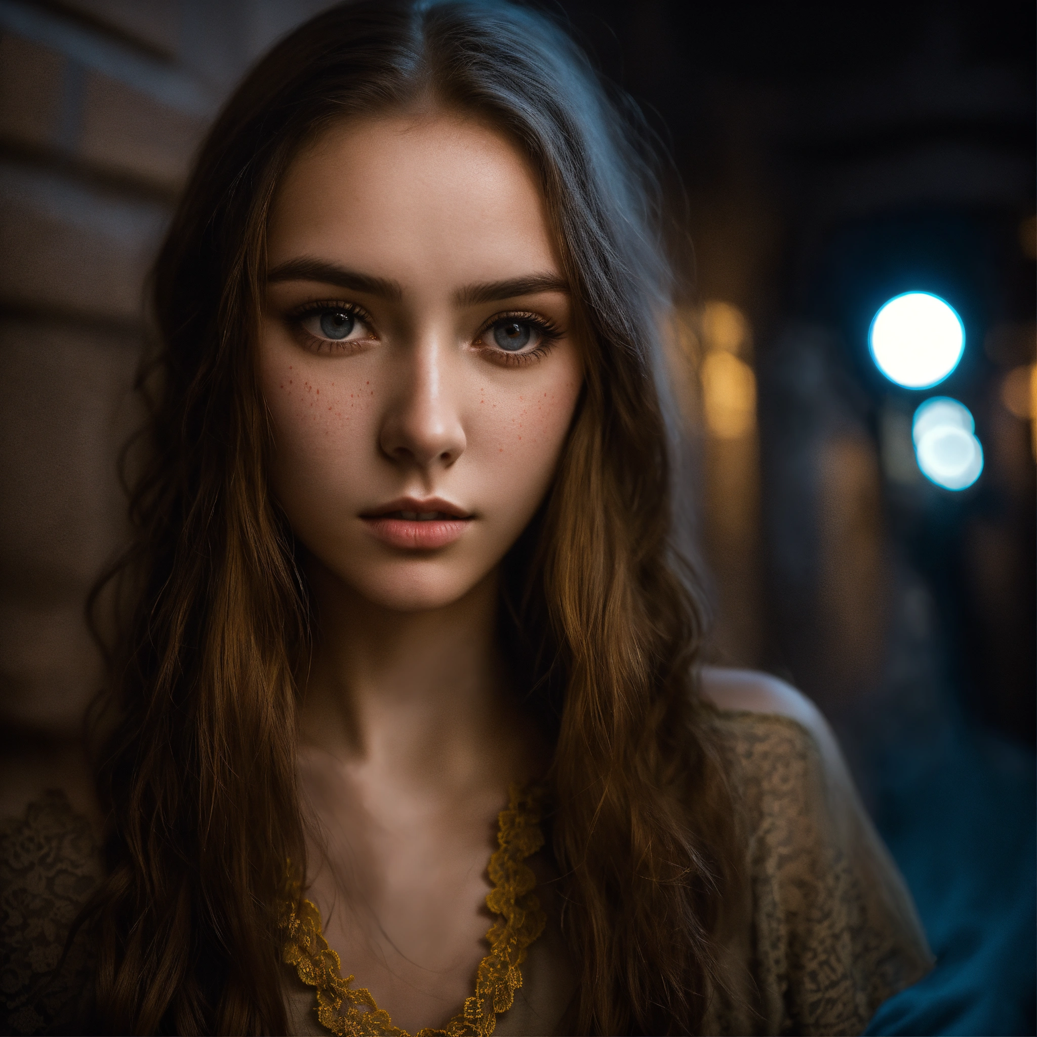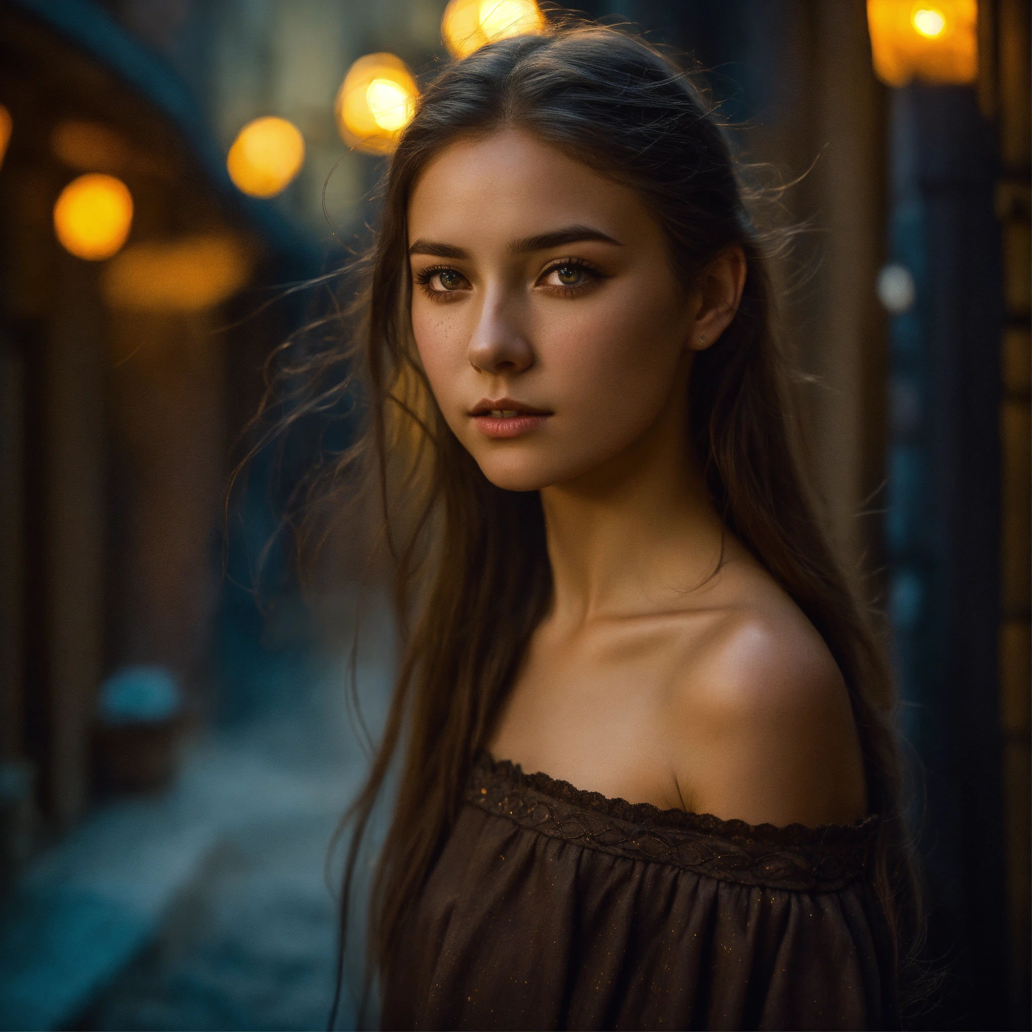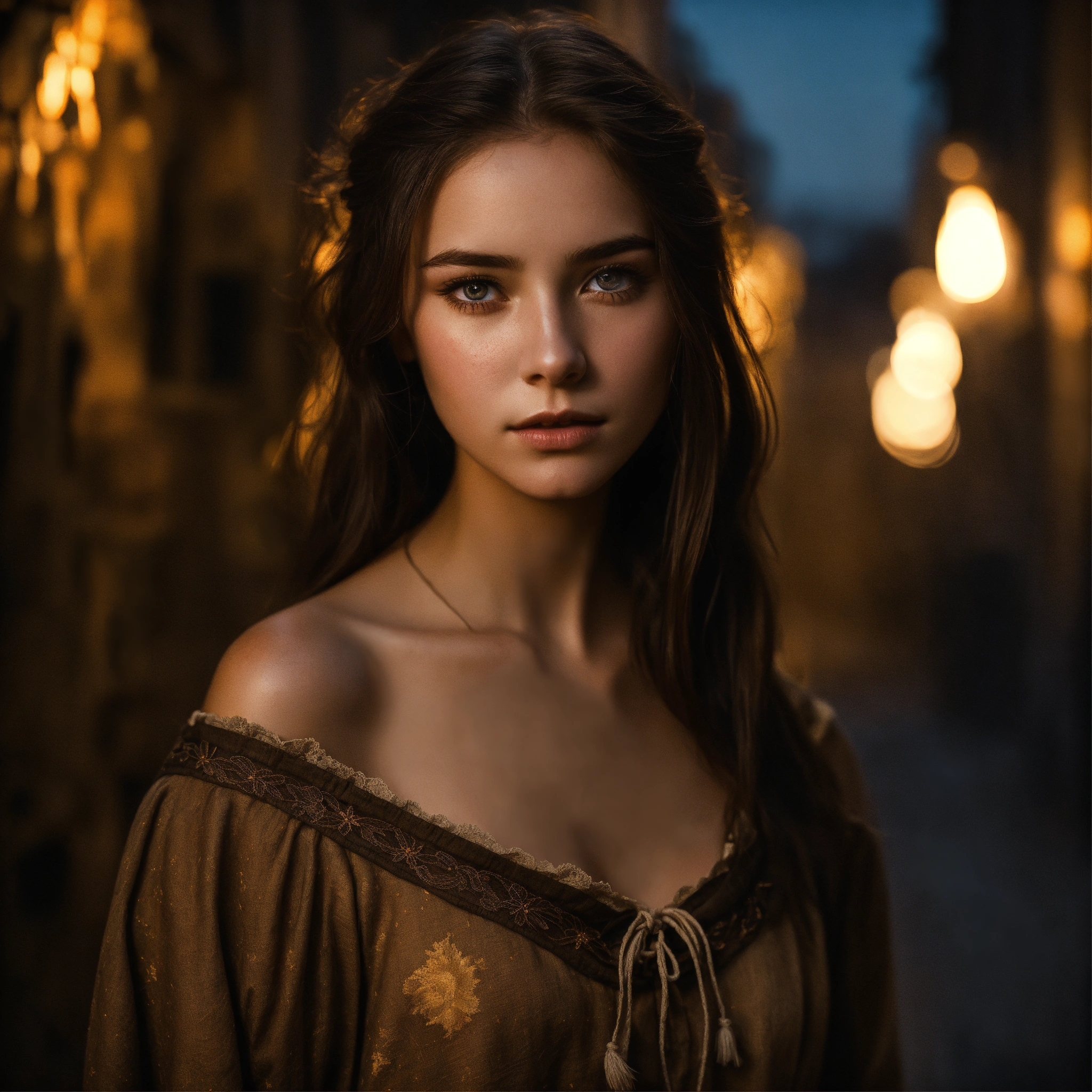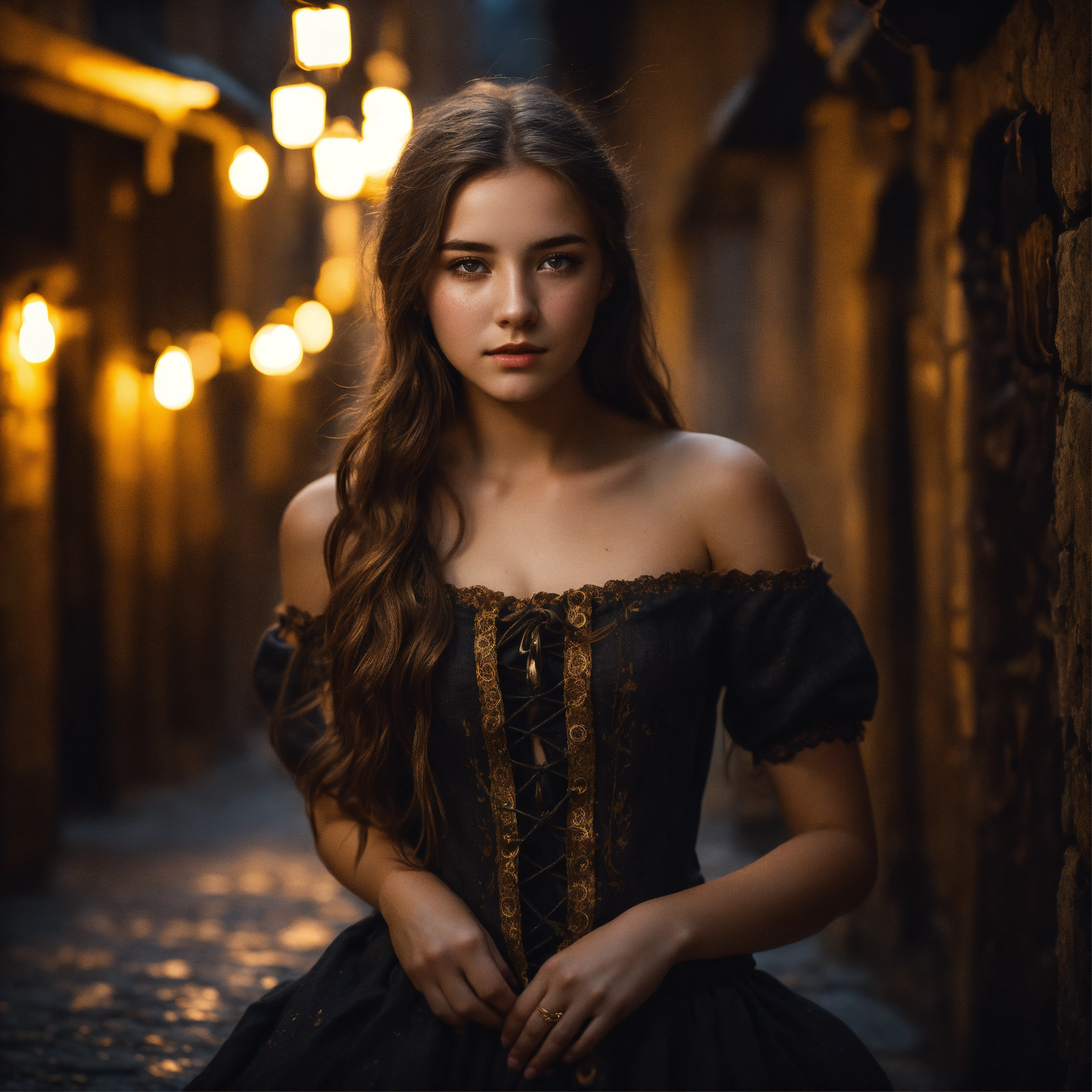 Portrait, goddess of beauty, childish, highly attractive 14 years old girl, long brown hair, captivating speckled golden glowing eyes, and pale skin, very narrow face with high cheekbones, thin eyebrows, very slim, lightly clad, black off-the-shoulder linen blouse over that a brown lace-up bodice, black linen trousers, stands in the night in a dark medieval alley, graceful, wispy, intimate, most beautiful girl, verführerisch, darkness, mysterious, glowing eyes, dark, cold ambient lighting, focus on face, extremely detailed, fantasy, medieval town setting