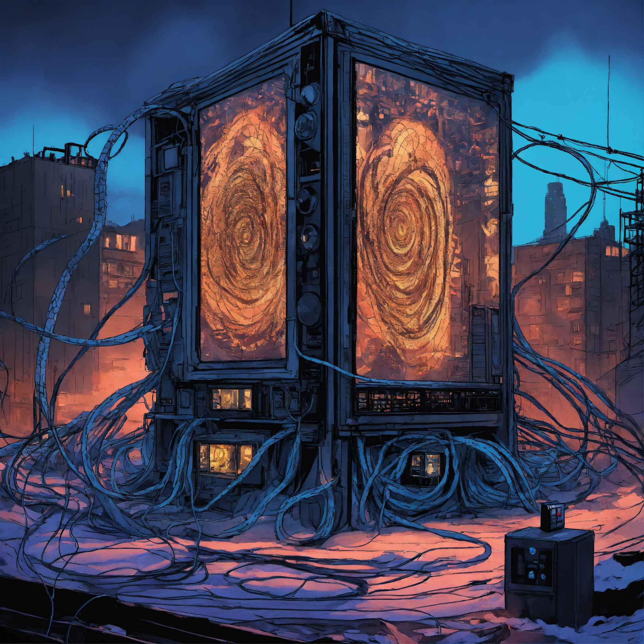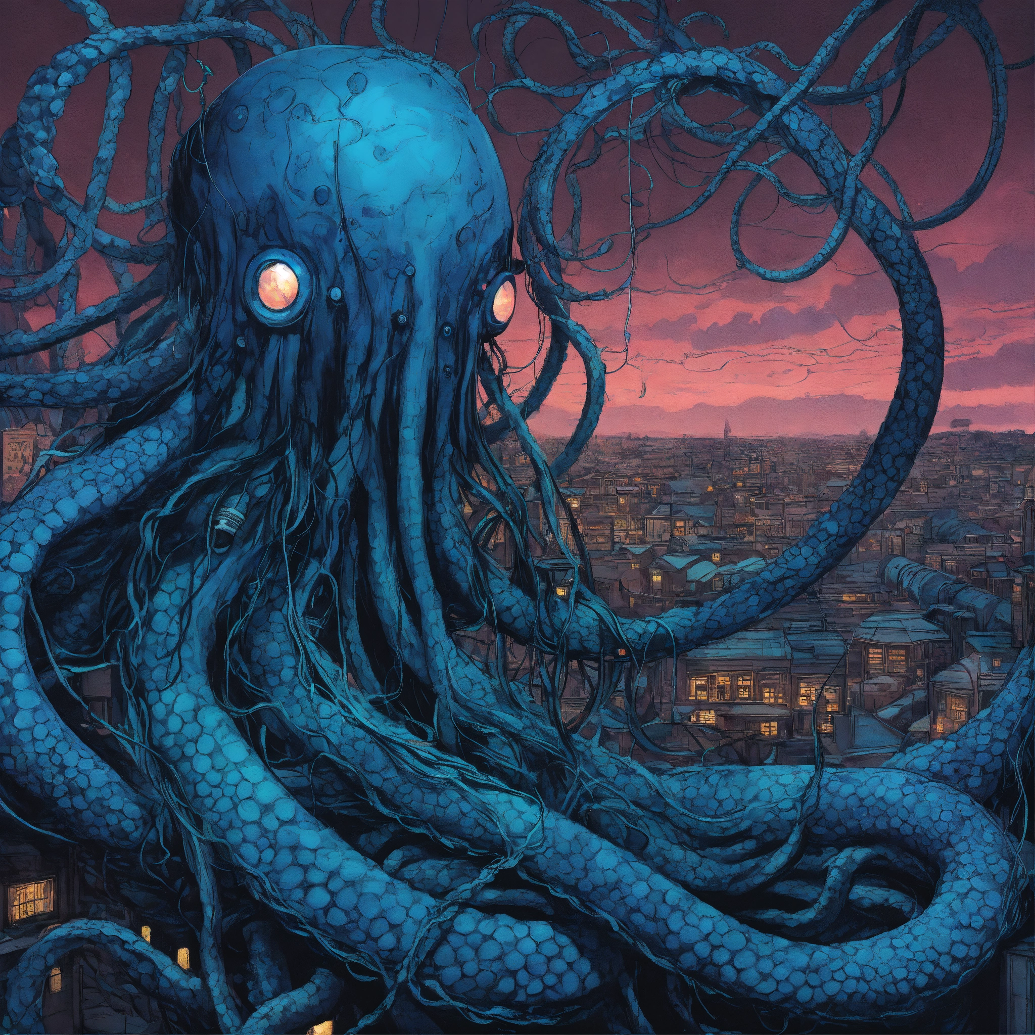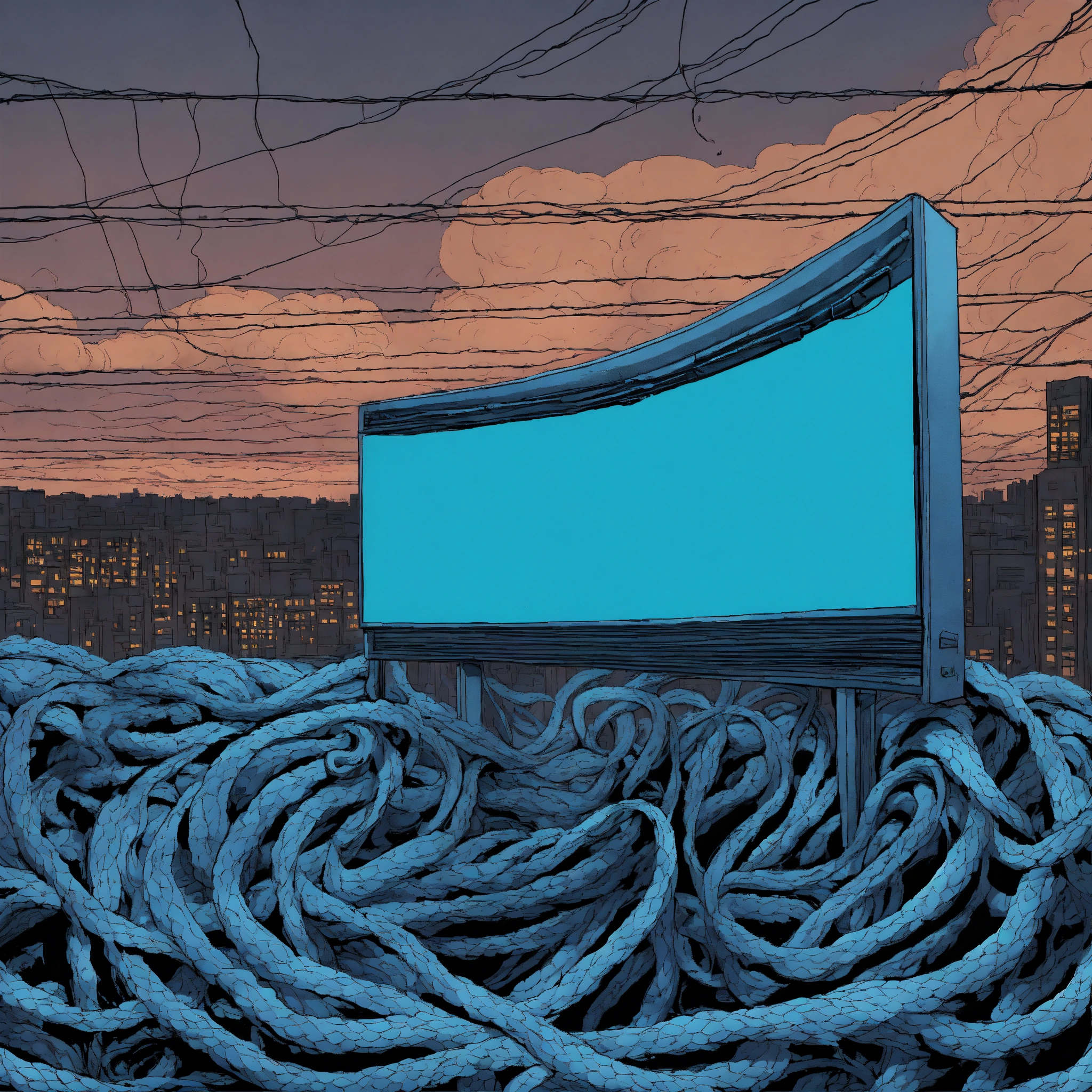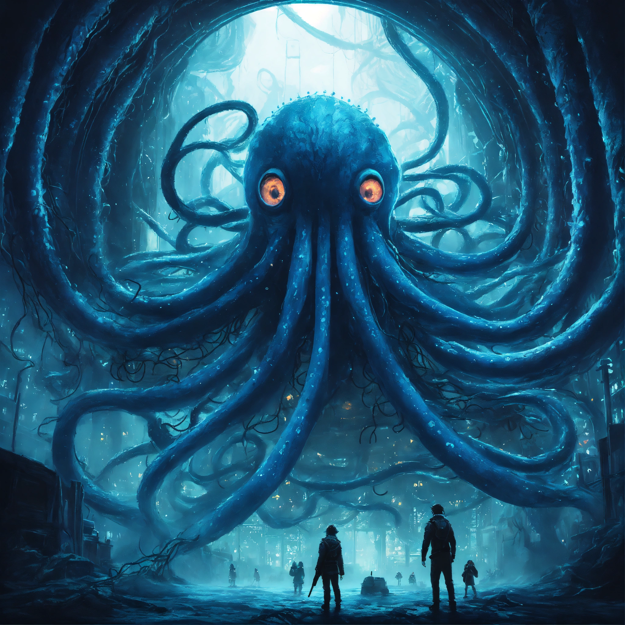 Craft an image for a dystopian comic where people are enthralled by a gargantuan screen, its tentacle-like cables coiling around them. their eyes are hollows radiating static blue light, and their mouths are agape in silent screams, frozen in terror. the overwhelming darkness around them is occasionally pierced by the stark blue light from the screen
