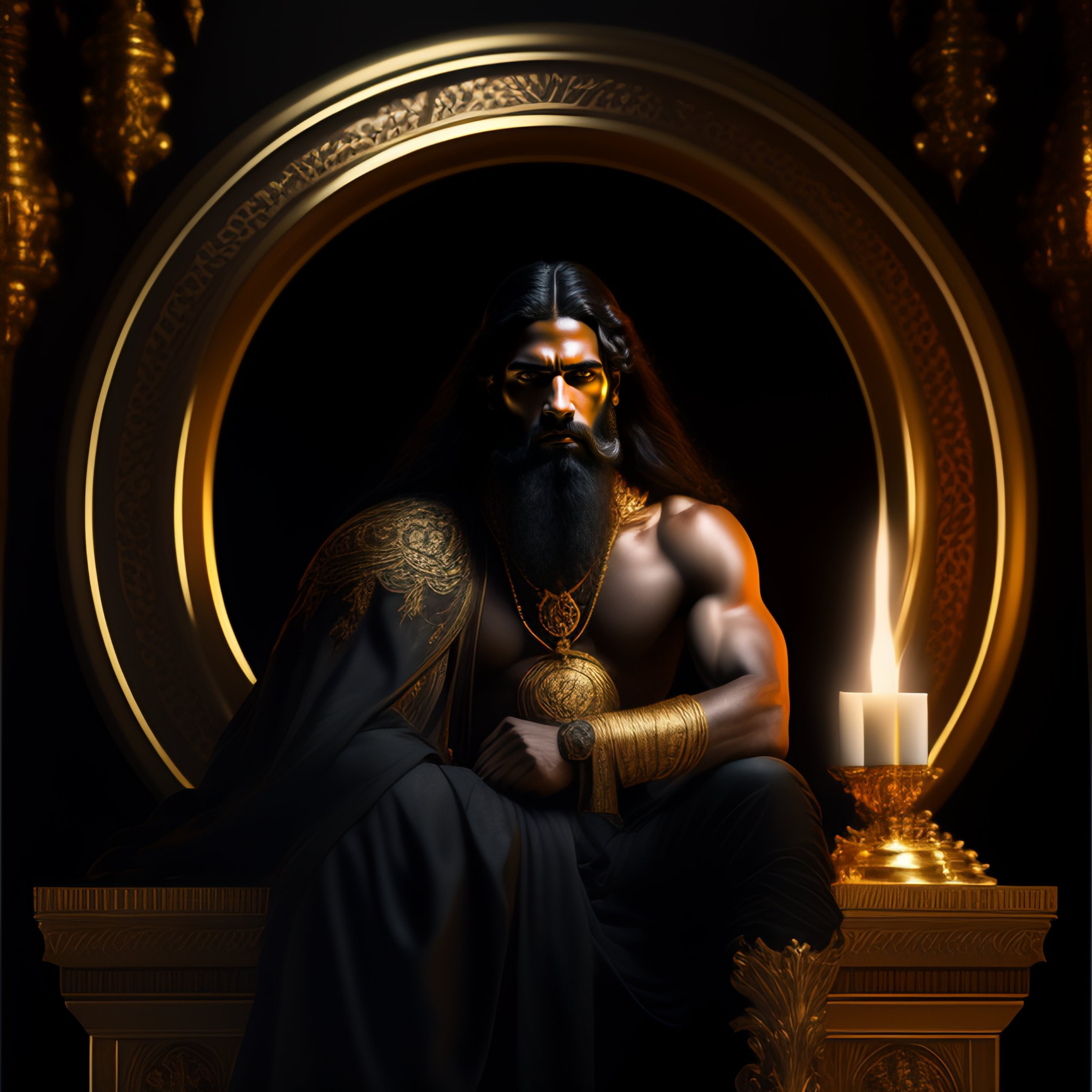 Perfectly detailed greek god hades surrounded by a shining and beautiful palace of gold, sitting on a throne of gold!! blessed by hell with physical perfection wise man with black beard, intricate and highly detailed dark painting, divine hellenic perfection. digital painting, art station, concept art, sharp soft focus, illustration, art by artgerm and greg rutkowski and alphonse mucha, dante scene, dark portrait. fire, death, skulls and bones, light dark, black clothing, elegant, greek man, light skin, greek art, renaissance, davinci, michelangelo, handsome