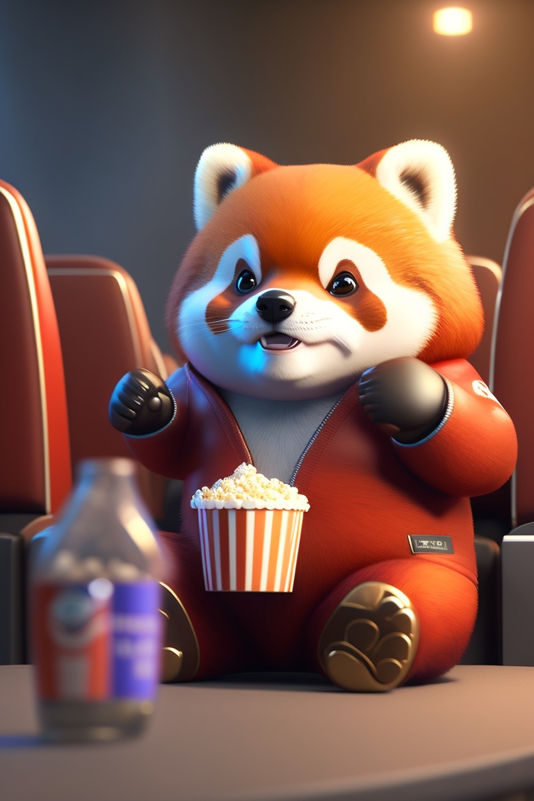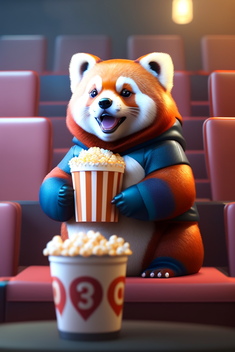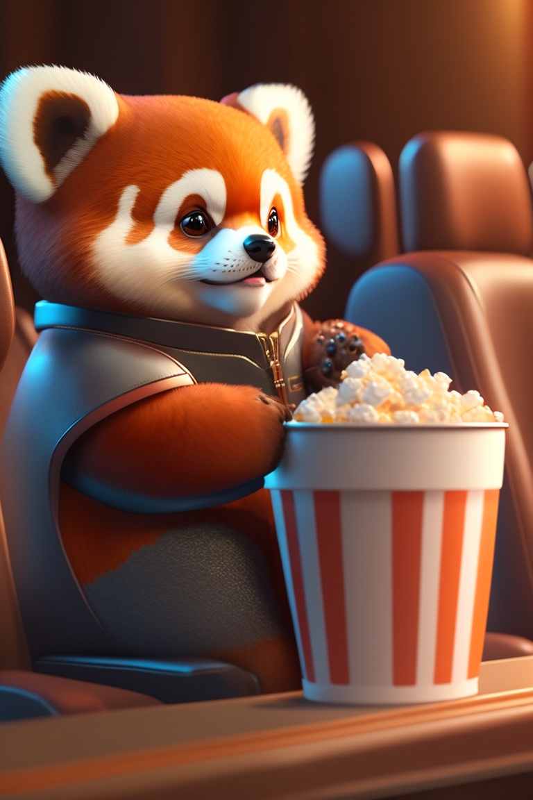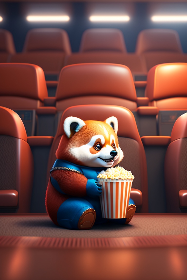 Cute small humanoid fat red panda sitting in a movie theater eating popcorn watching a movie, unreal engine, volumetric, warm indoor lighting, artstation, detailed, digital painting, cinematic, character design by hayao miyazaki, unreal 5, daz, hyperrealistic, octane renderer, arnold renderer, 8k, matte