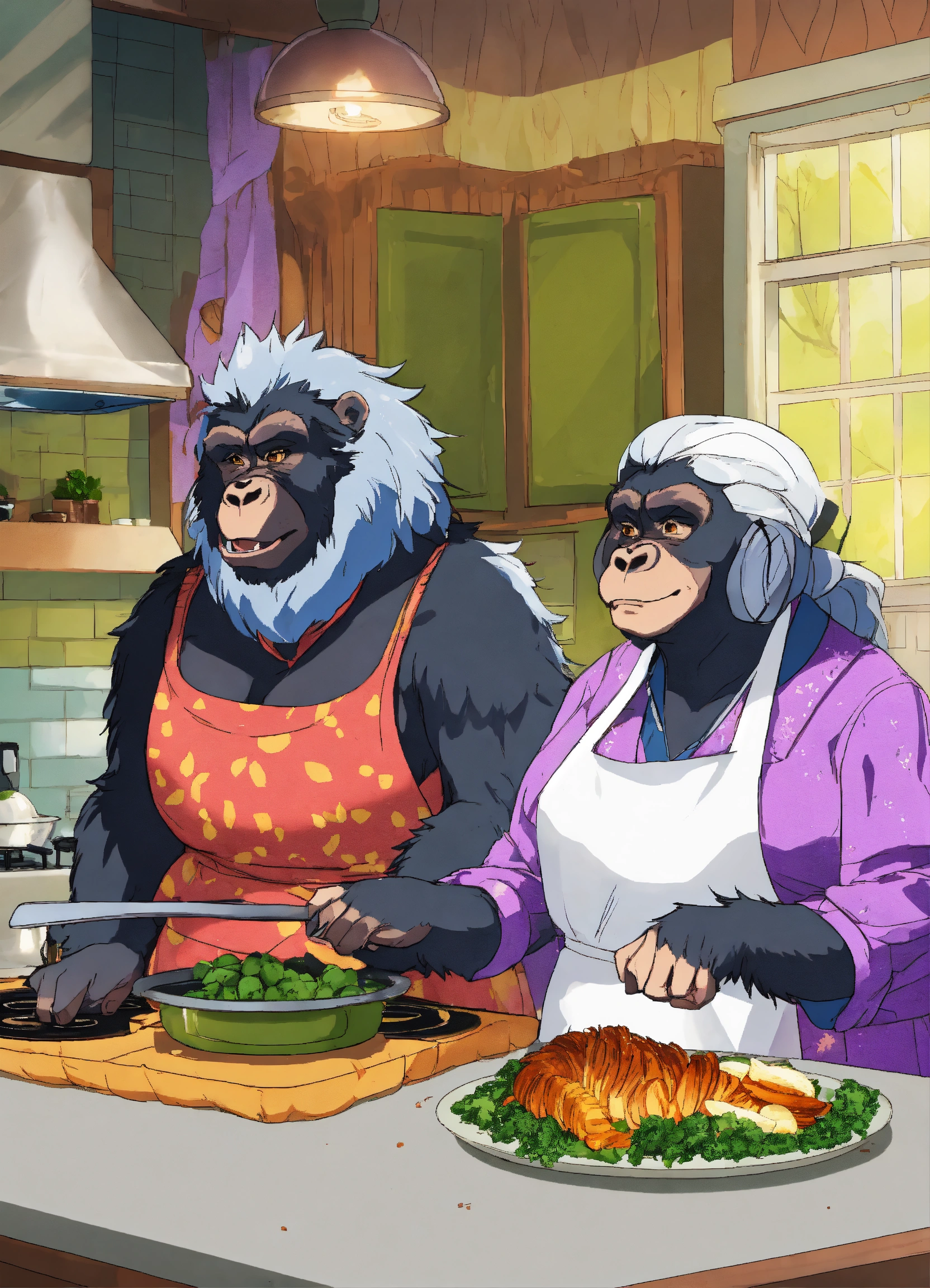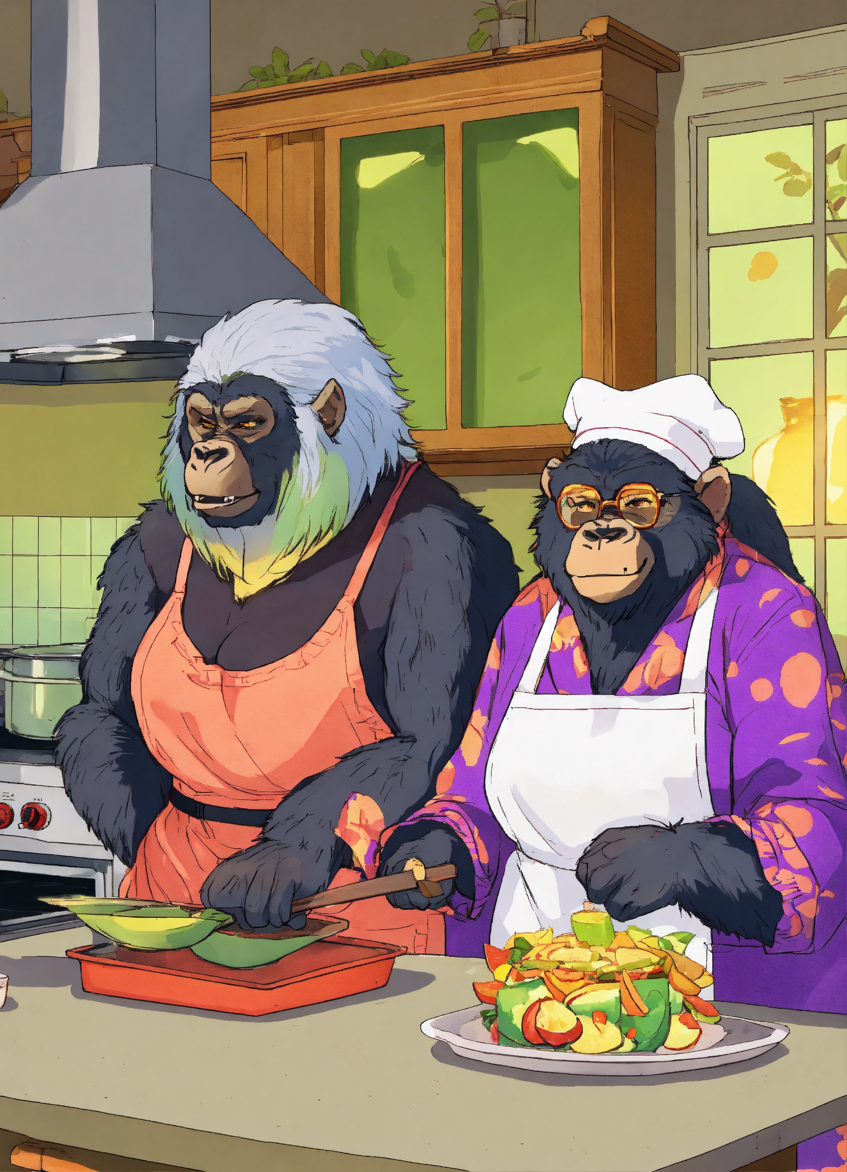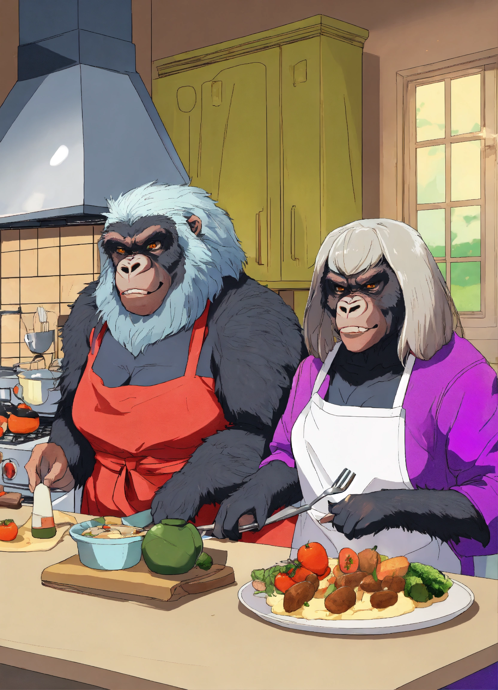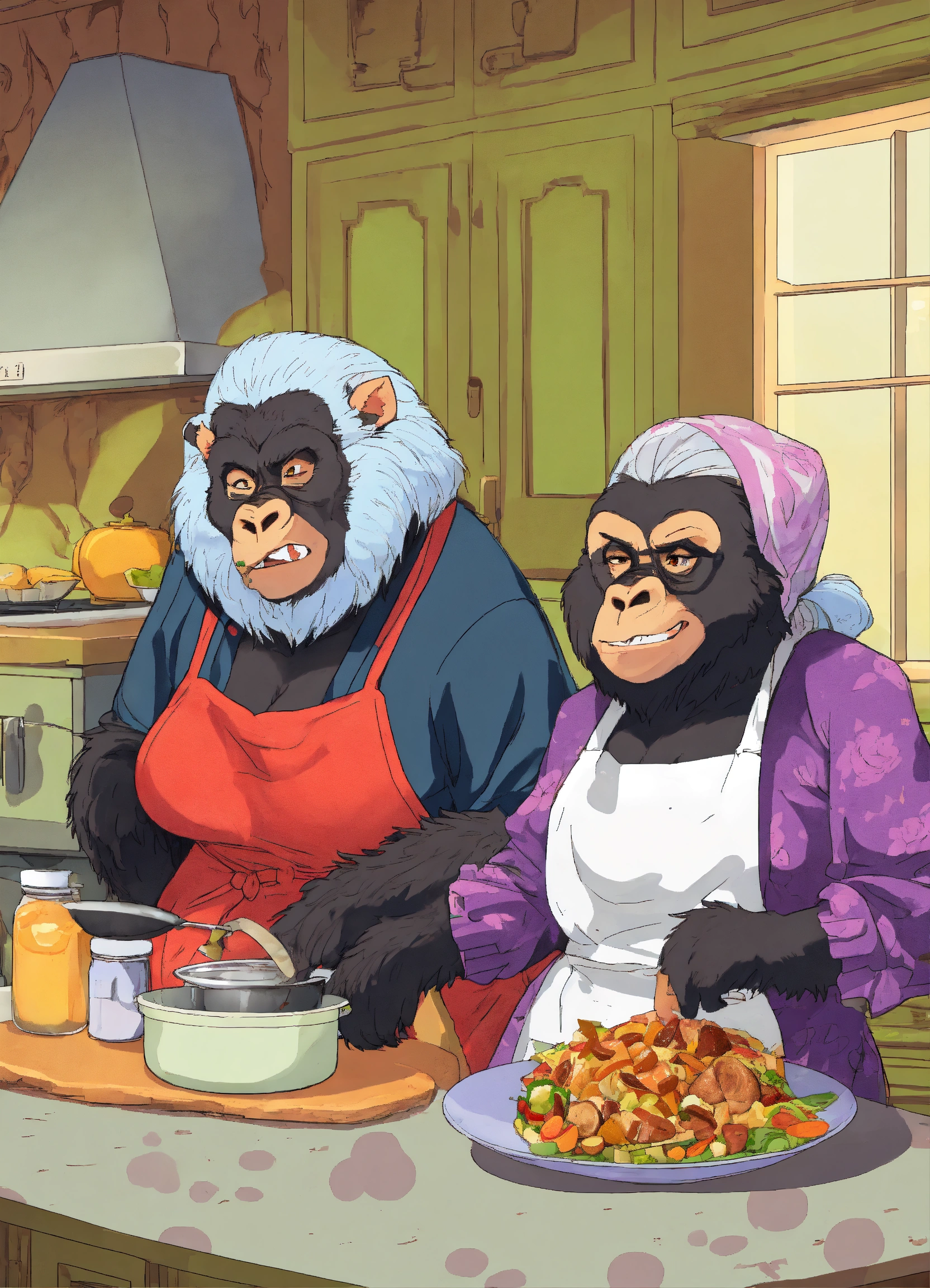Old lady gorilla and old lady werewolf cooking in a kitchen