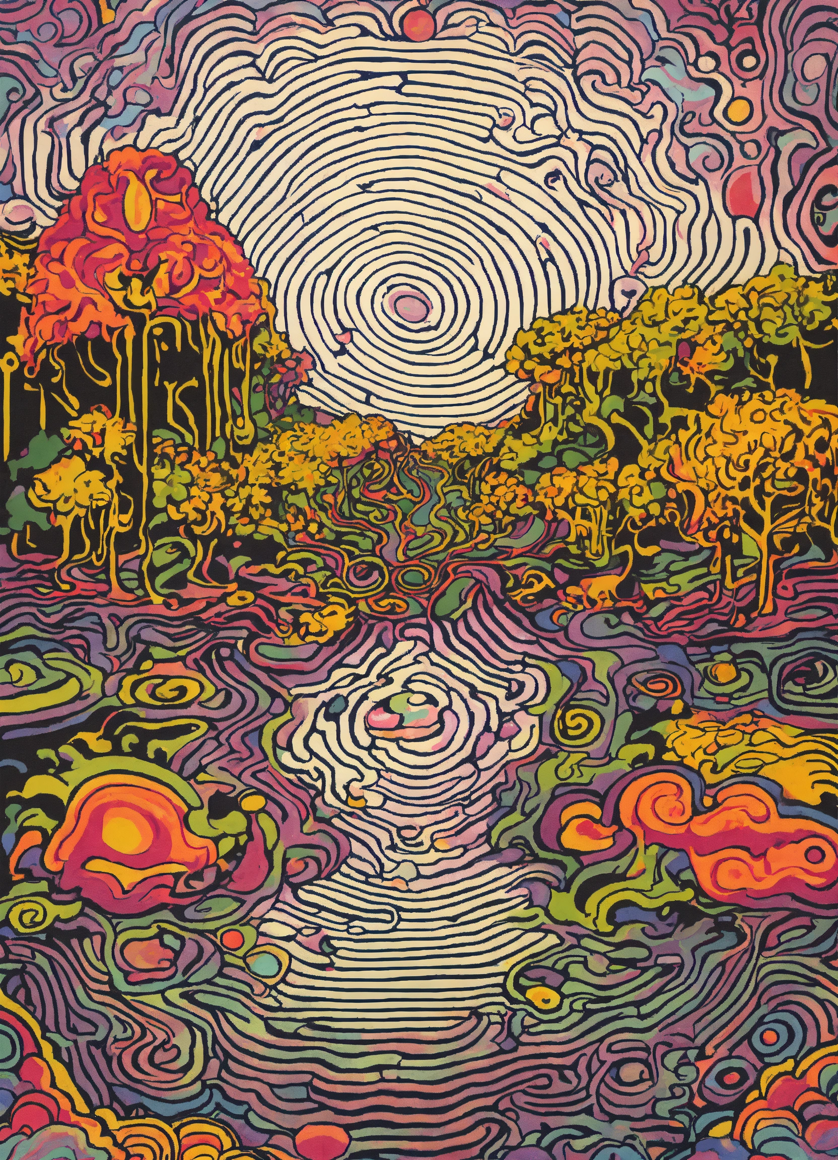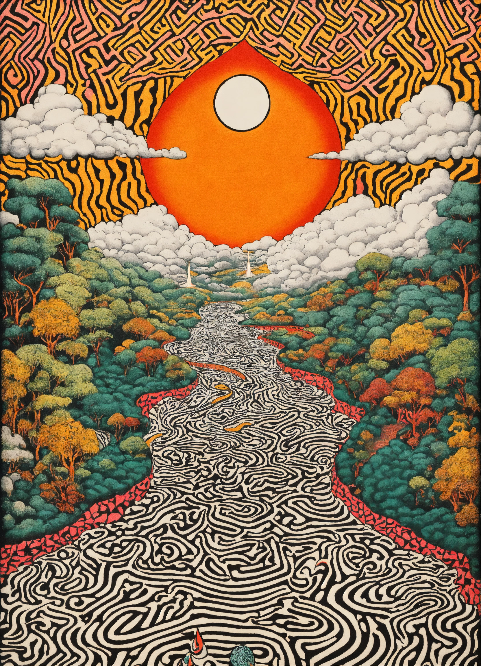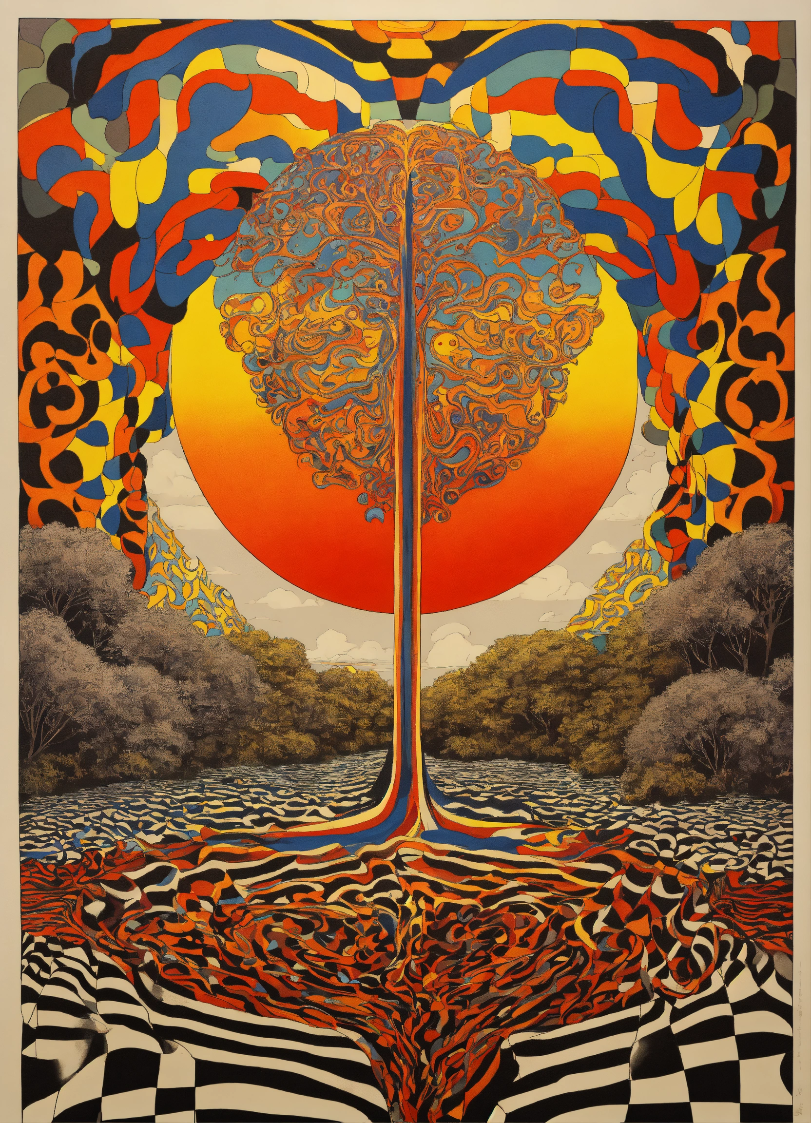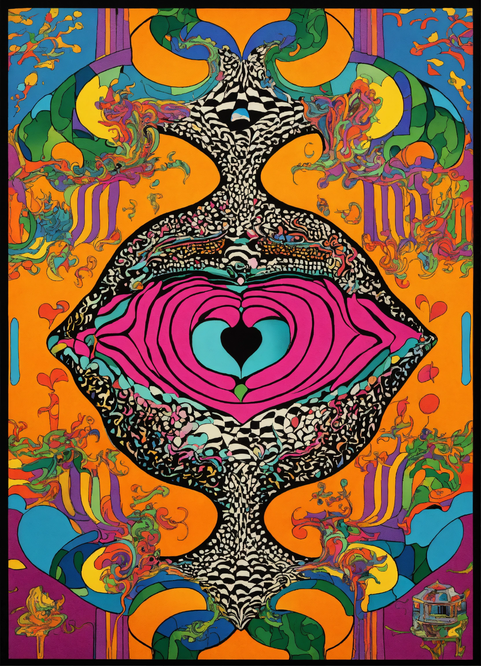 Janpanse groovy retro poster, human body containing god merging with love heart melting merging with oriental the most beautiful cosmos, human body containing abstract psychedelic vortex by keith haring, human body containing symmetrical grid patterns, psychedelic mount melting eyeball merging into dripping love-heart by coogi pattern mount, 5d outline, wavy dream dimension mount frame, chevron florescent geometrical clouds dripping, dense jungle melting into floor, black and white checkerboard patterns dripping by maurits cornelis escher