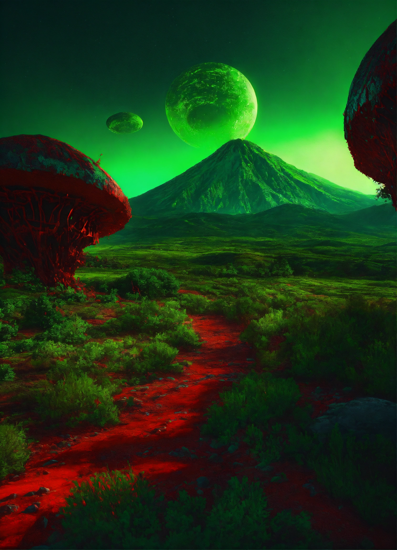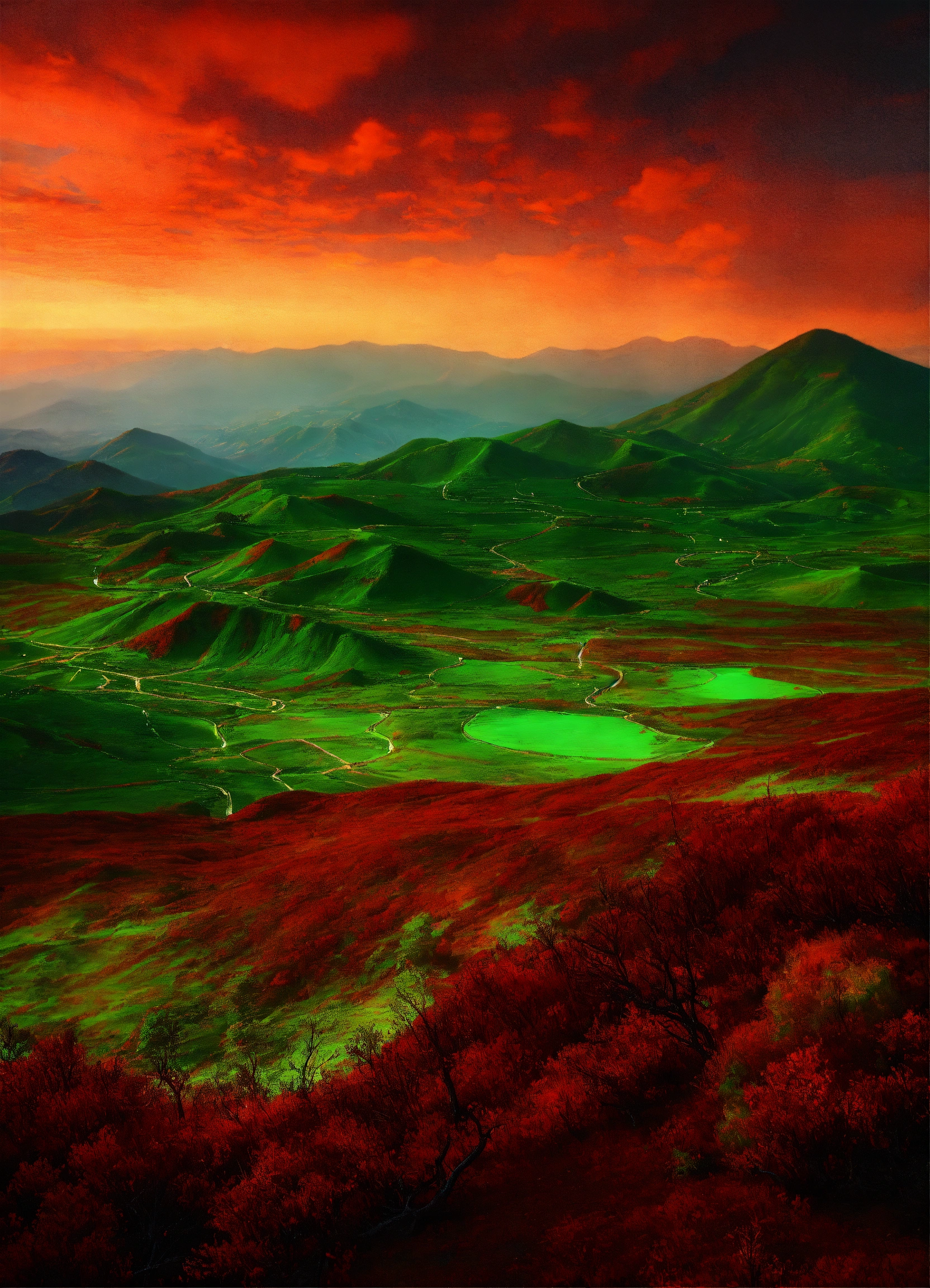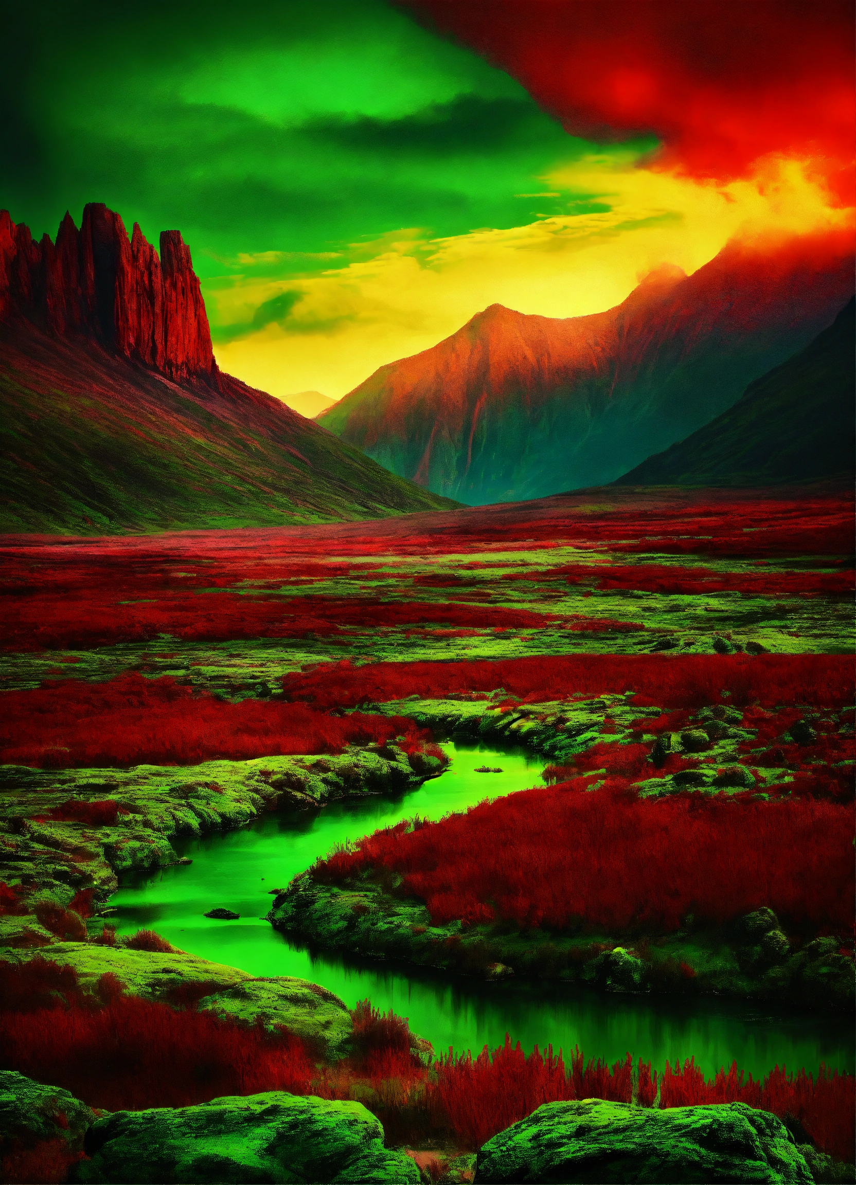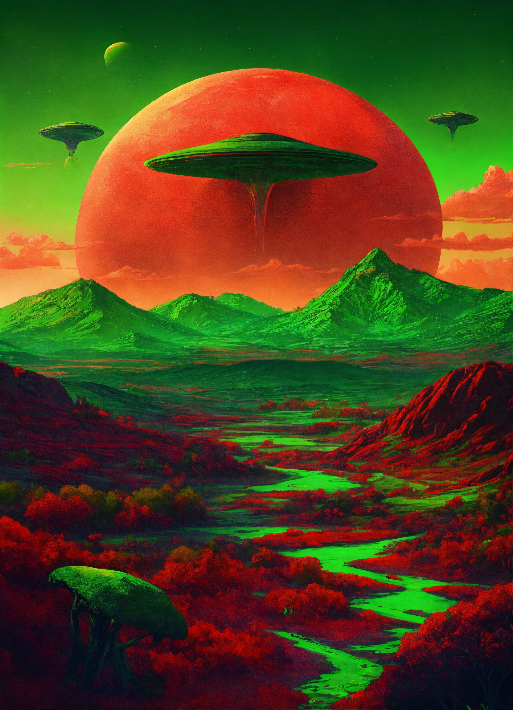 Un lindo paisaje de montaña con color de terror que esta relacionado con aliens, tipo de arte, color de verde como venenoso y rojo de sangre