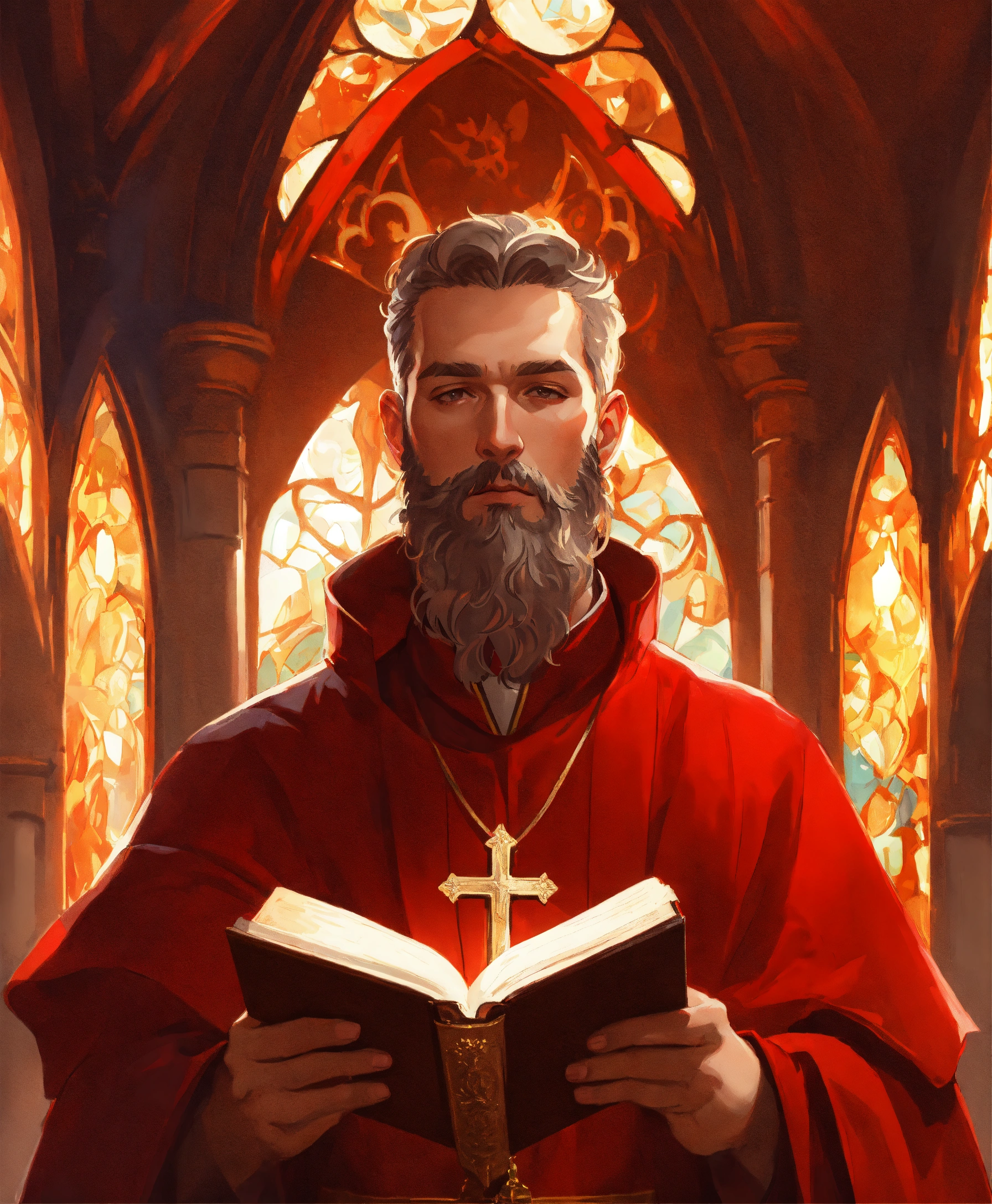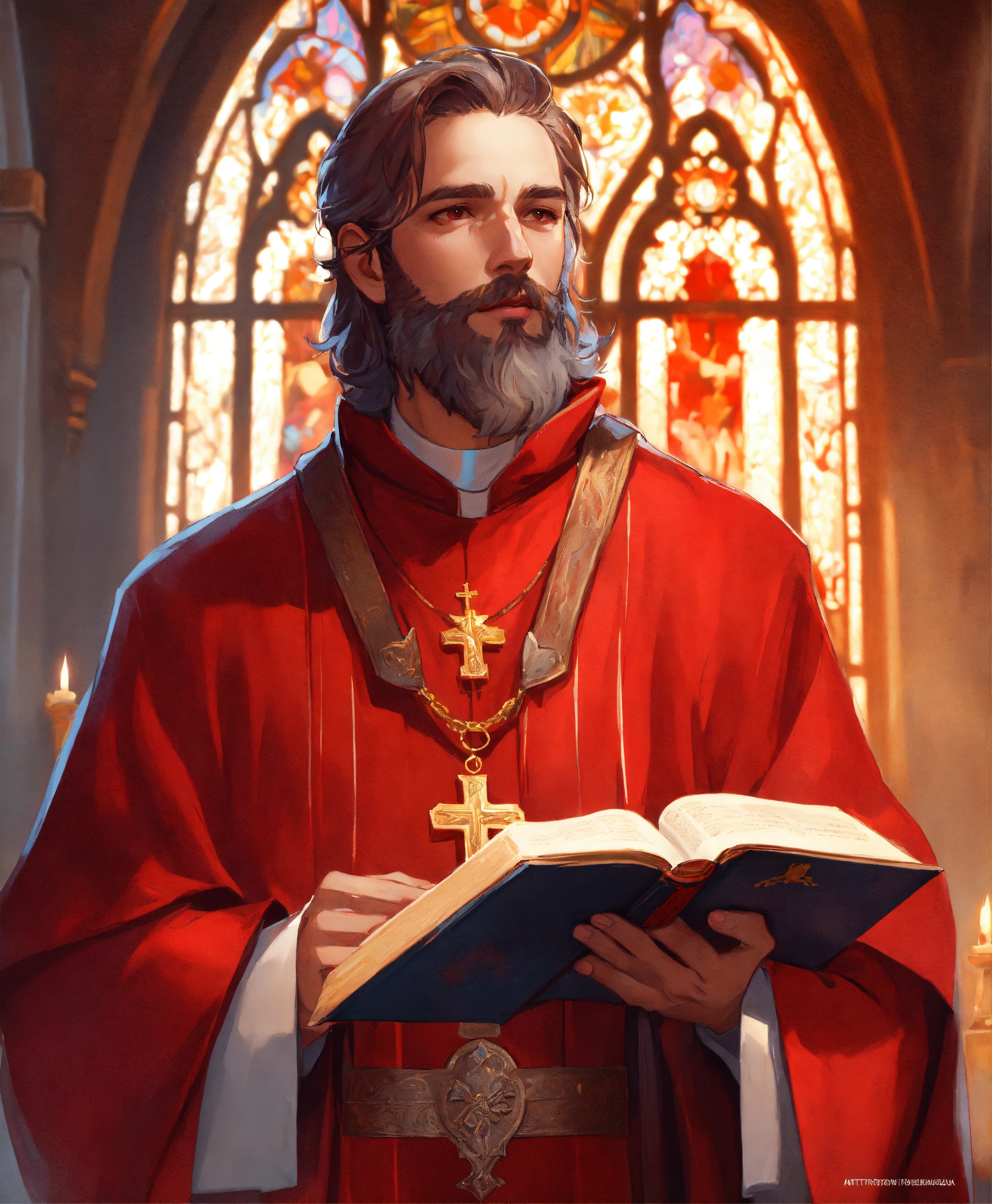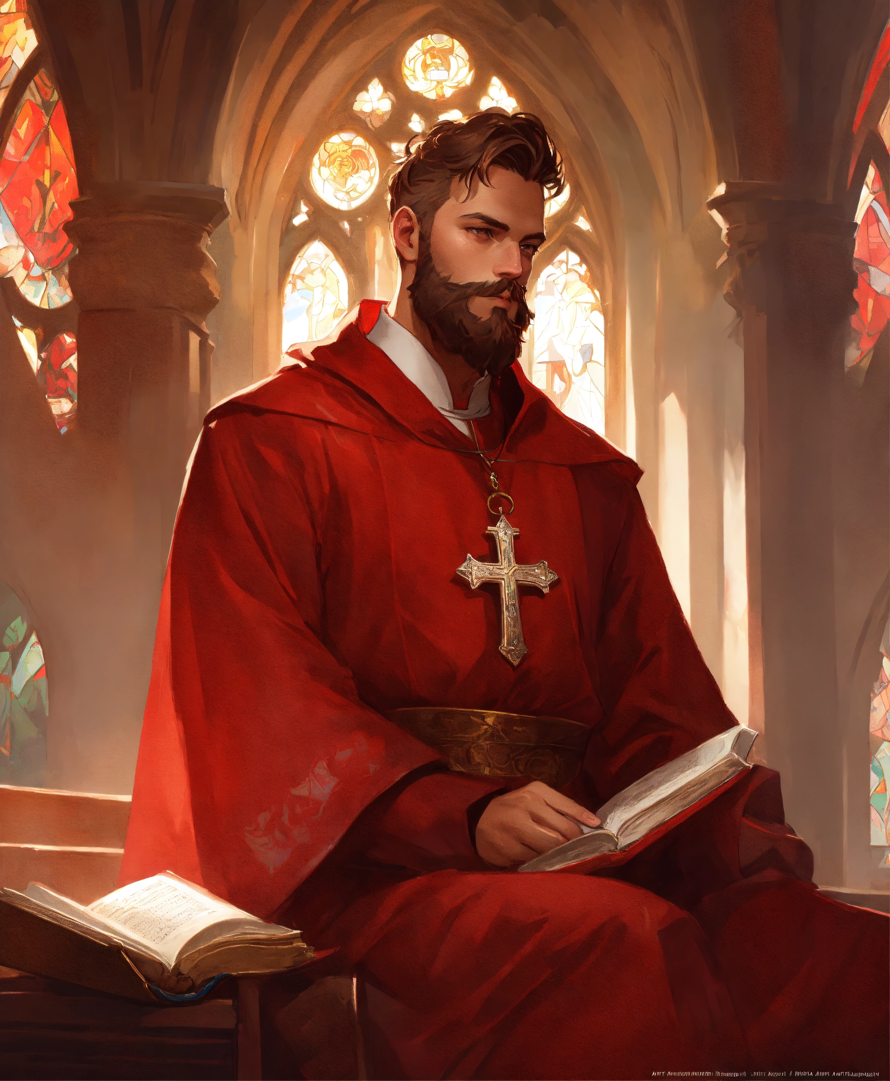 Male priest ith beard medieval in church red clothes with bible art by artgerm and greg rutkowski and alphonse mucha and loish and wlop, artstation, illustration