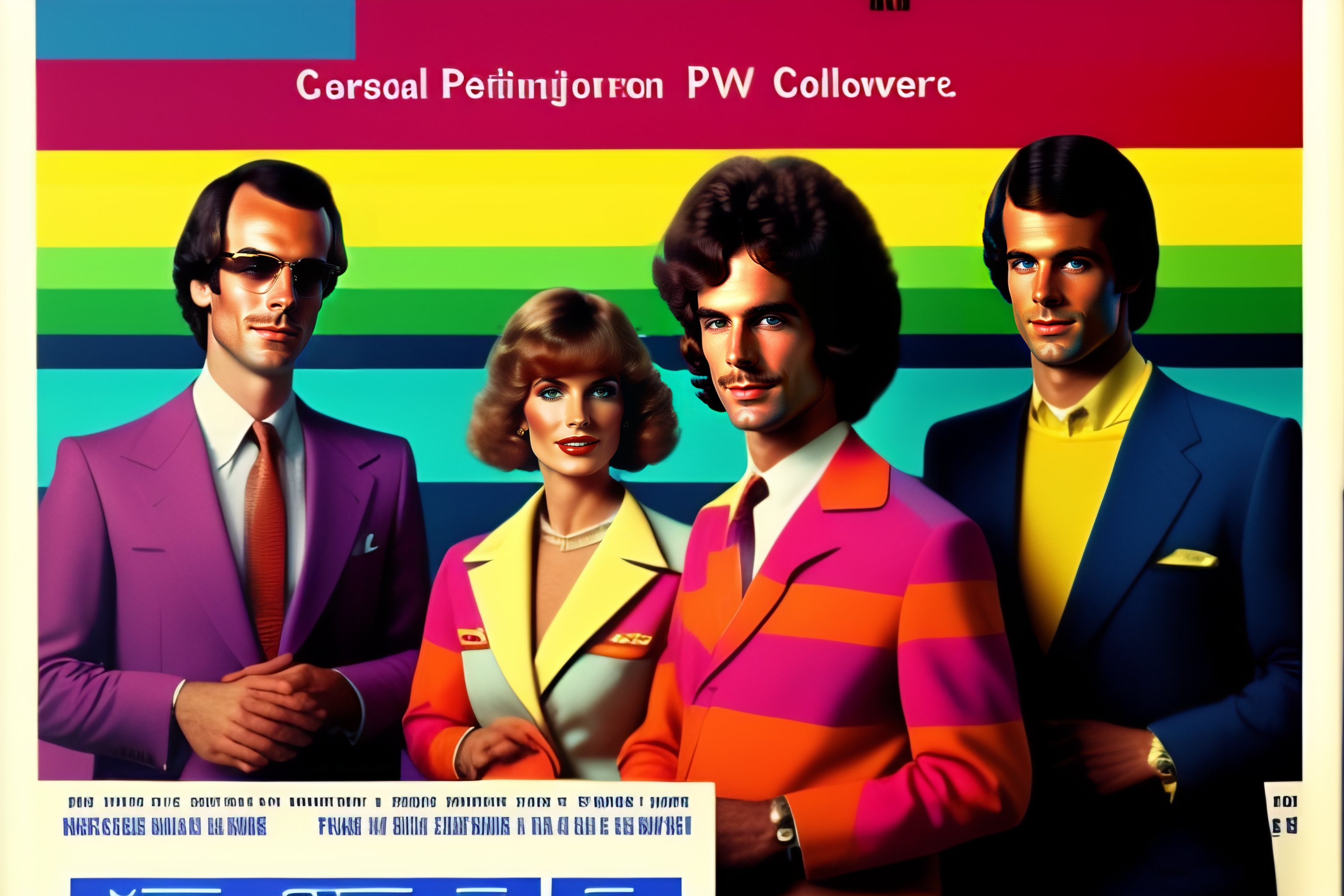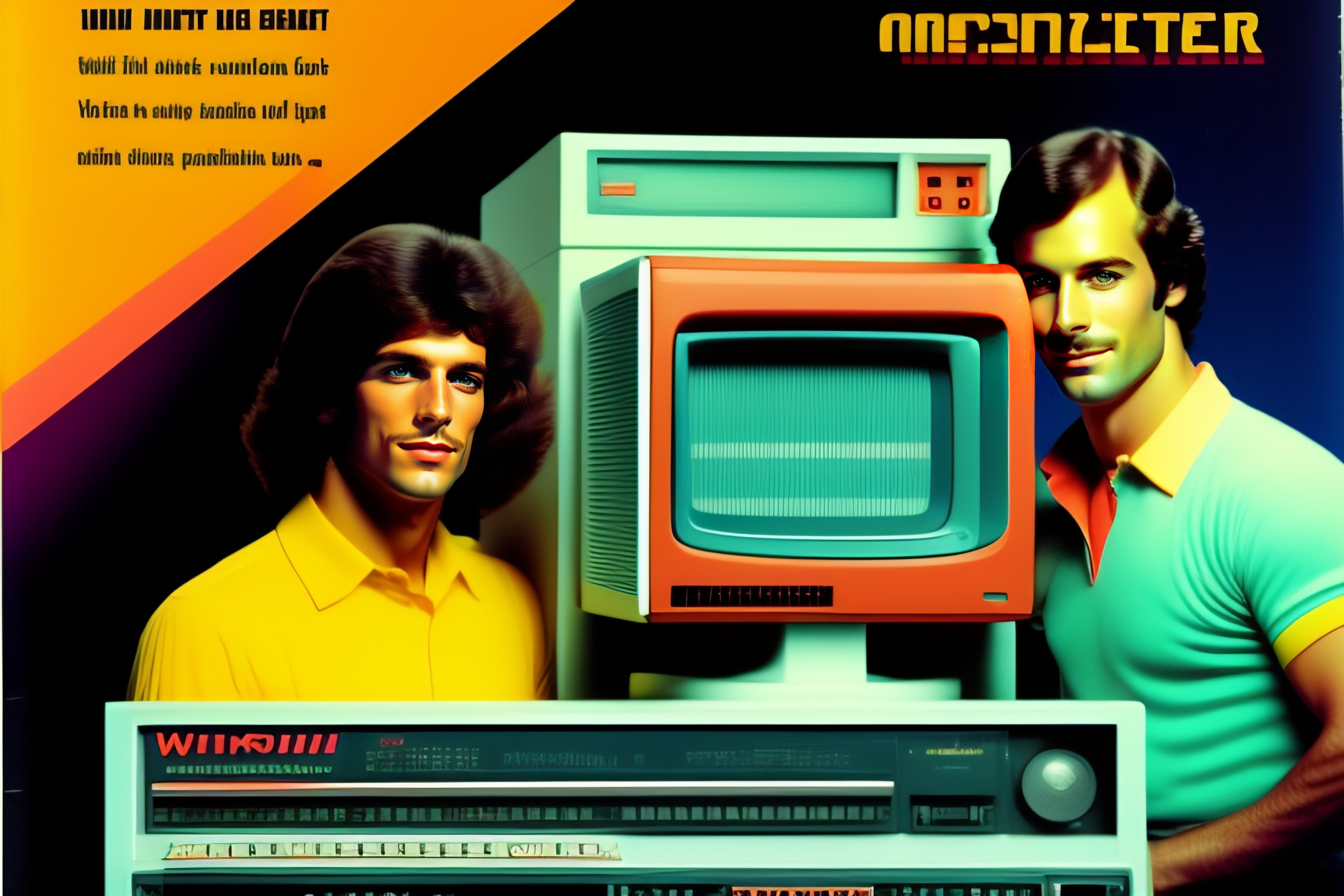 Full - color 1980's magazine advertisement for a retro software company, whit hipster programers and retro computers, strong colors