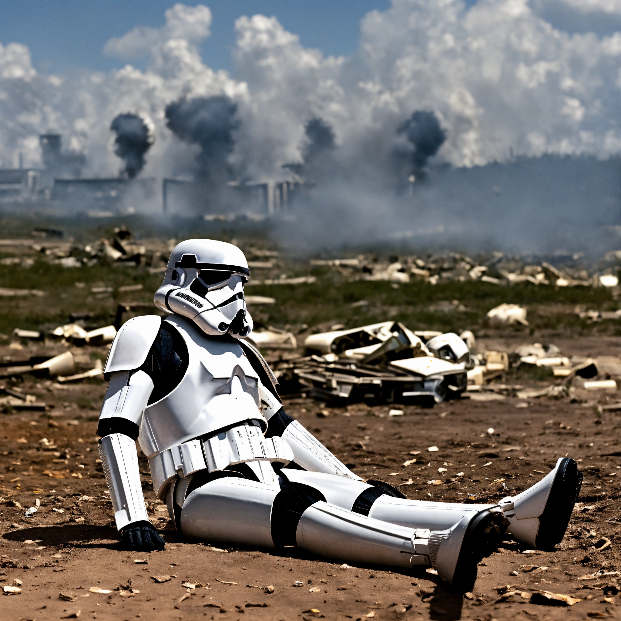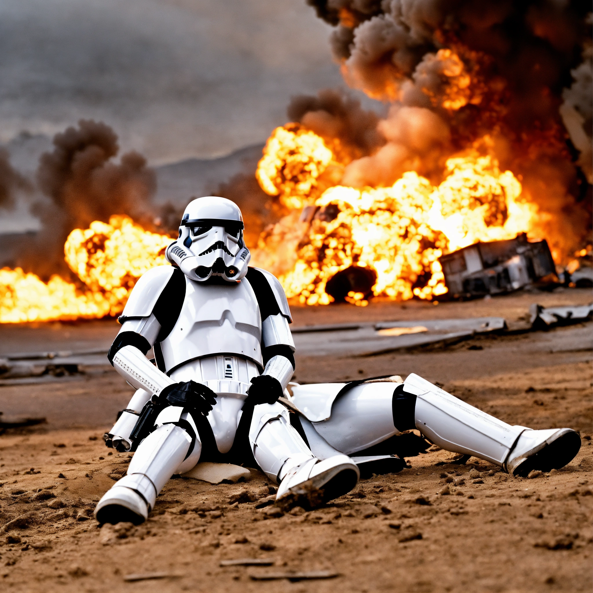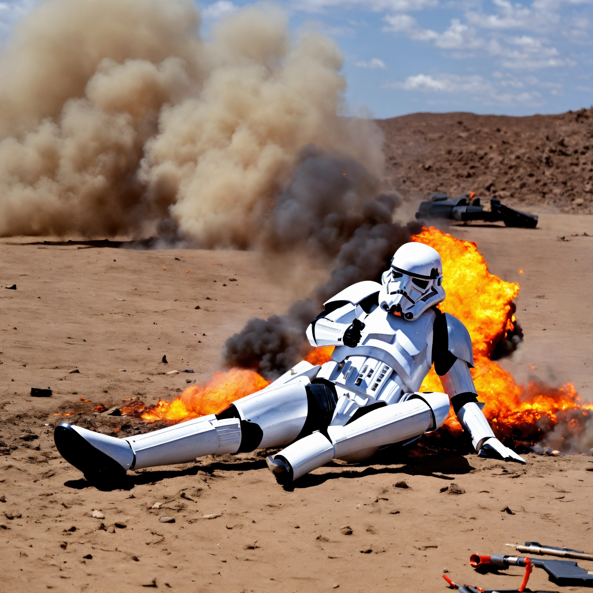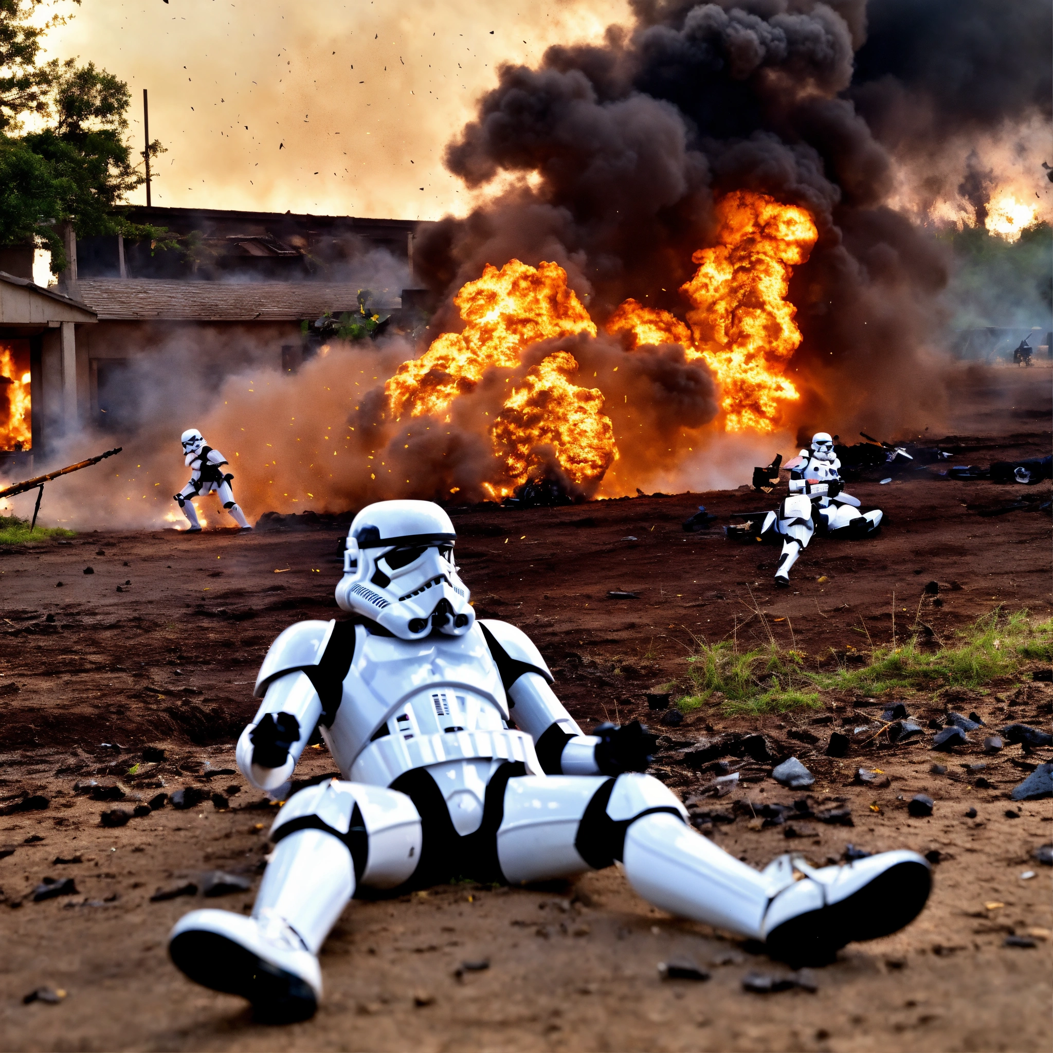 Stromtrooper on the ground helped by another stromtrooper explosion