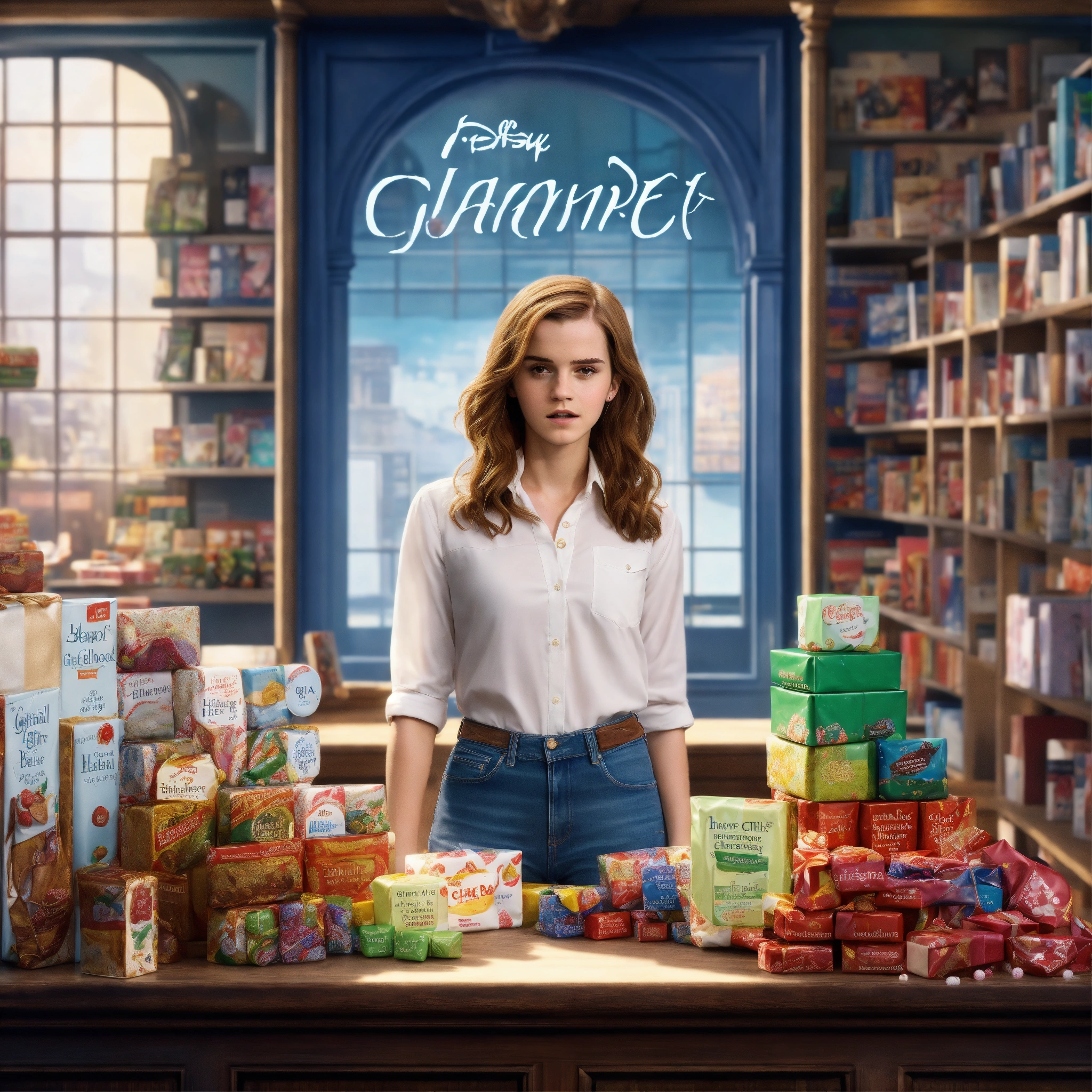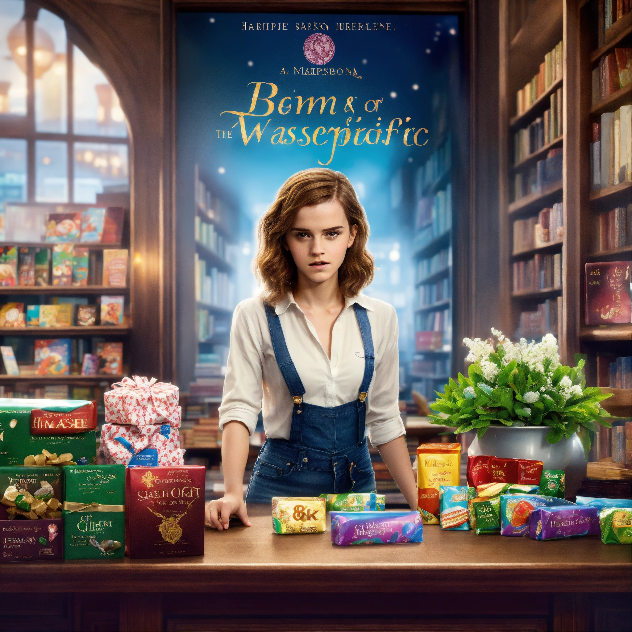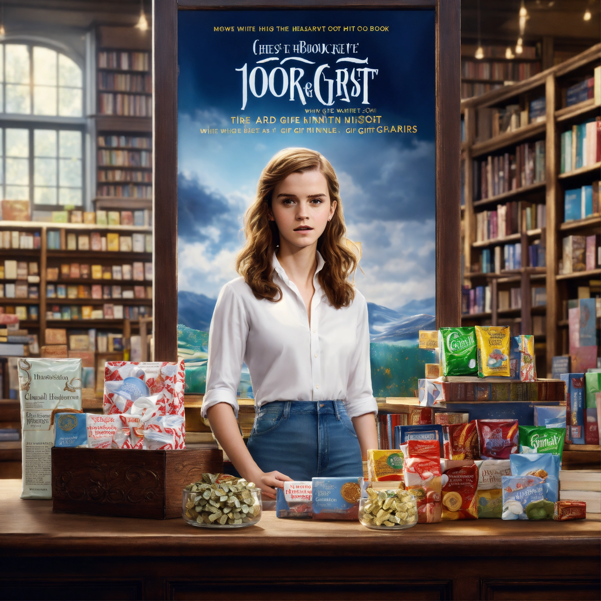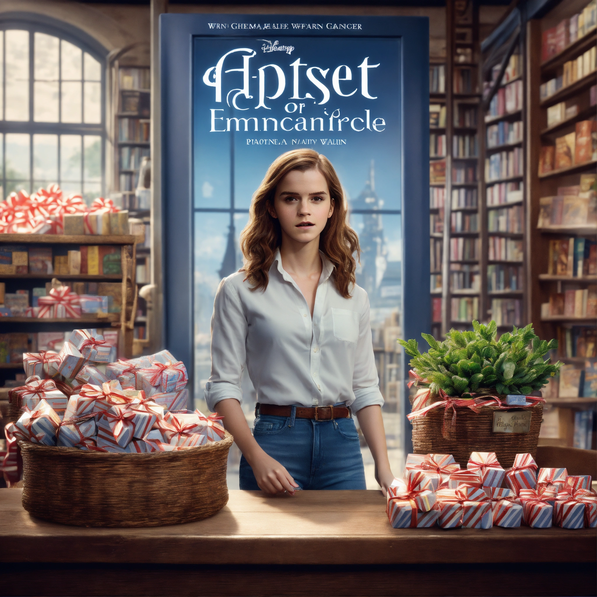 Masterpiece, highest quality, emma watson as hermione granger in white shirt and blue jeans in a bookshop behind a checkout counter with bowl of mints and gift wrapping. 8k resolution. digital art, high quality, realistic.