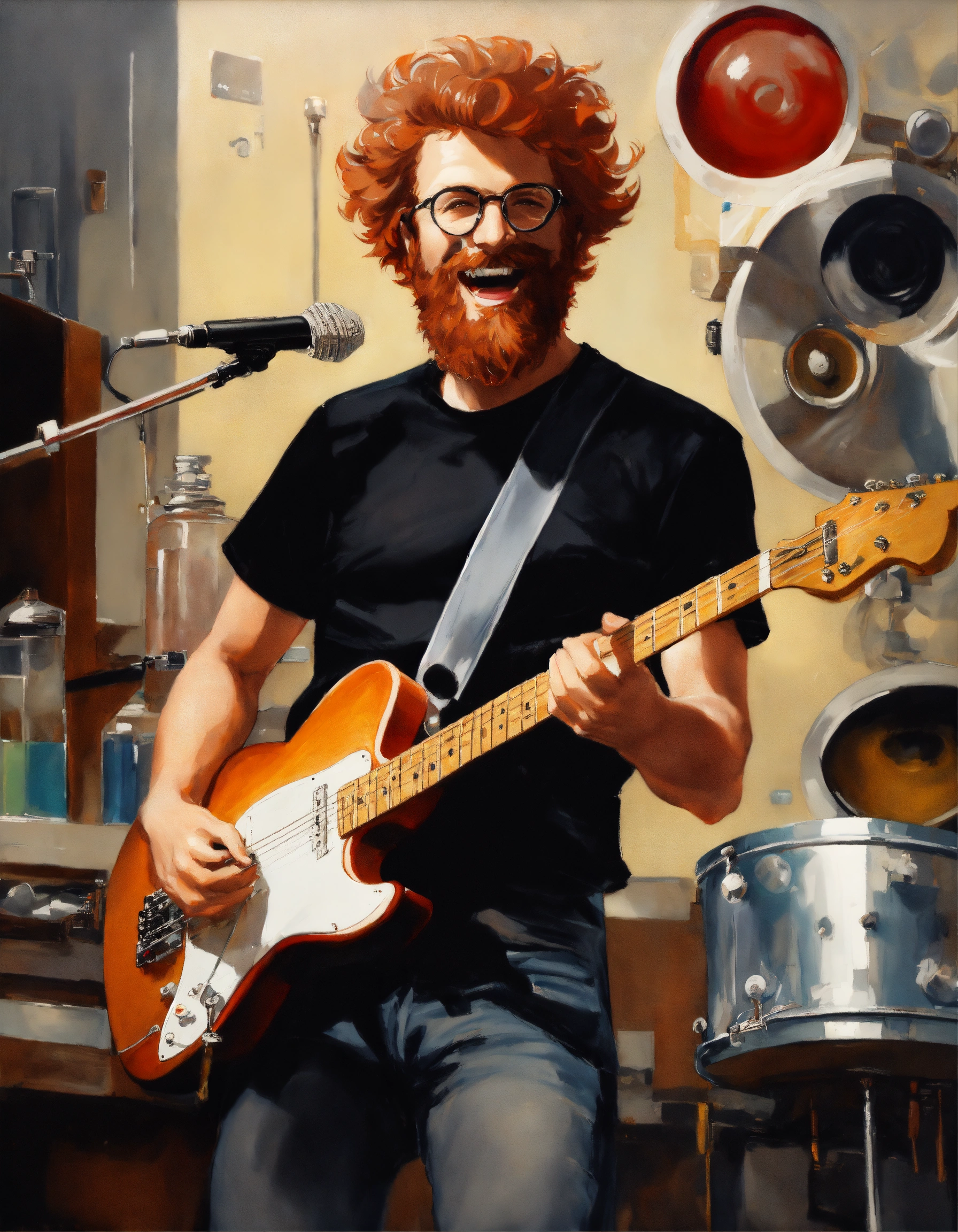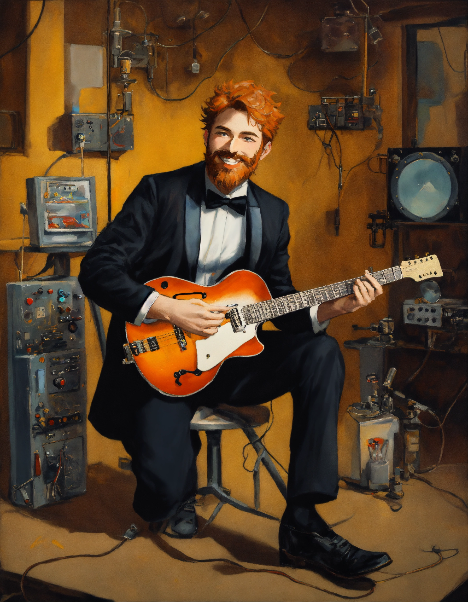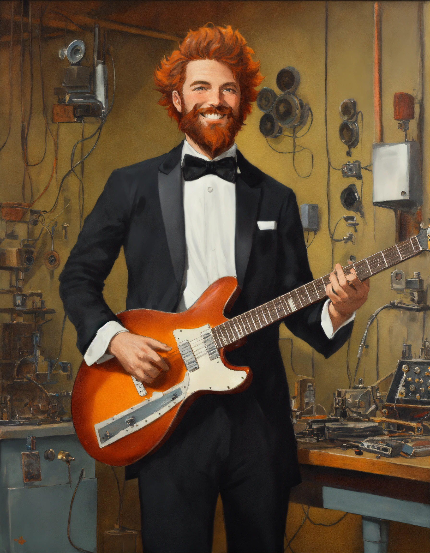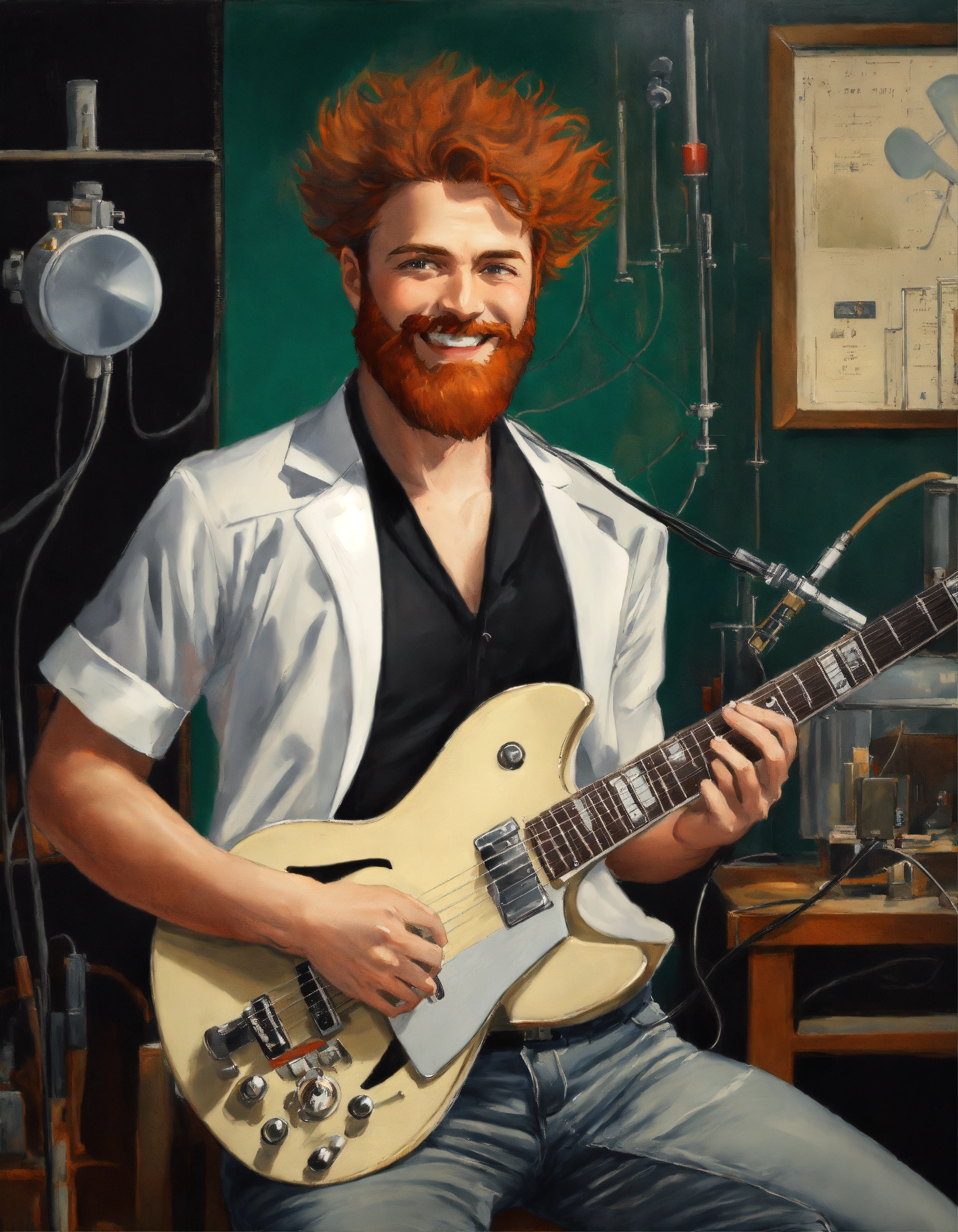 Caucasian mad scientist with gray high and tight short reddish hair and beard, smiling like crazy. he is wearing a ((black t-shirt featuring a little white tuxedo printed on front)). he is also wearing short denim pants. he is holding an electric guitar, in an old laboratory with music equipment, oil painting