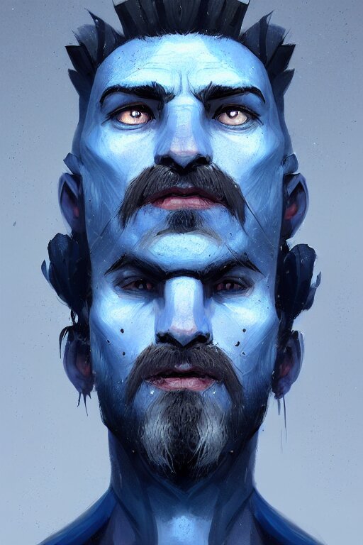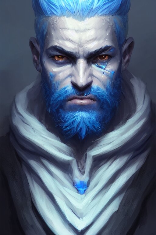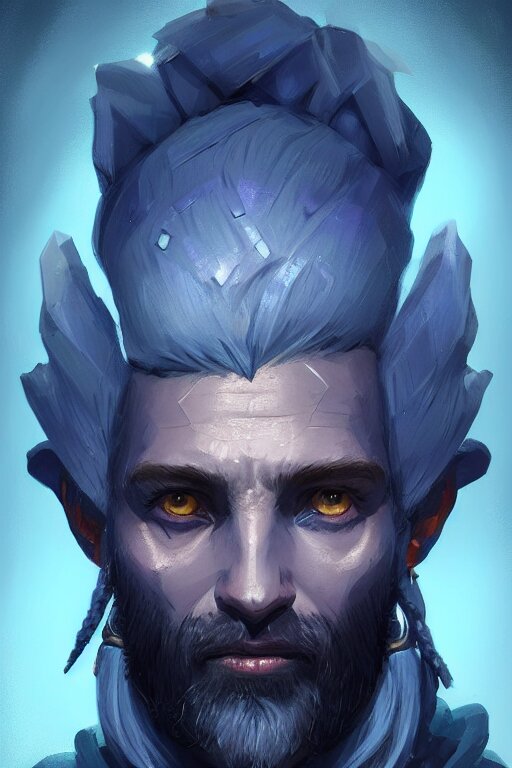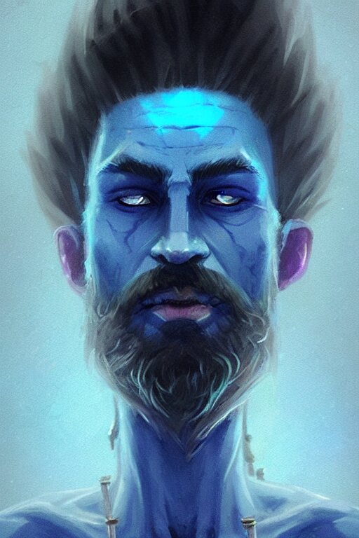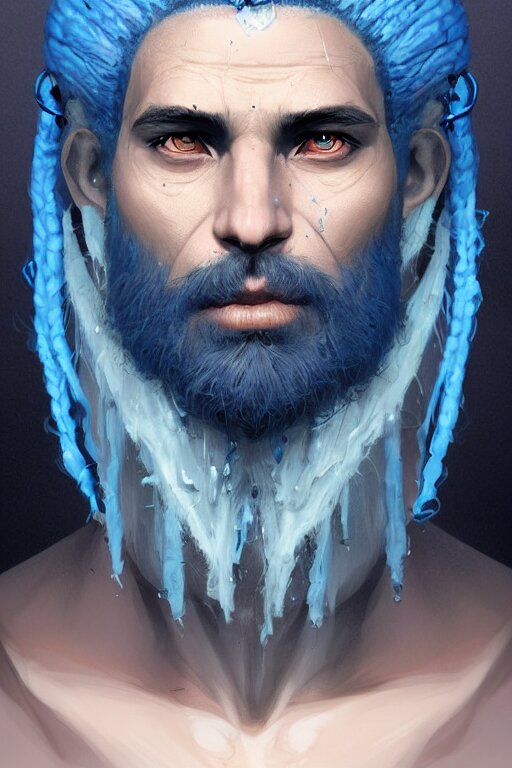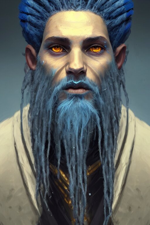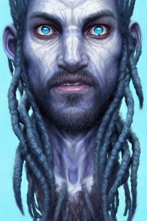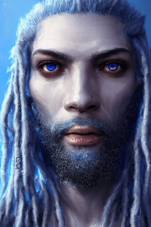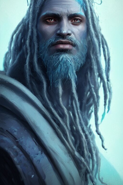 Portrait of a blue skin genasi with a square jaw from d & d by greg rutkowski, dreadlocks and small beard, tempest priest, runic rings, d & d character, blue, black background, highly detailed portrait, digital painting, artstation, concept art, smooth, sharp foccus ilustration, artstation hq