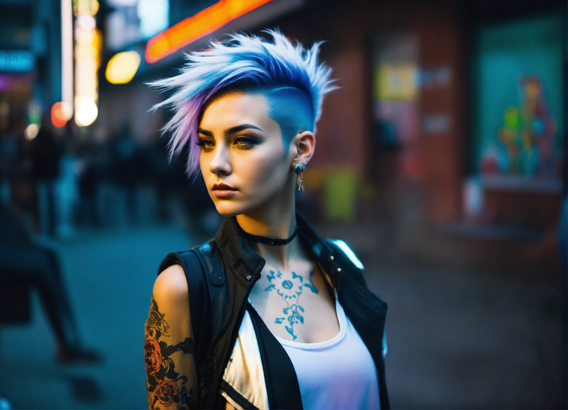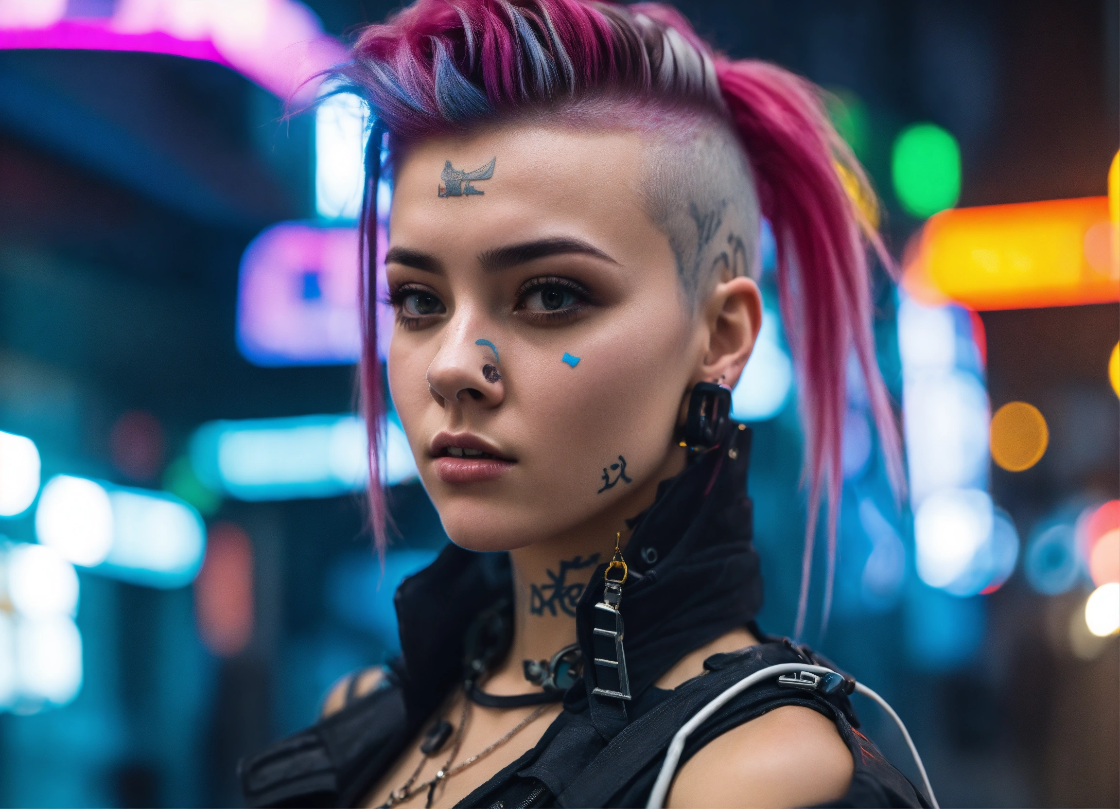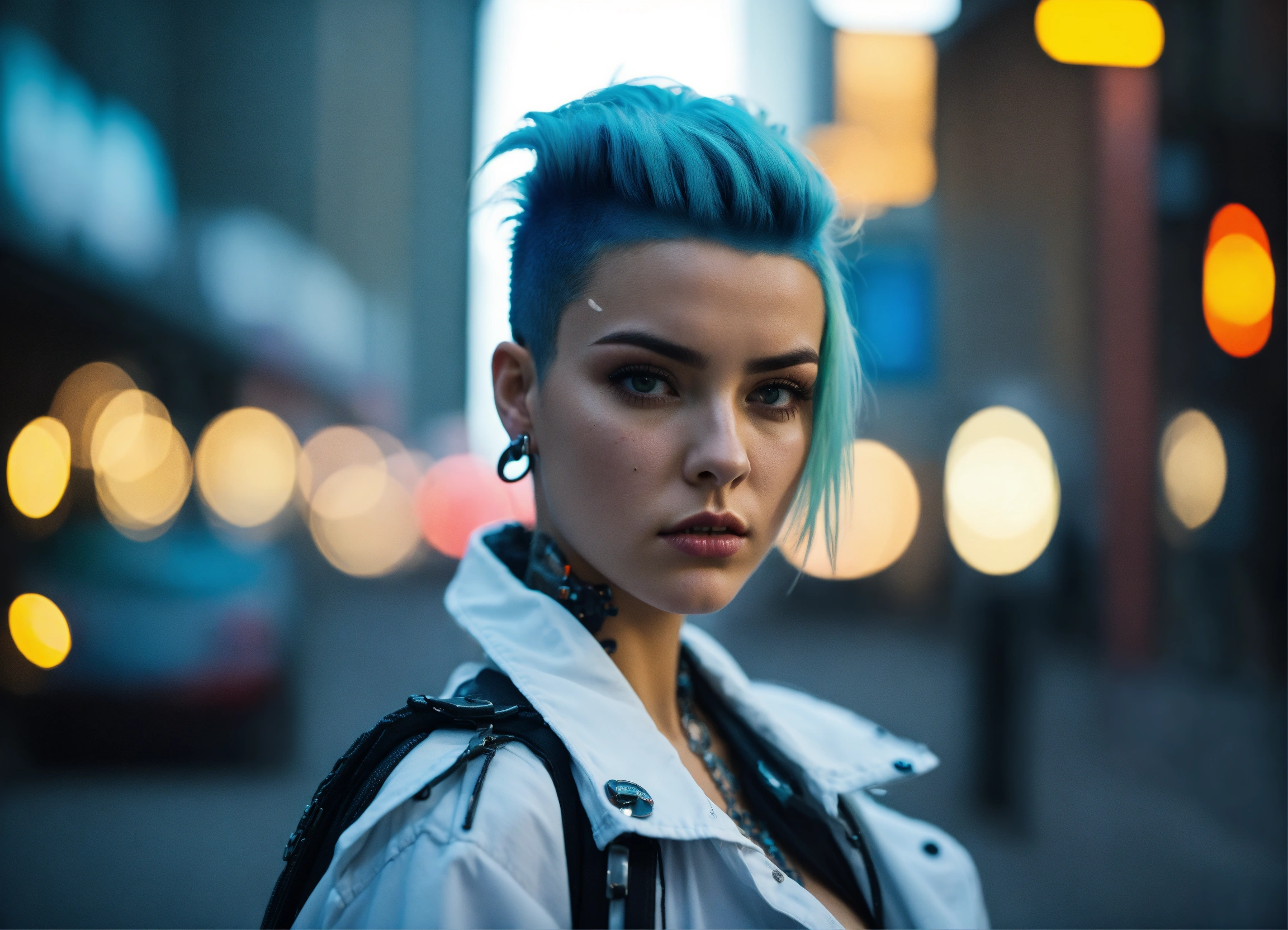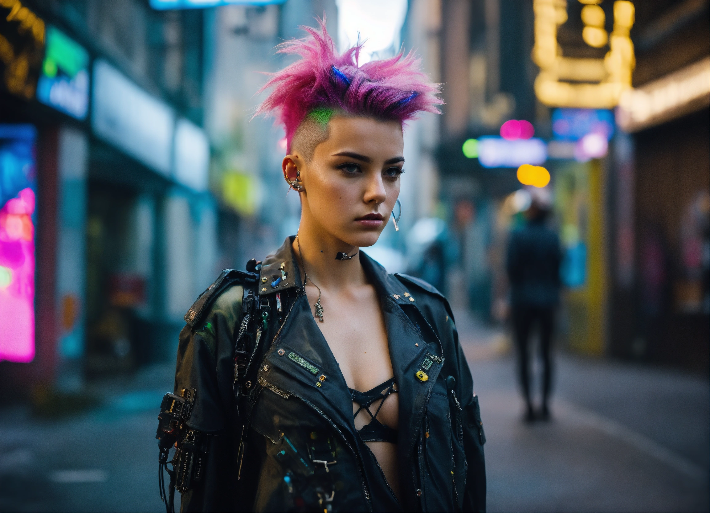 4k photo selfie of 25 year old punk girl looks like a cyberpunk girl mech suit open shirt ally street white looking bored mowhawk