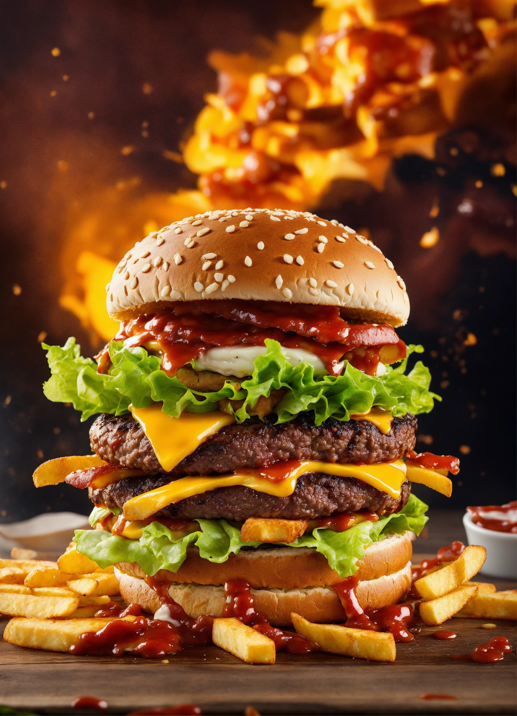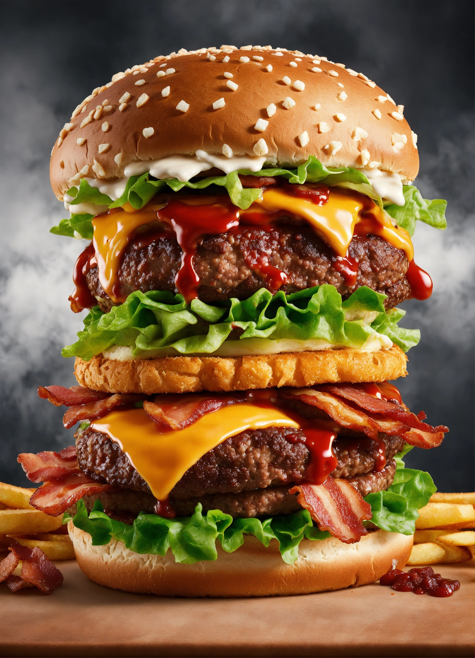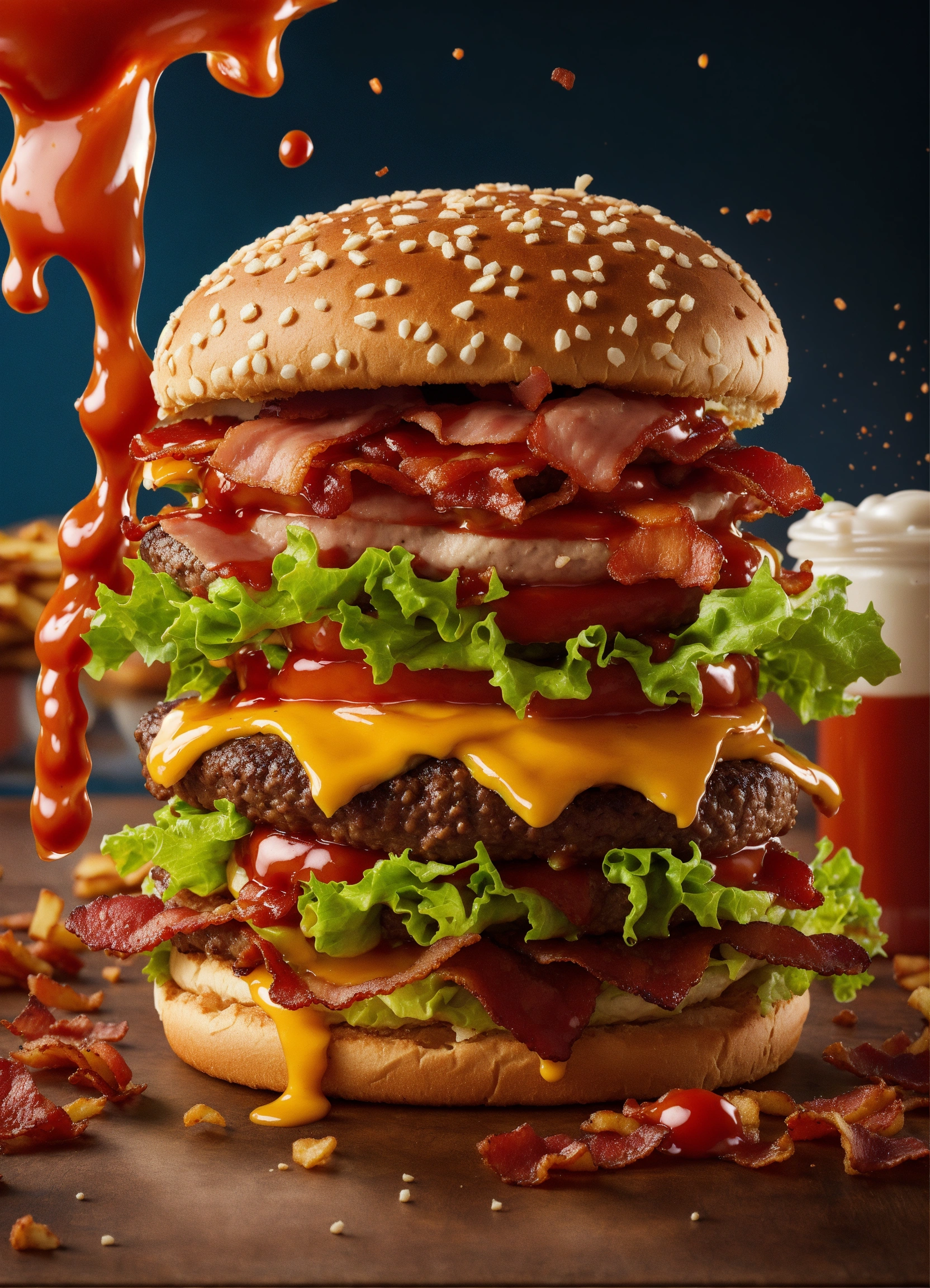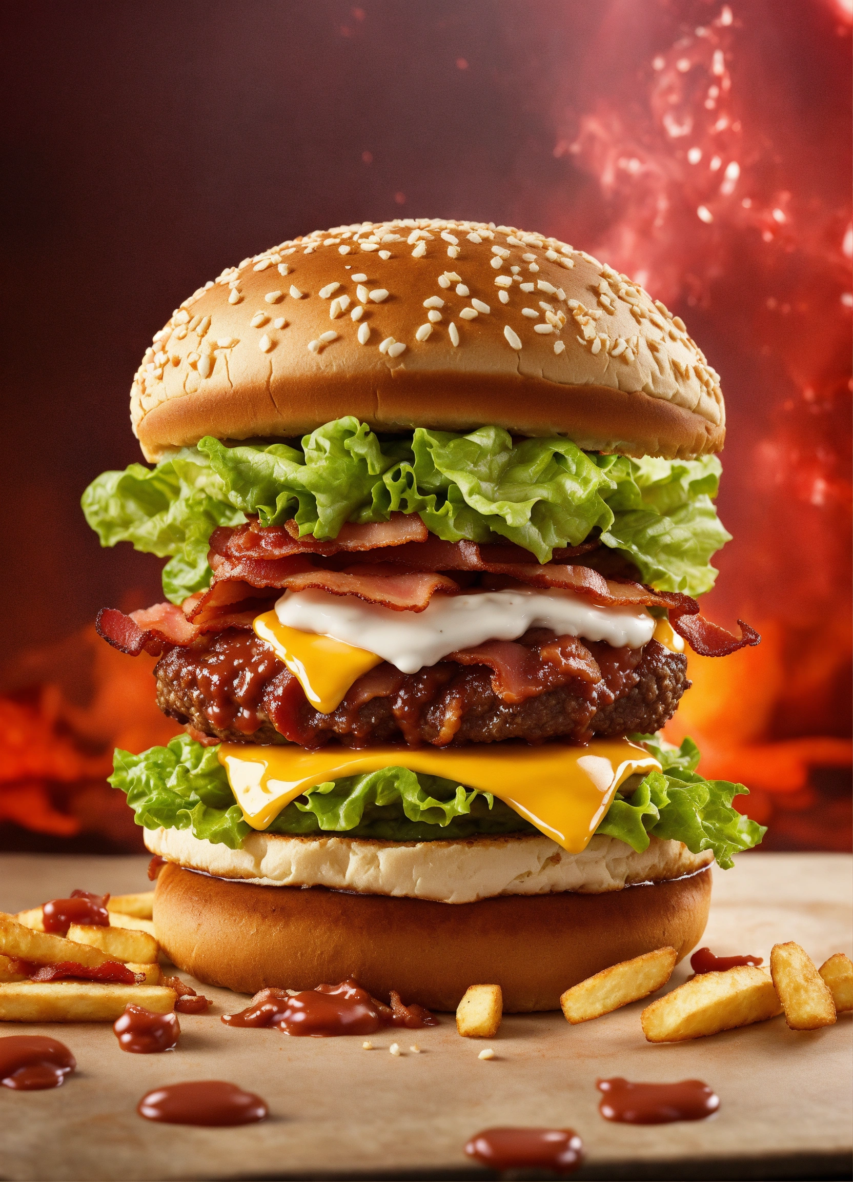 A perfect mashup hamburger made out of ketchup, fries and bacon explosion, surreal, product photography for the brand burger king and mc donald’s