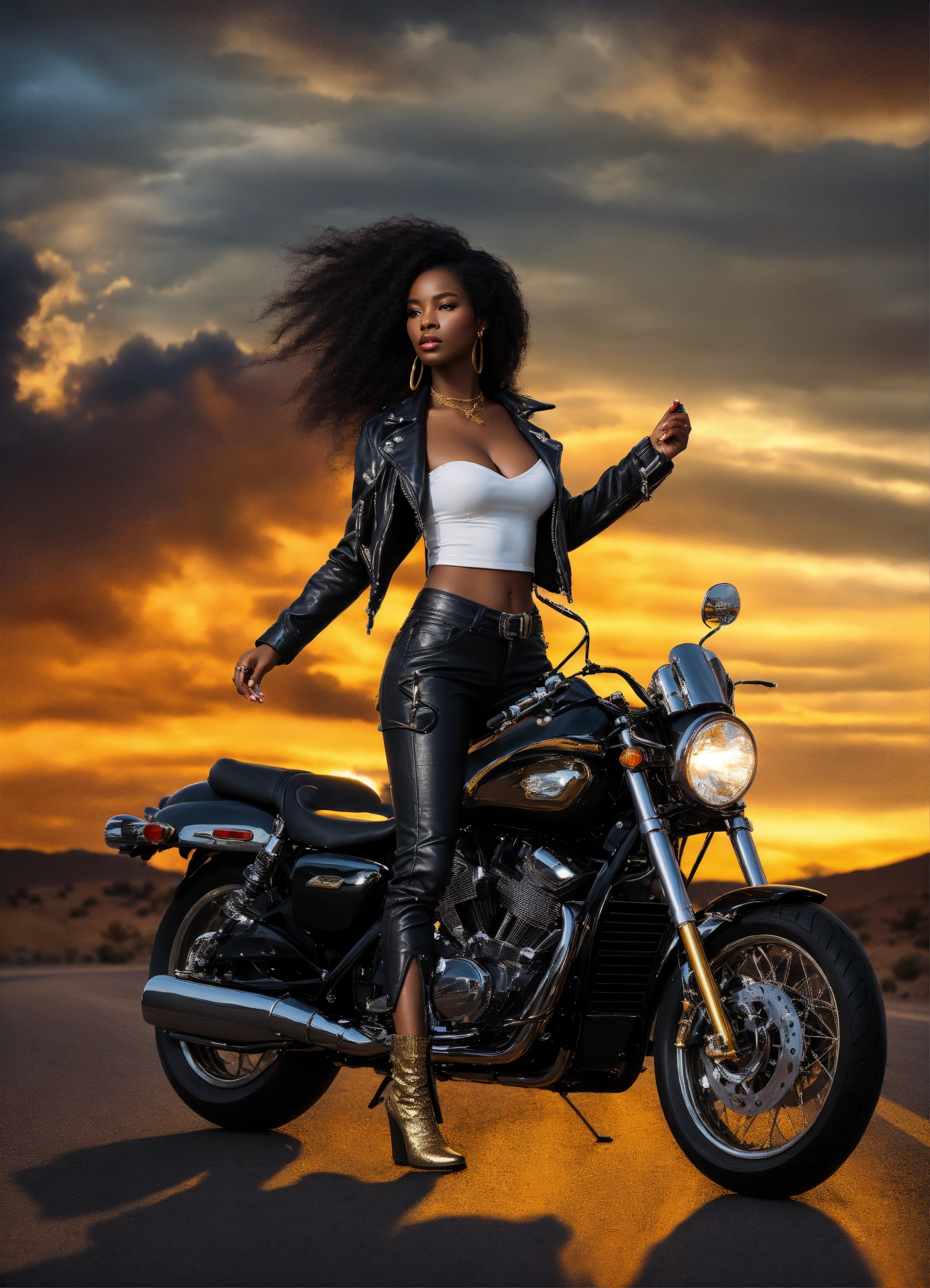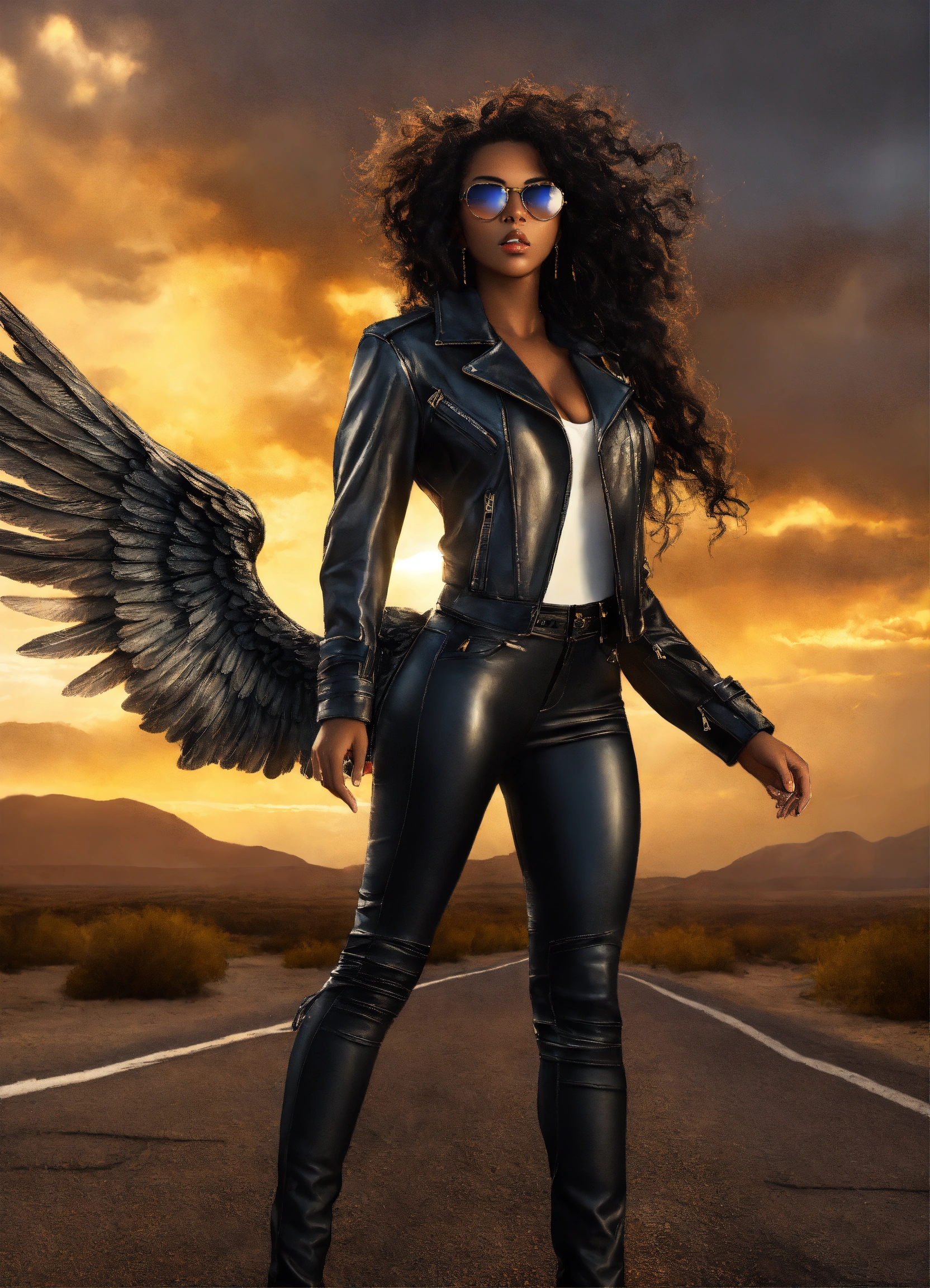 Hyperrealistic full body beautiful black goddess angel with wings, beautiful black angel woman with dark brown skin, beautiful perfect face, shapely hour-glass figure long flowing hair, fully clothed black leather jacket, jean pants and white blouse with gold accessories and sunglasses, she's standing by a motorcycle floating in the with a desert road gold lightning dark clouds behind her, high detail, realistic photo, high detail, digital painting, cinematic, stunning, hyper-realistic, sharp focus, high resolution 8k, insanely detailed