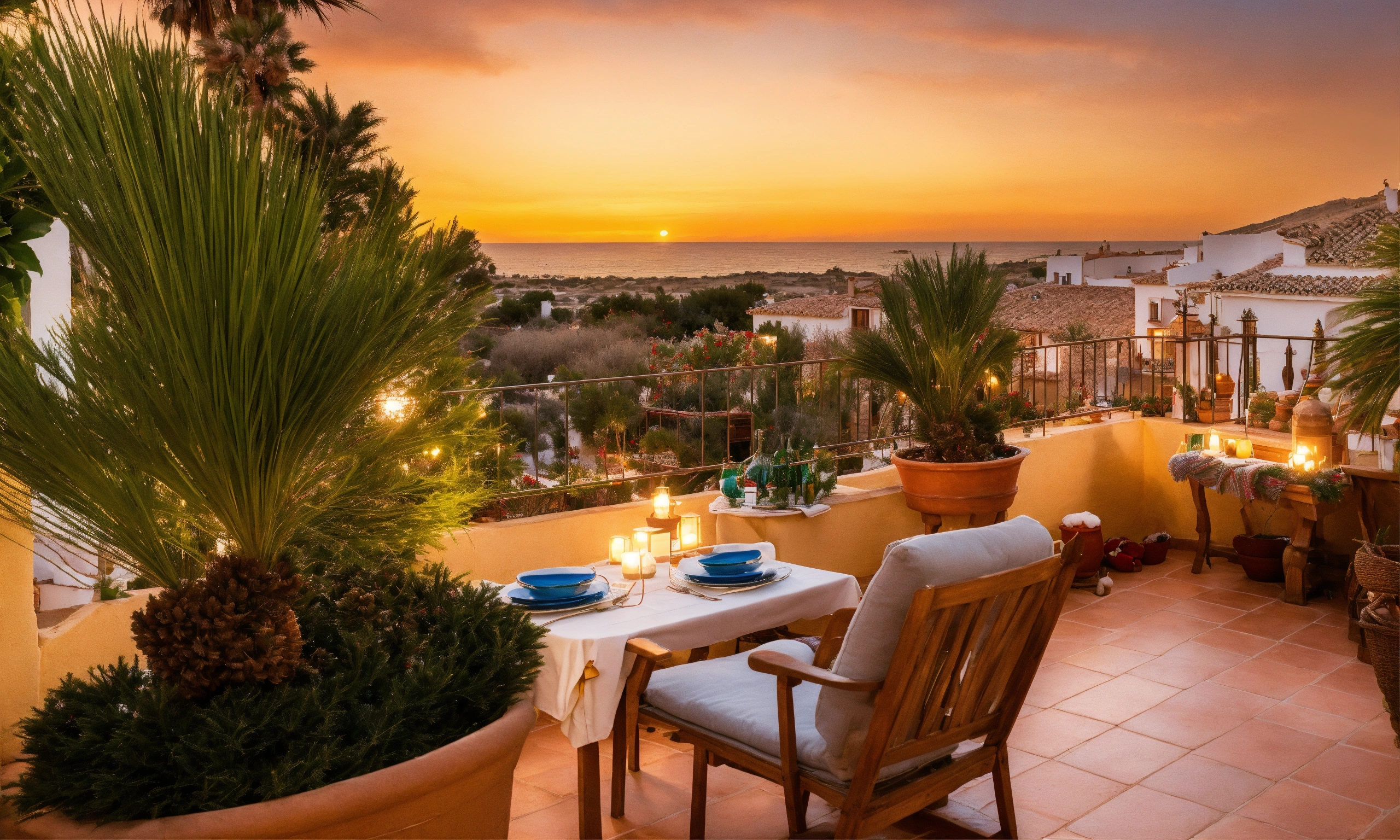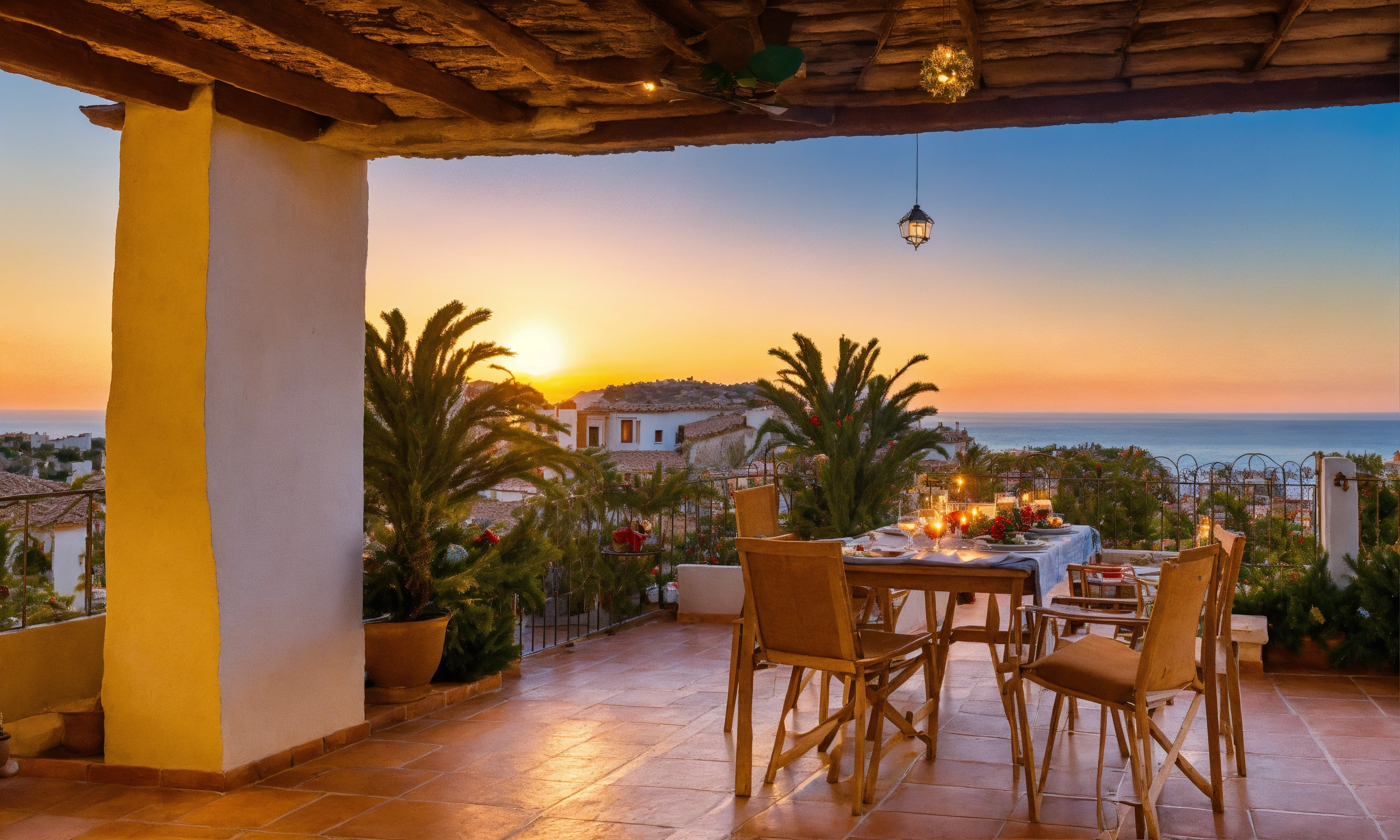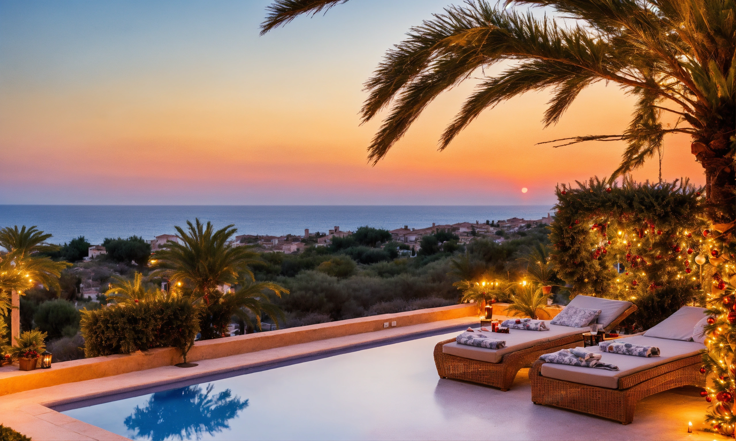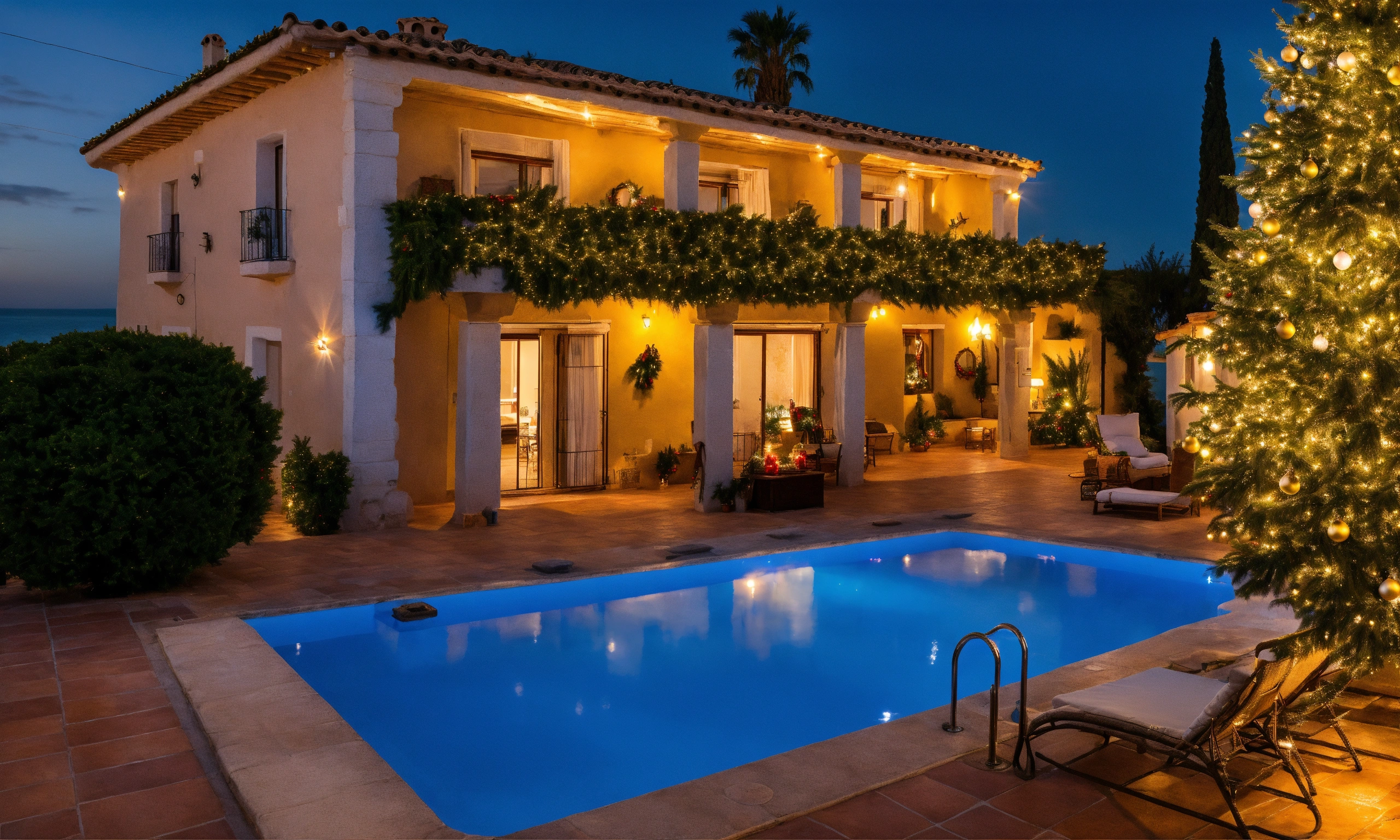 Produce a photo that emphasizes the joy of spending christmas in a spanish holiday home, the image should showcase both the property and the festive atmosphere to attract potential renters and add also a palm tree and seaview time of day sunset