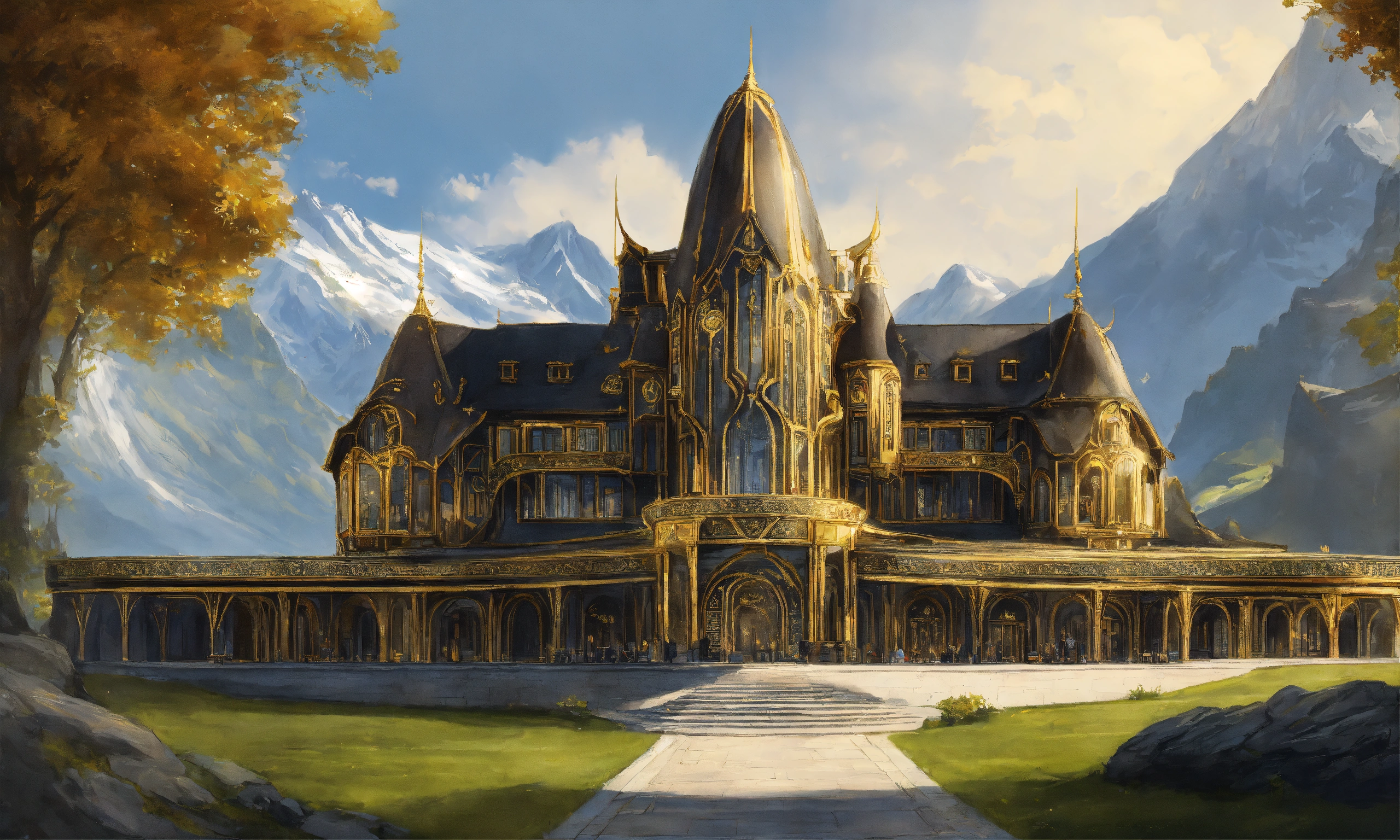 Drawing of the full image of a massive black and gold elegant high elf sci fi palace in switzerland, elven architecture, clear blue skies