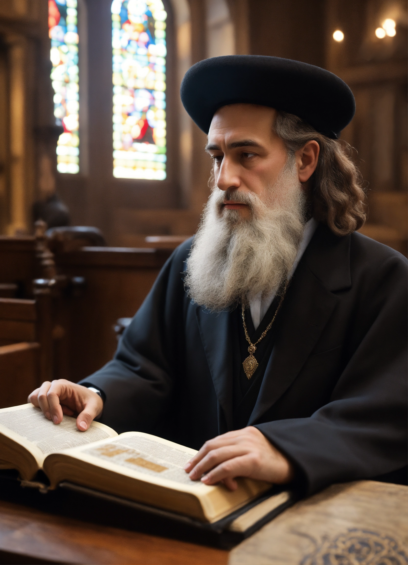 A medieval hasidic jew from a medieval jewish town praying with a jewish forehead cap, and a siddur in hand, righteous, black suit, white beard, thoughtful and serious face, shaven at the back of his neck, seen from his front, in the background the interior of the synagogue, looks real, masterpiece, very detailed, hyper realistic, 3d style, disney style, 8k, beautiful, live style, cartoon character in pixar style, pixar style, 3d style