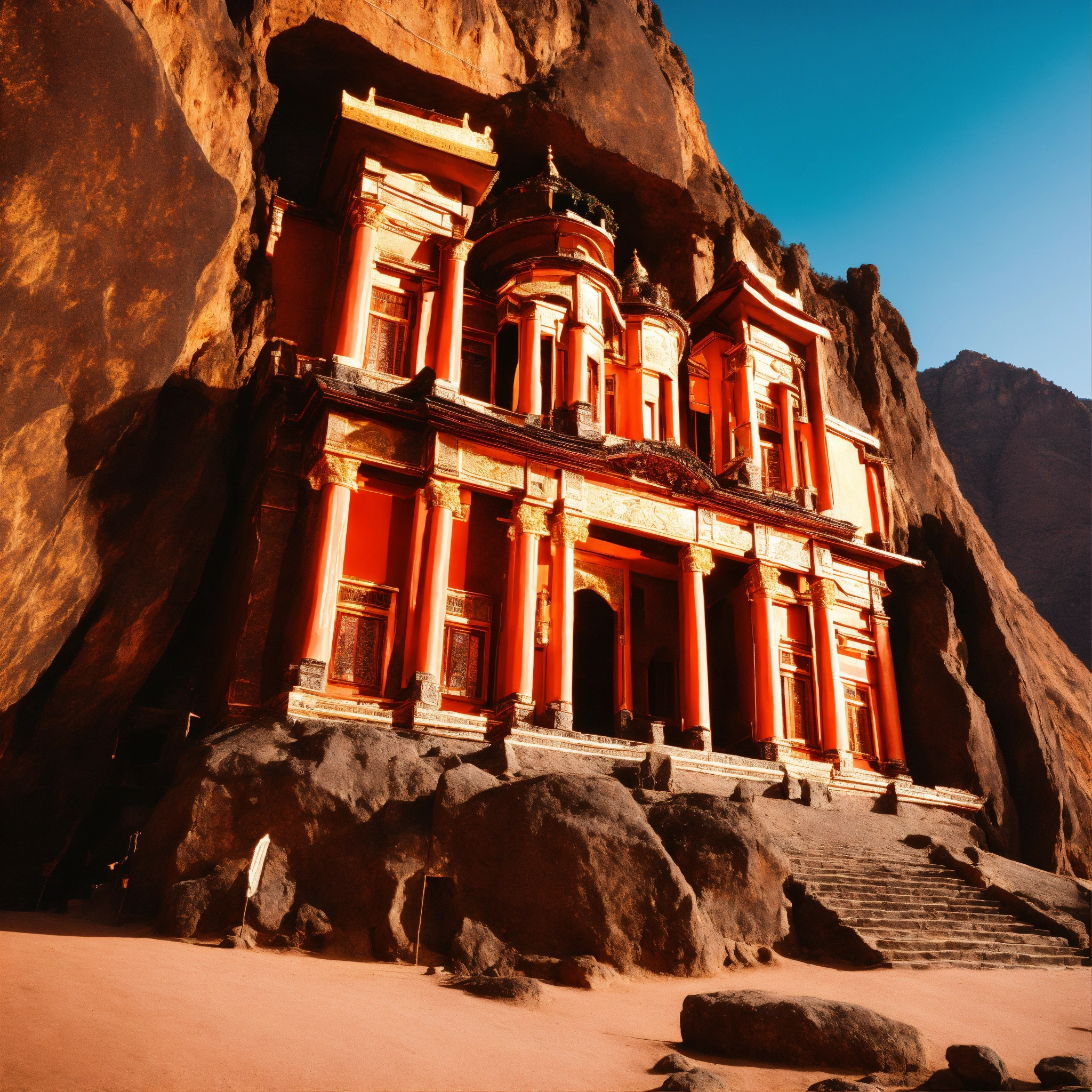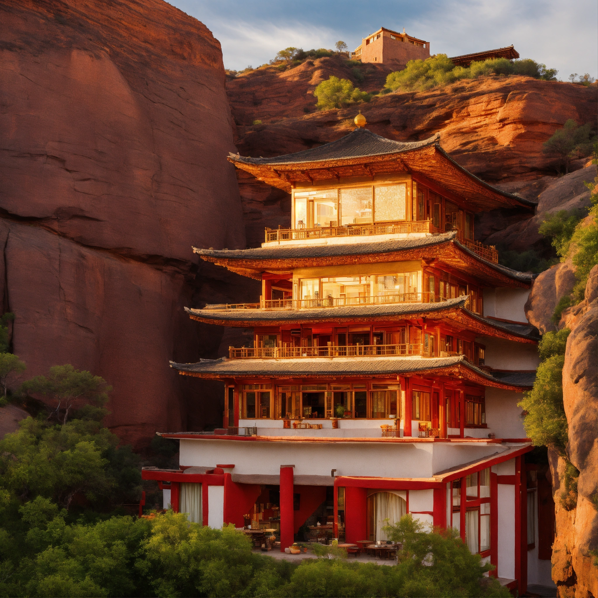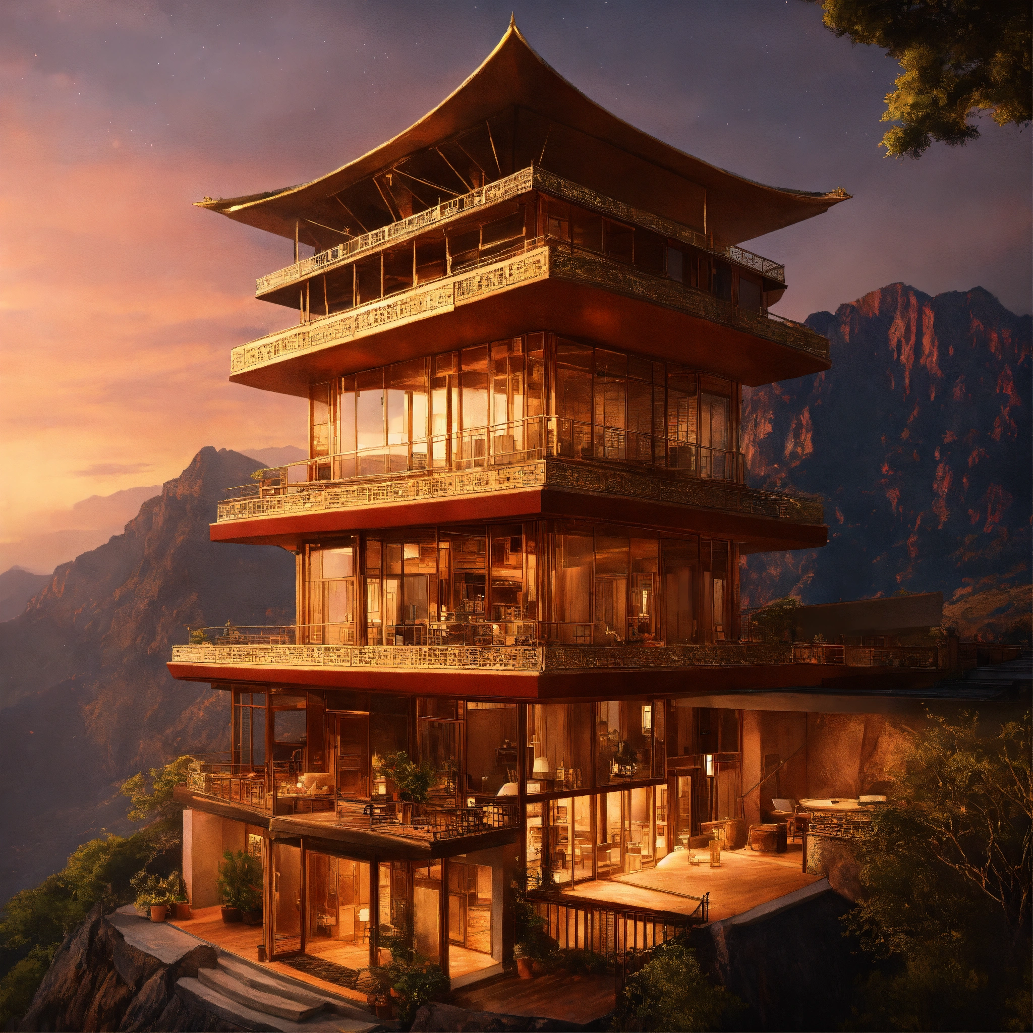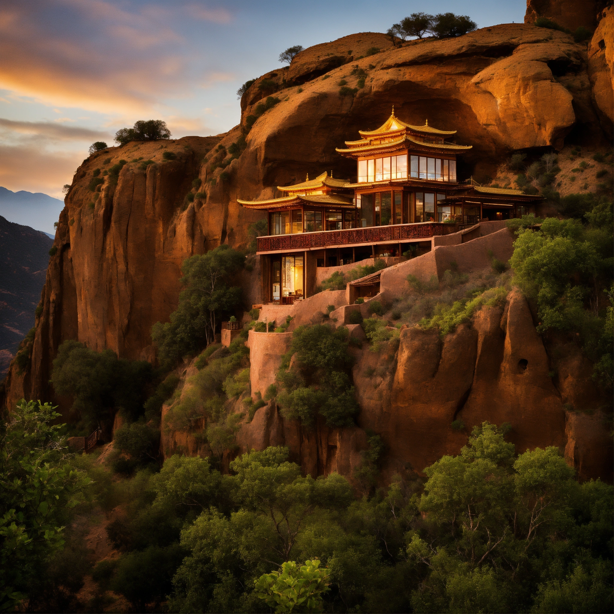 The house is built into the middle and largest peak of the red flat-topped mountains that flank the northern side of a city. the mountain has holes and windows built in the uppermost part of it, carved into the rock. at night, it looks as if the mountain has been crowned in gold. the house has many broad balconies glided by the light of golden lanterns. at the far end, built into the red mountain itself, are two glass doors that open to a large, but surprisingly casual, dining room