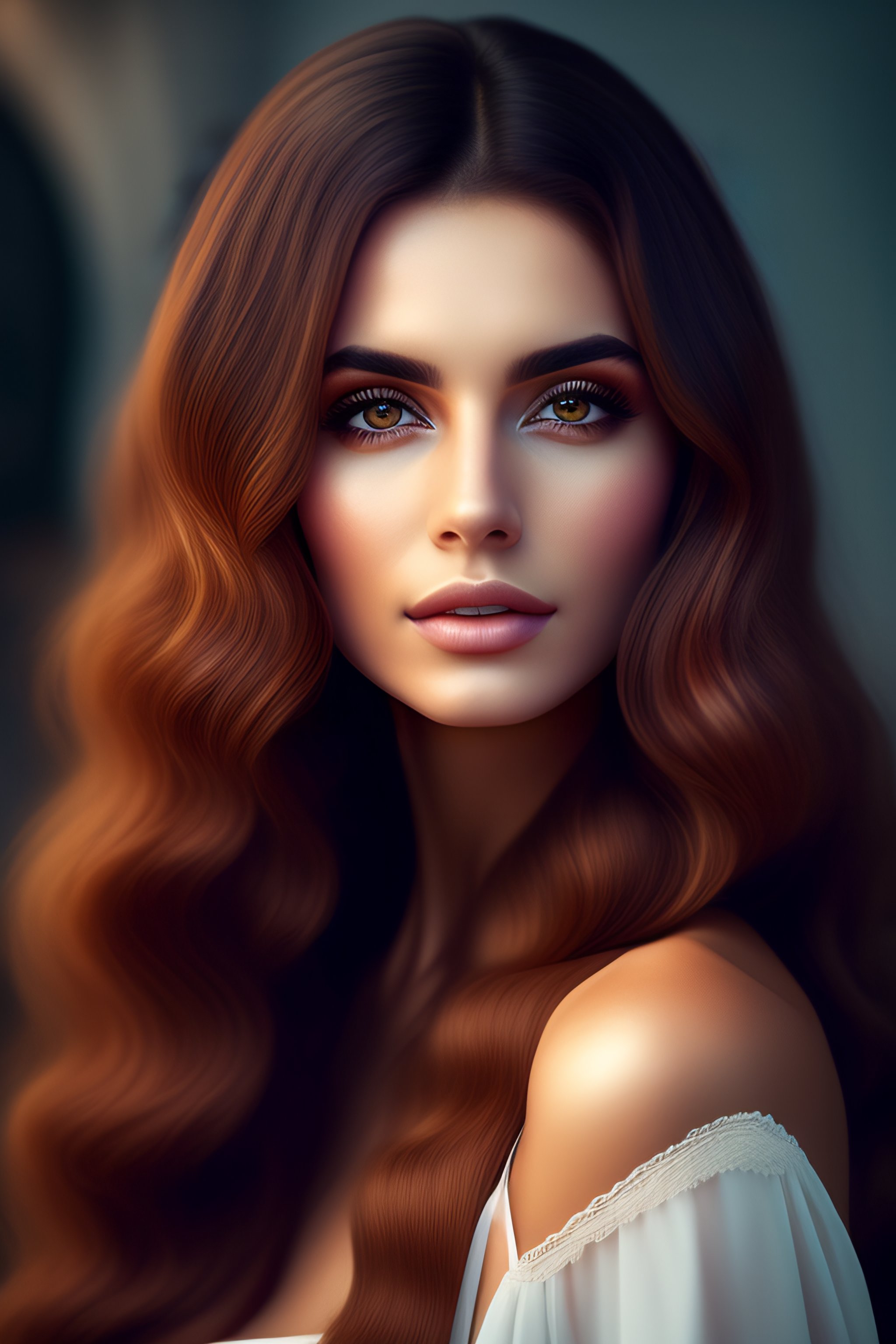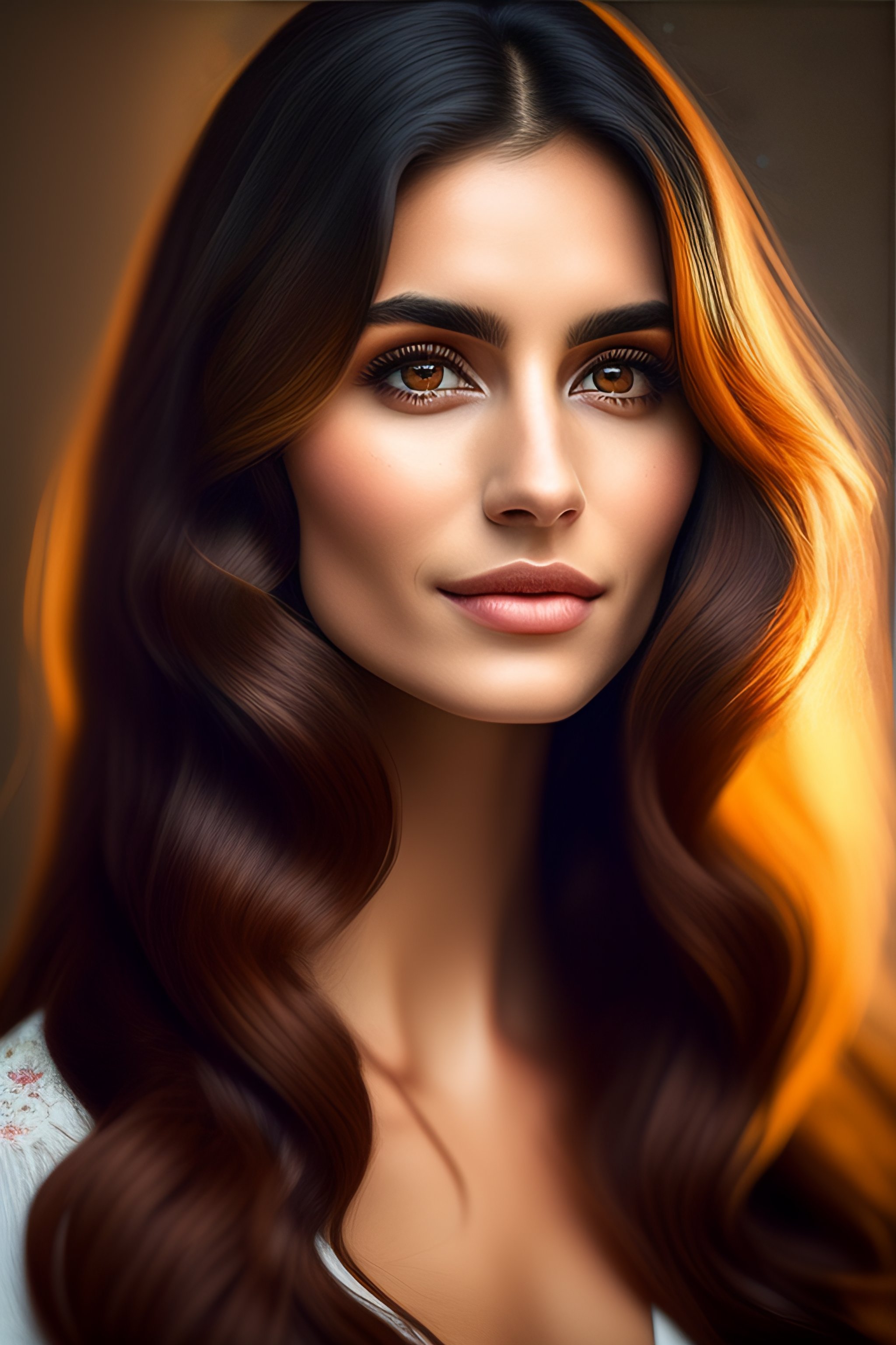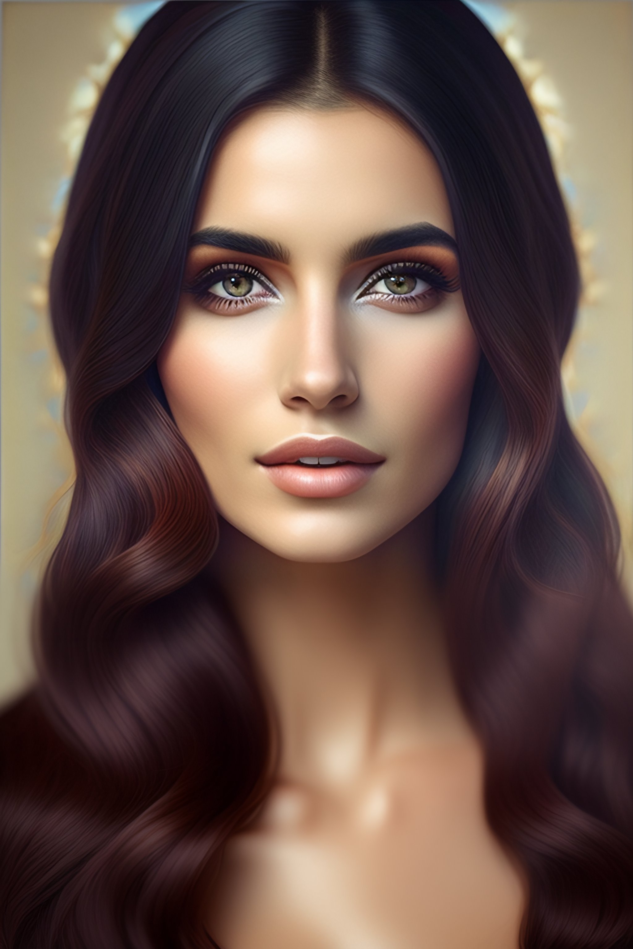 Woman, round straight nose, wavy long hair, round big eyes, round face, small thick lips, soft jawline, armenia
