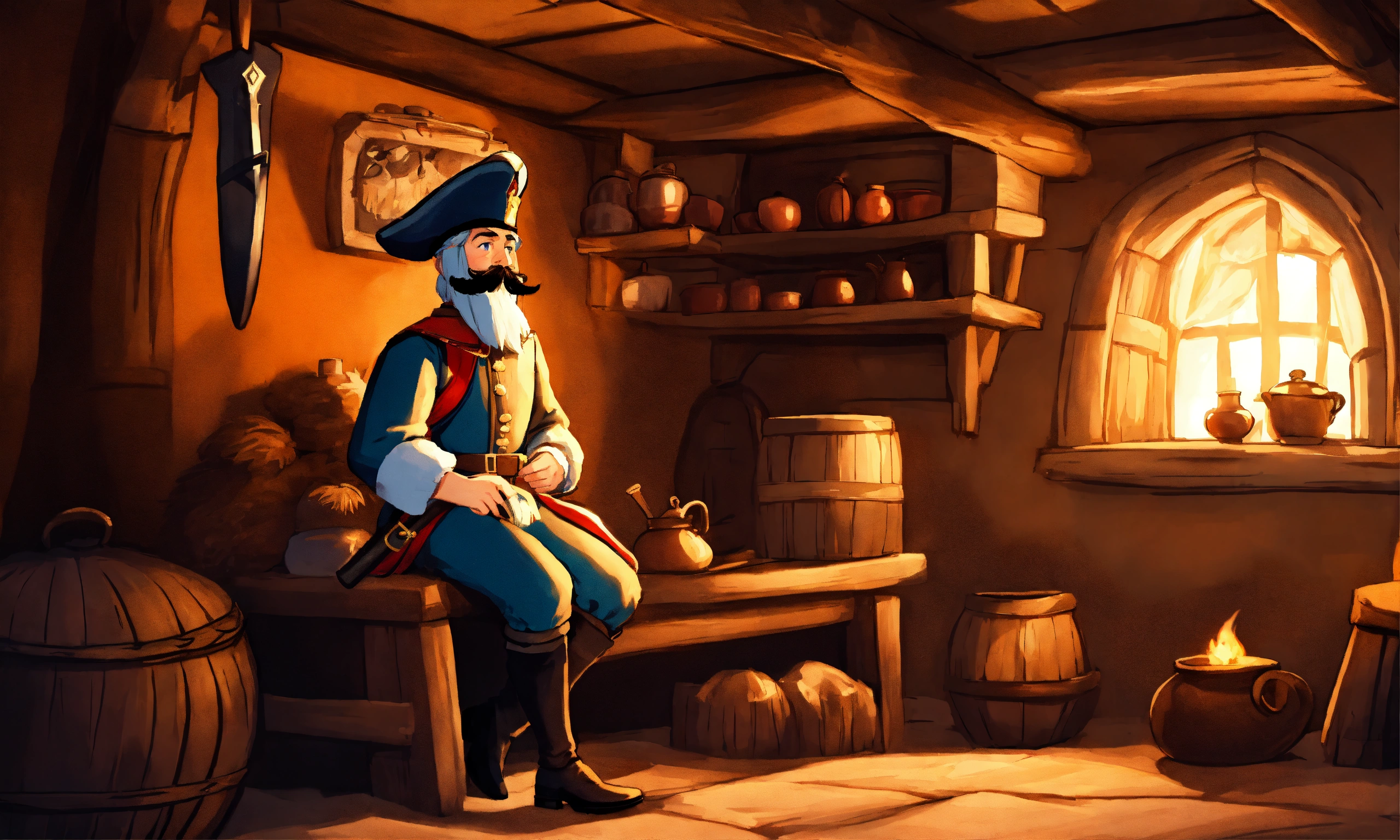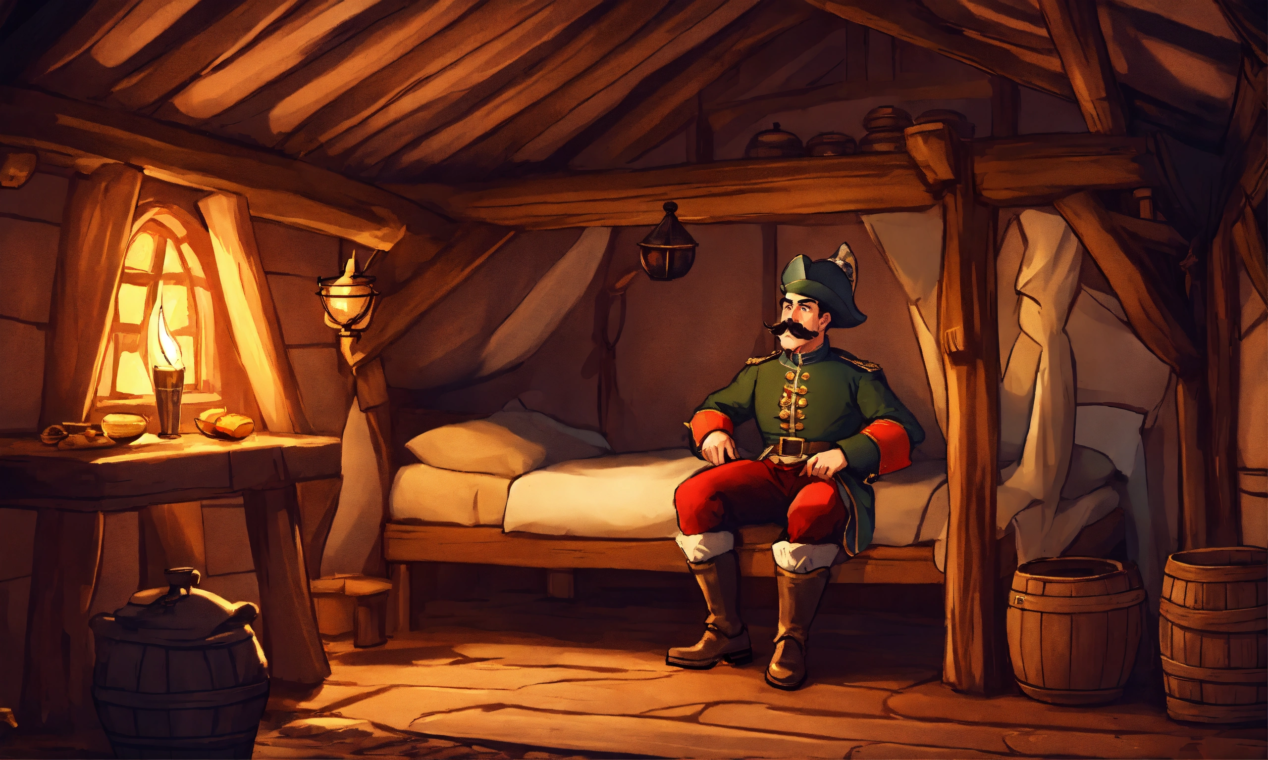 One cartoon style 18th century soldier with mustache in a cozy medieval hut