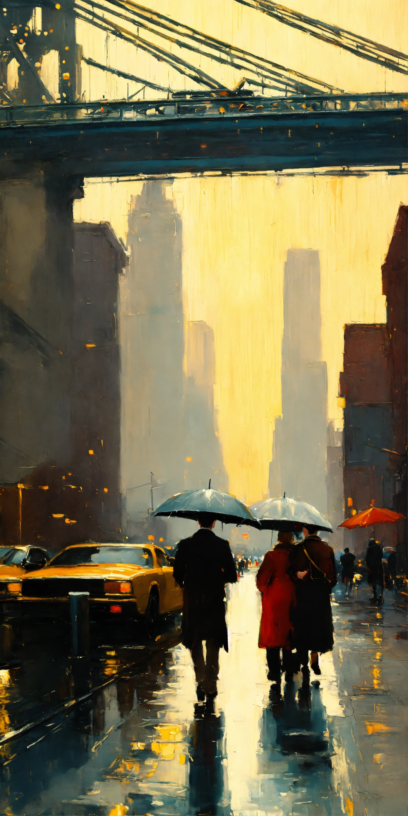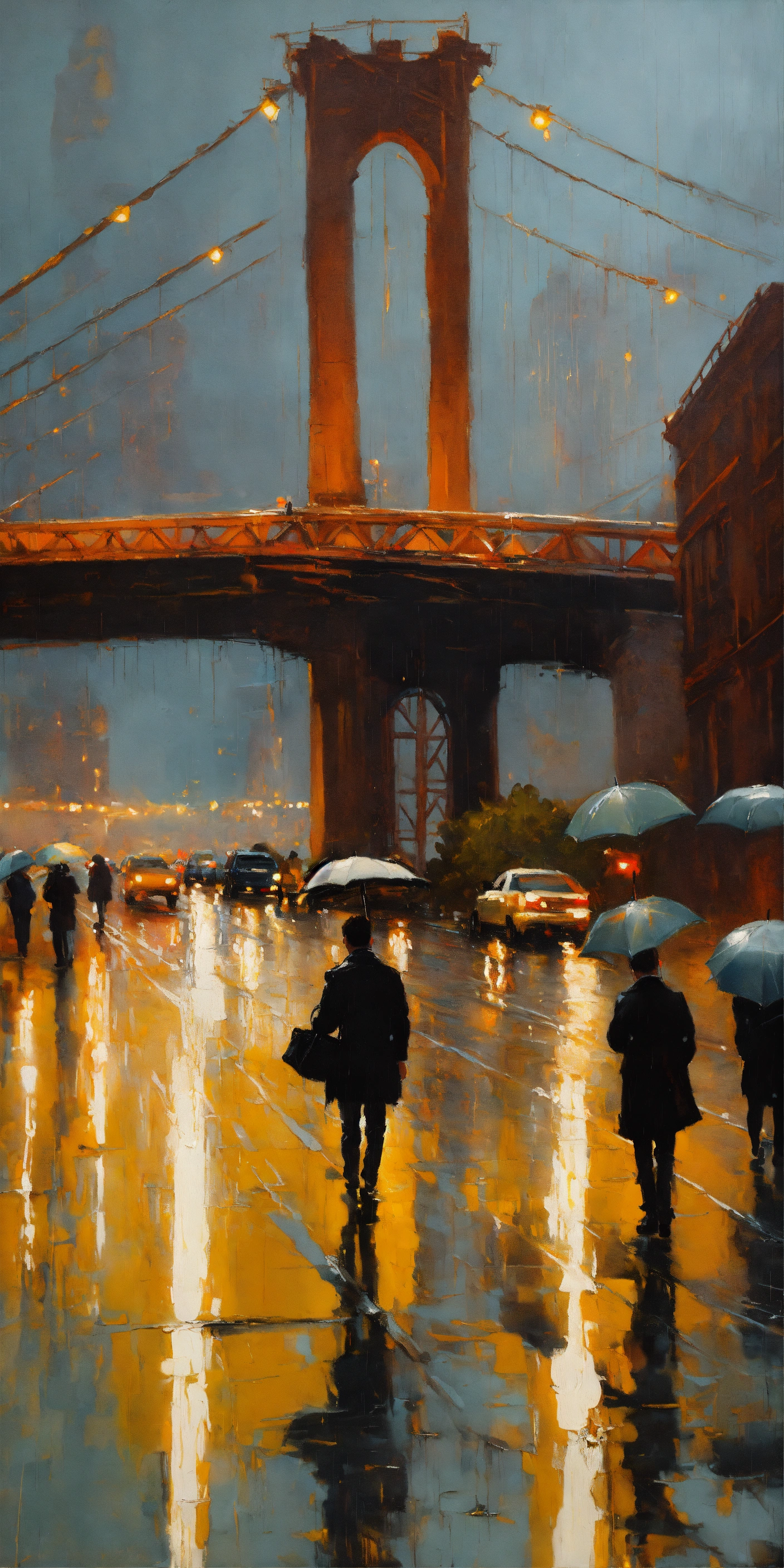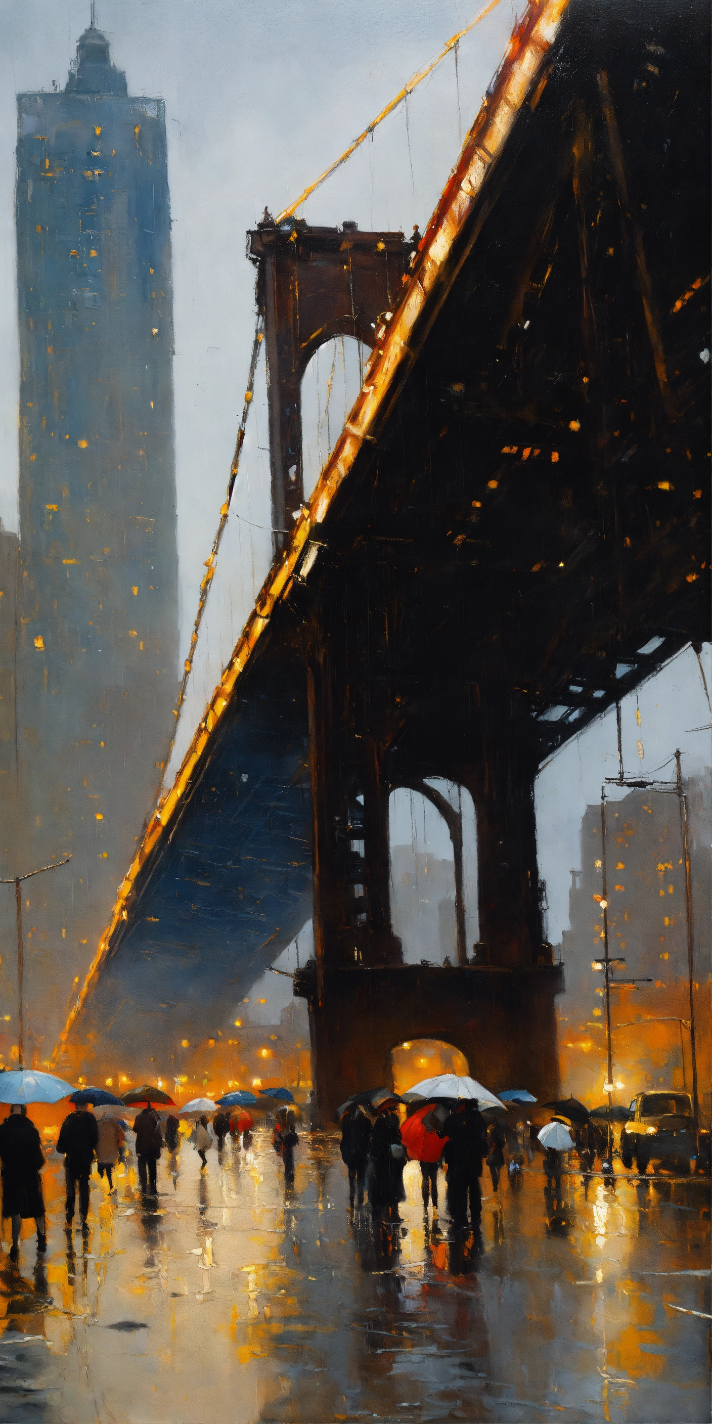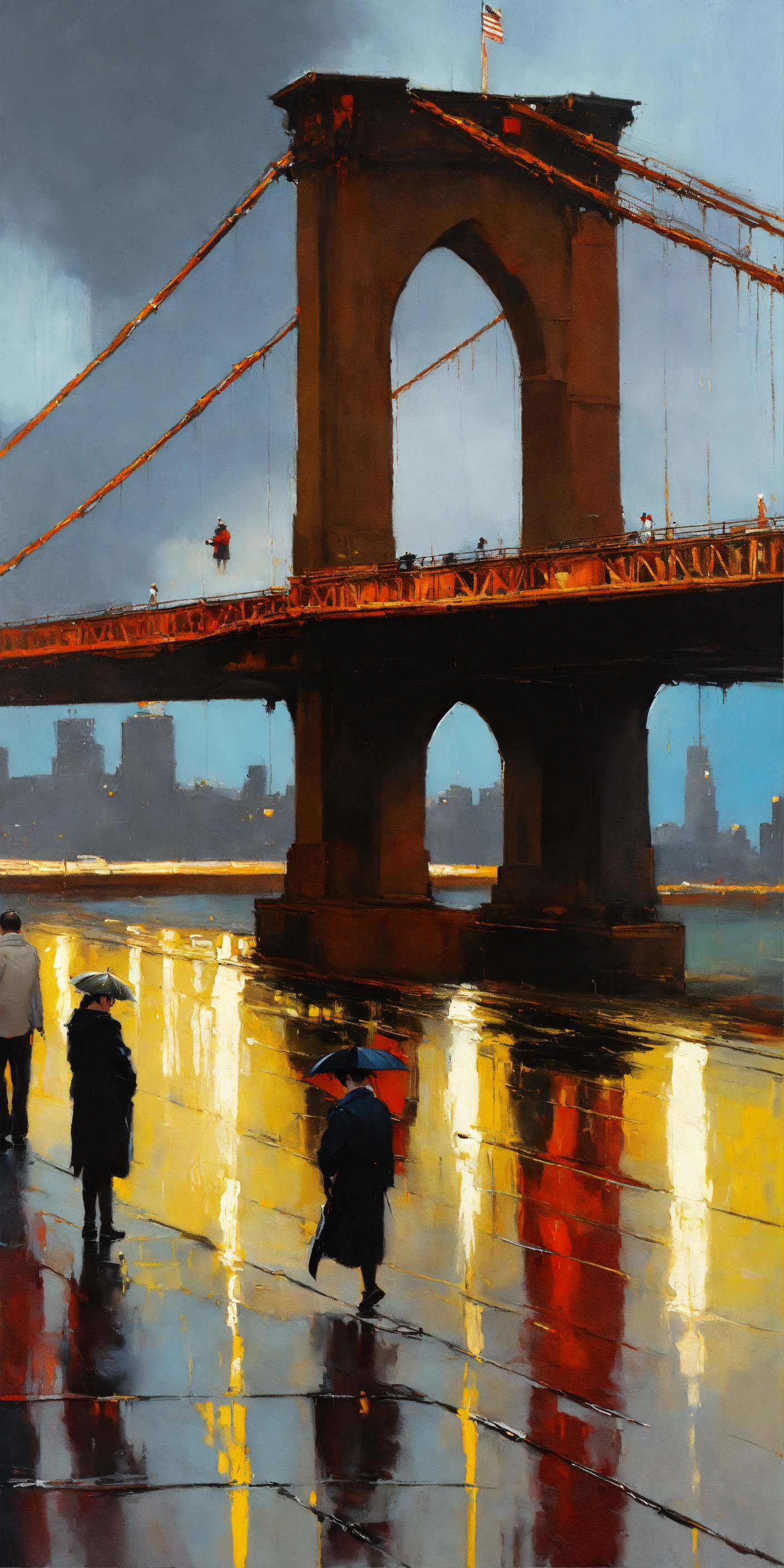 New york bridge, rain, people, canvas, oil paint, impasto brushstrokes, richard schmidt, mark legu, jeremy mann