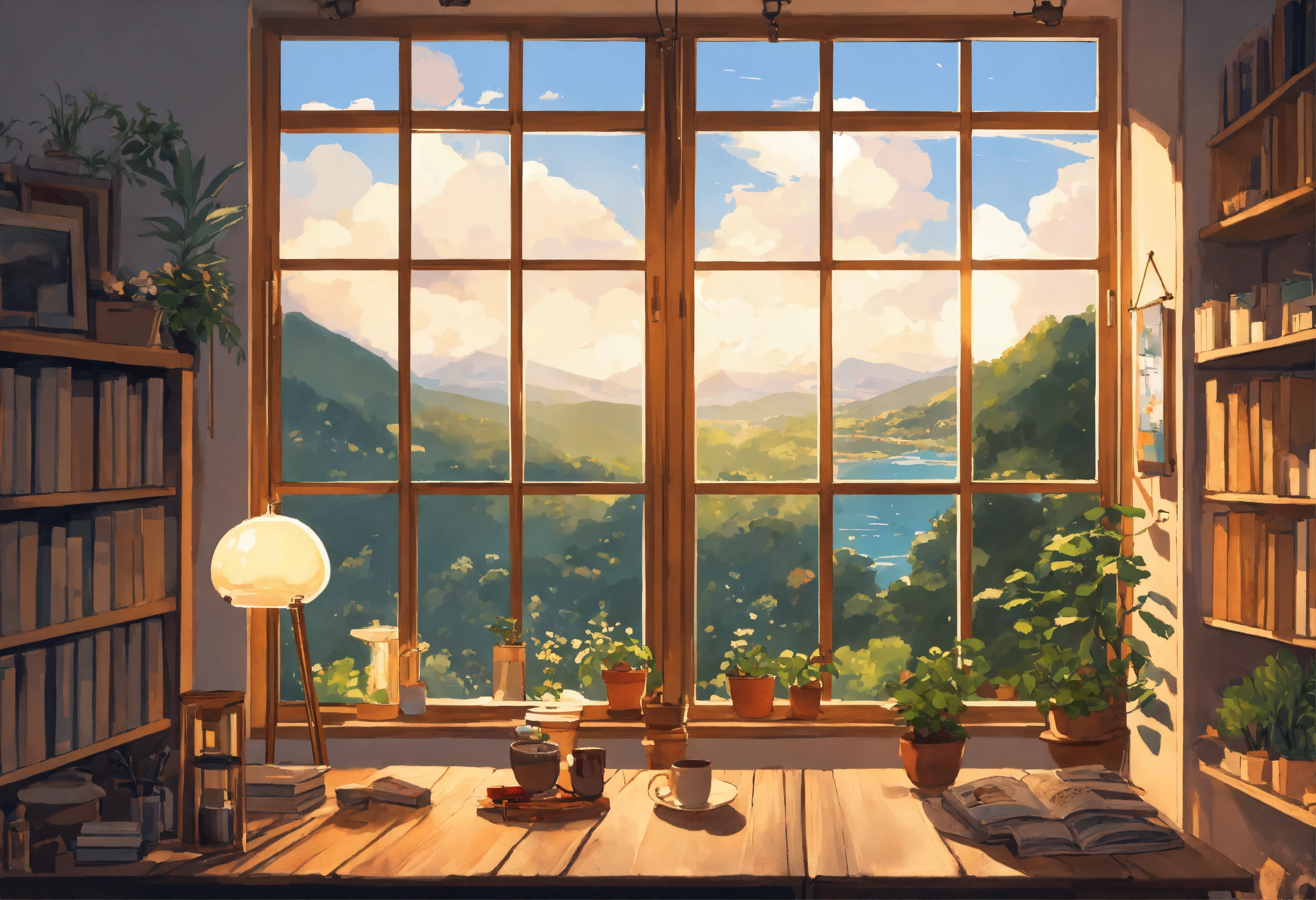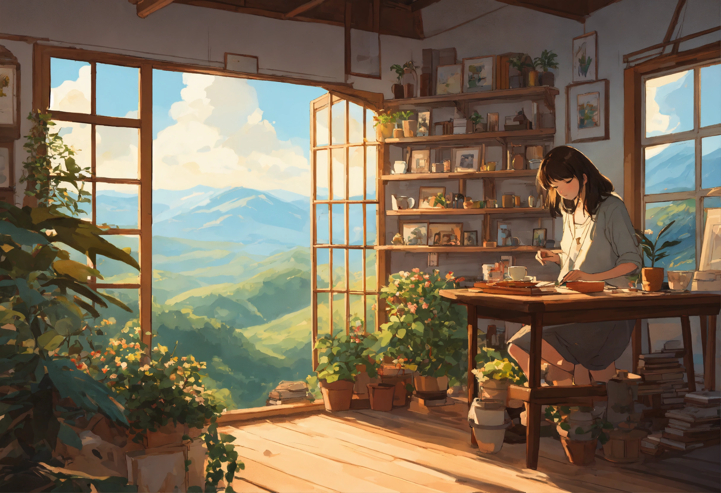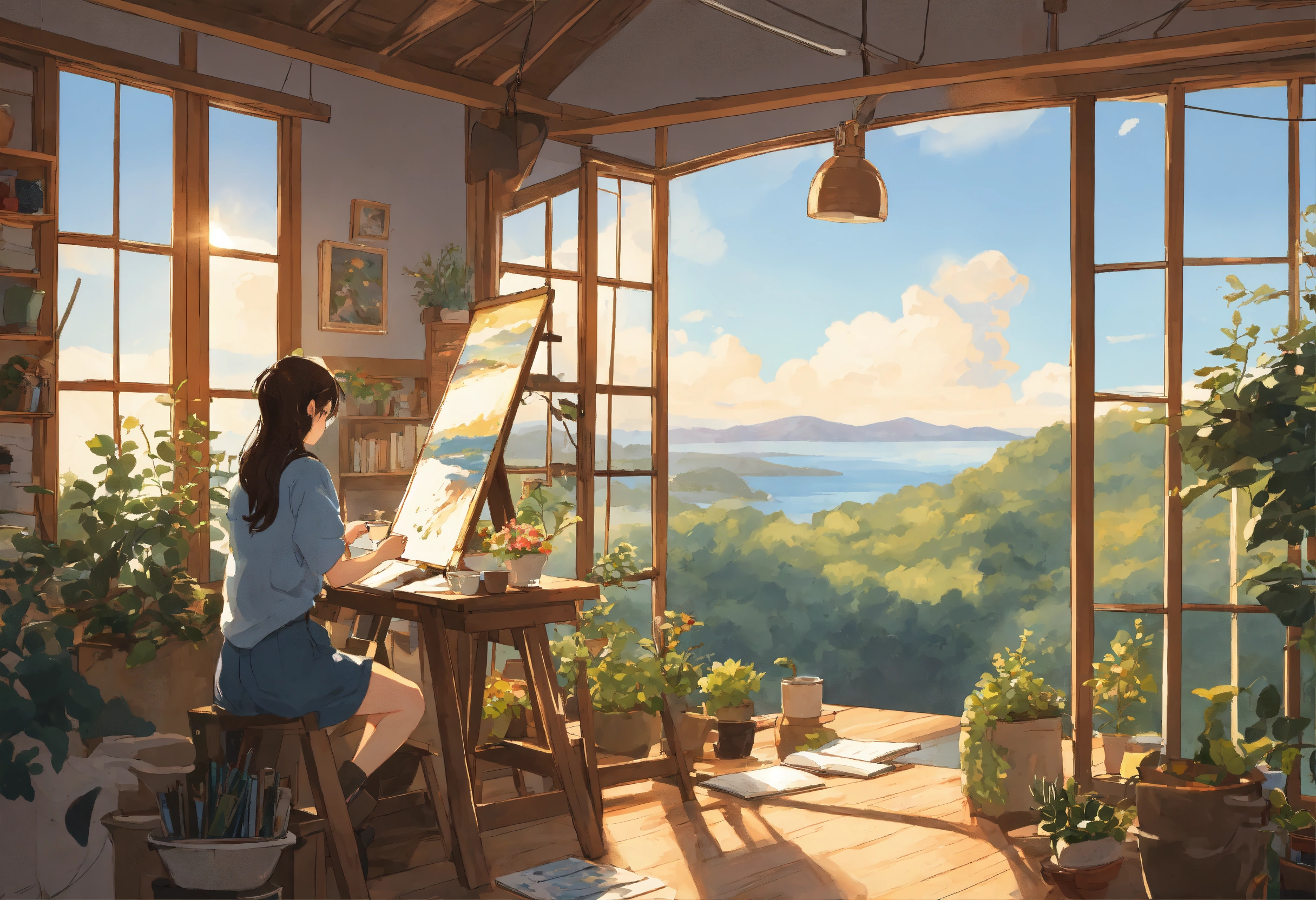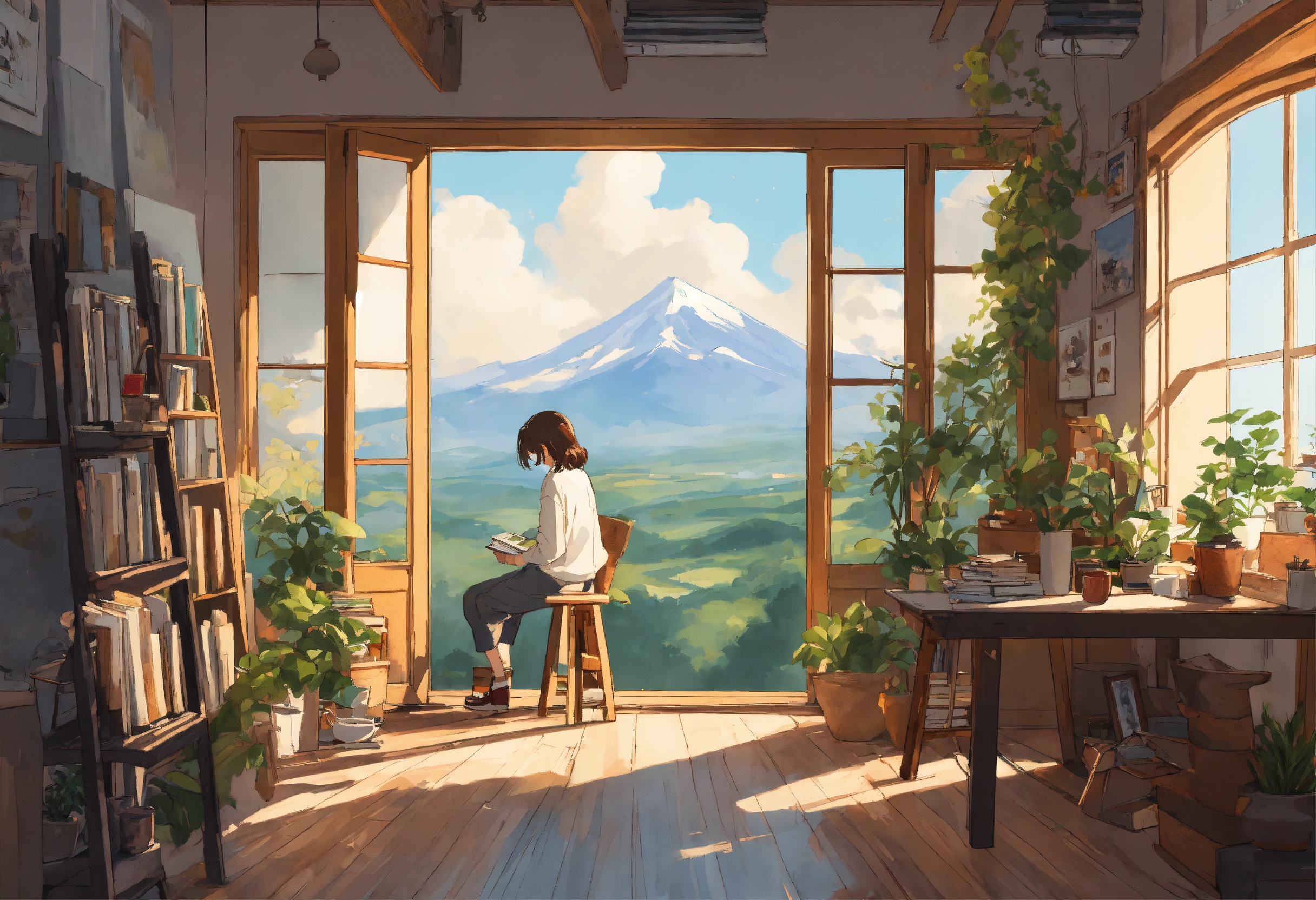 Studio ghibli illustration, simple art inspired by the visual style of studio ghibli, scandinavian art studio, industrial loft, japanese style interior decoration, mezzanine, white walls, canvas painting studio, canvas being painted on the easel, cup of coffee outside side on a table, ((an artist admiring the landscape outside)), some books on the shelves, some plants, sunlight coming through the window, landscape outside, cozy style, highly detailed layout, depth, many parts, cozy illustration