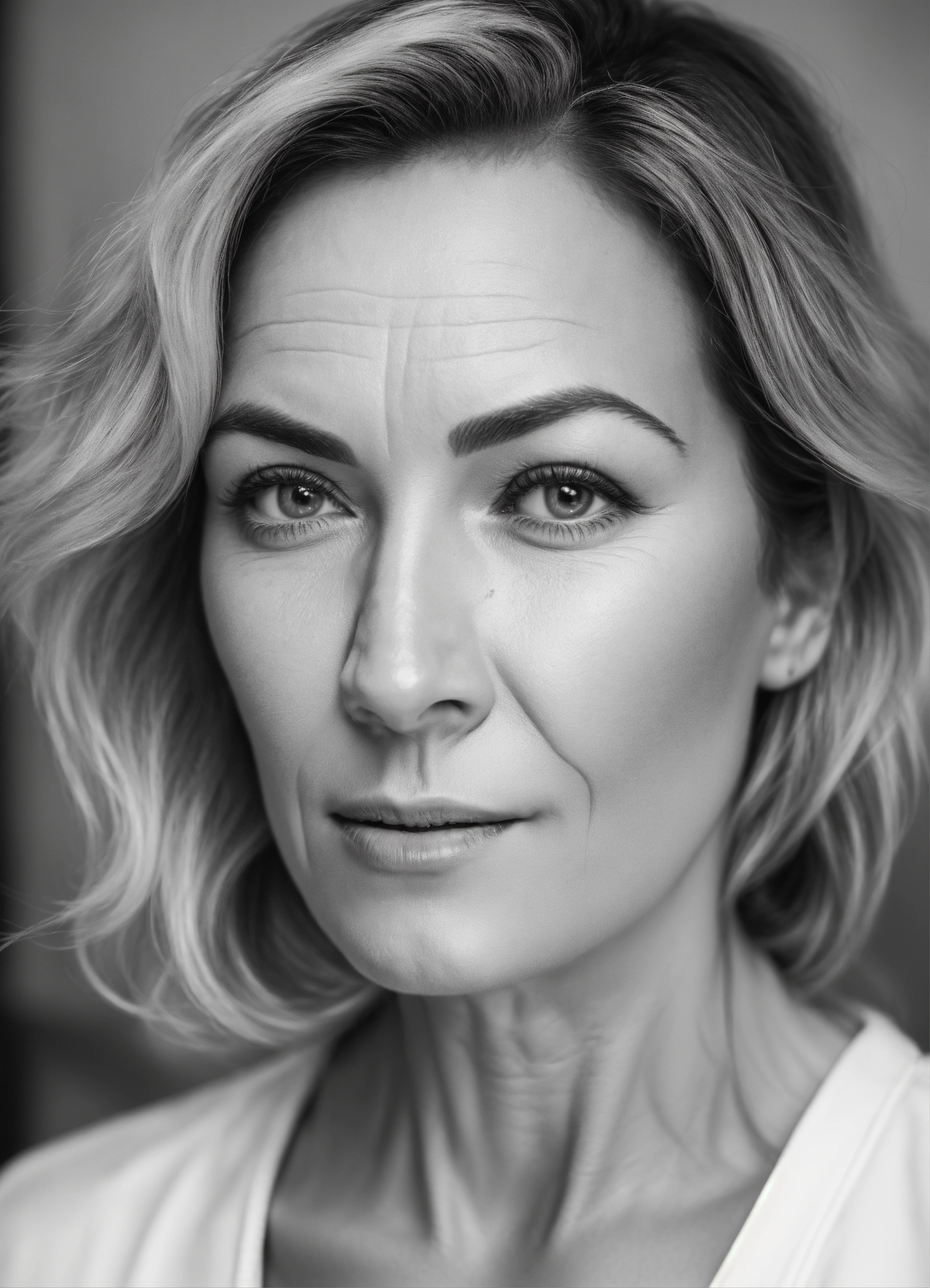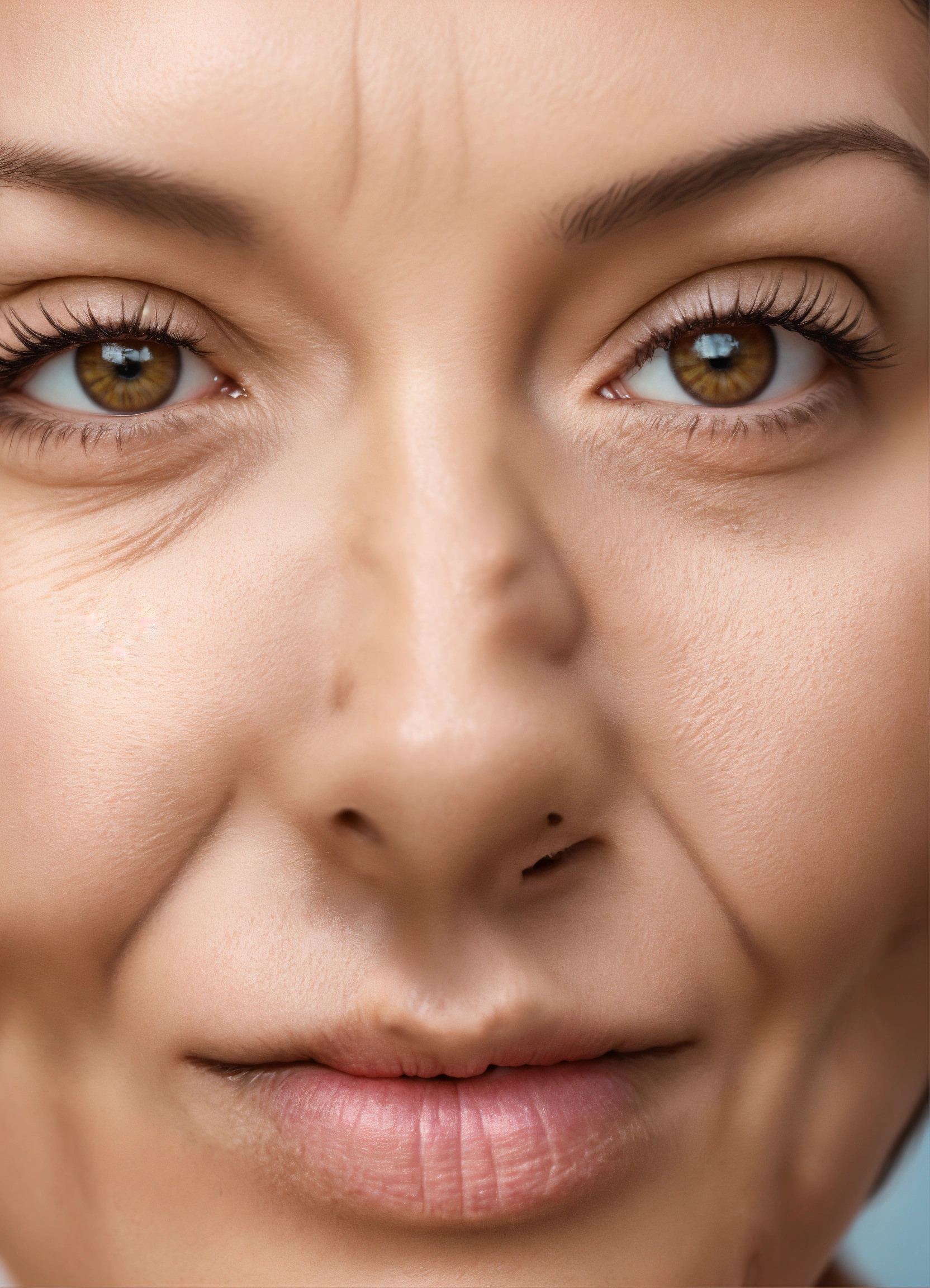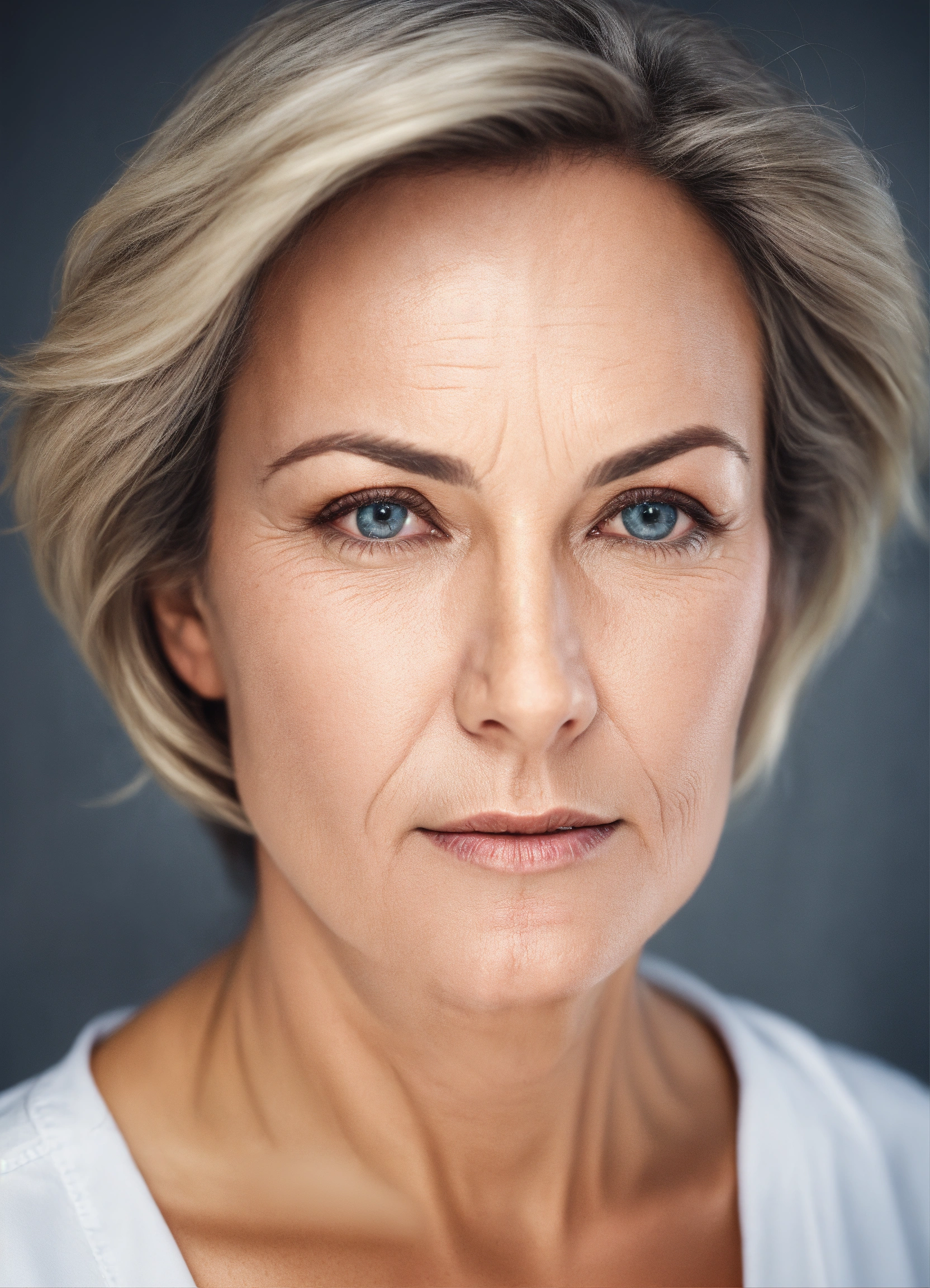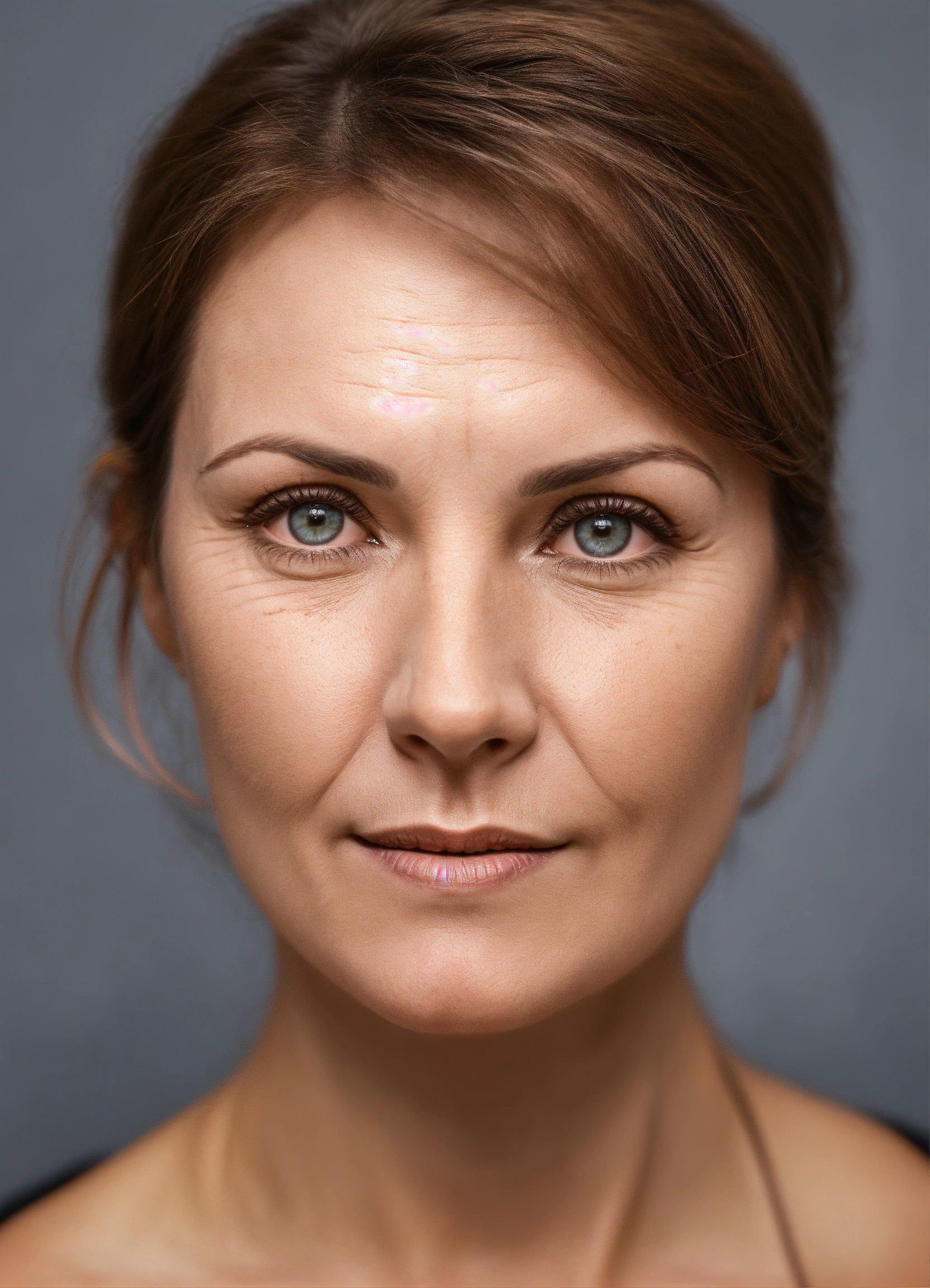 A realistic photograph of a middle-aged woman in her late 40's with a wrinkled forehead in need of botox treatment at a beauty clinic
