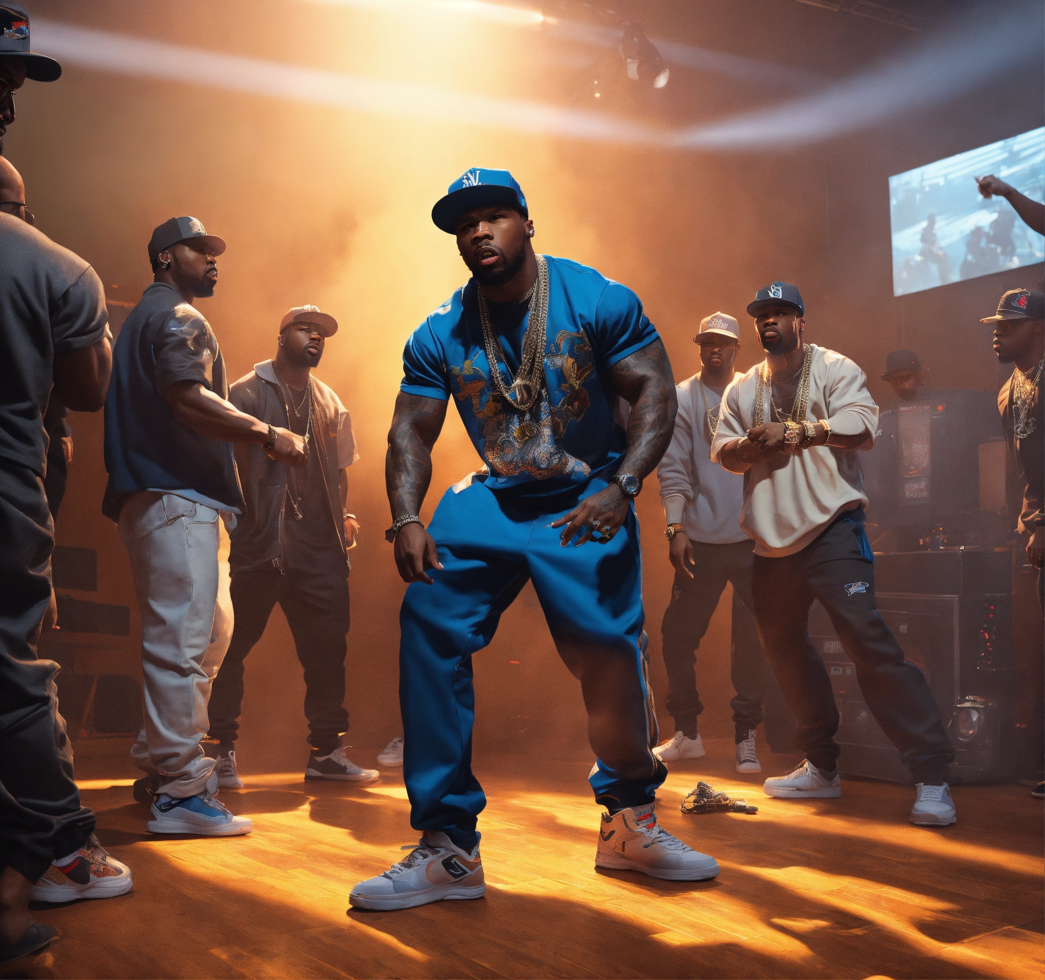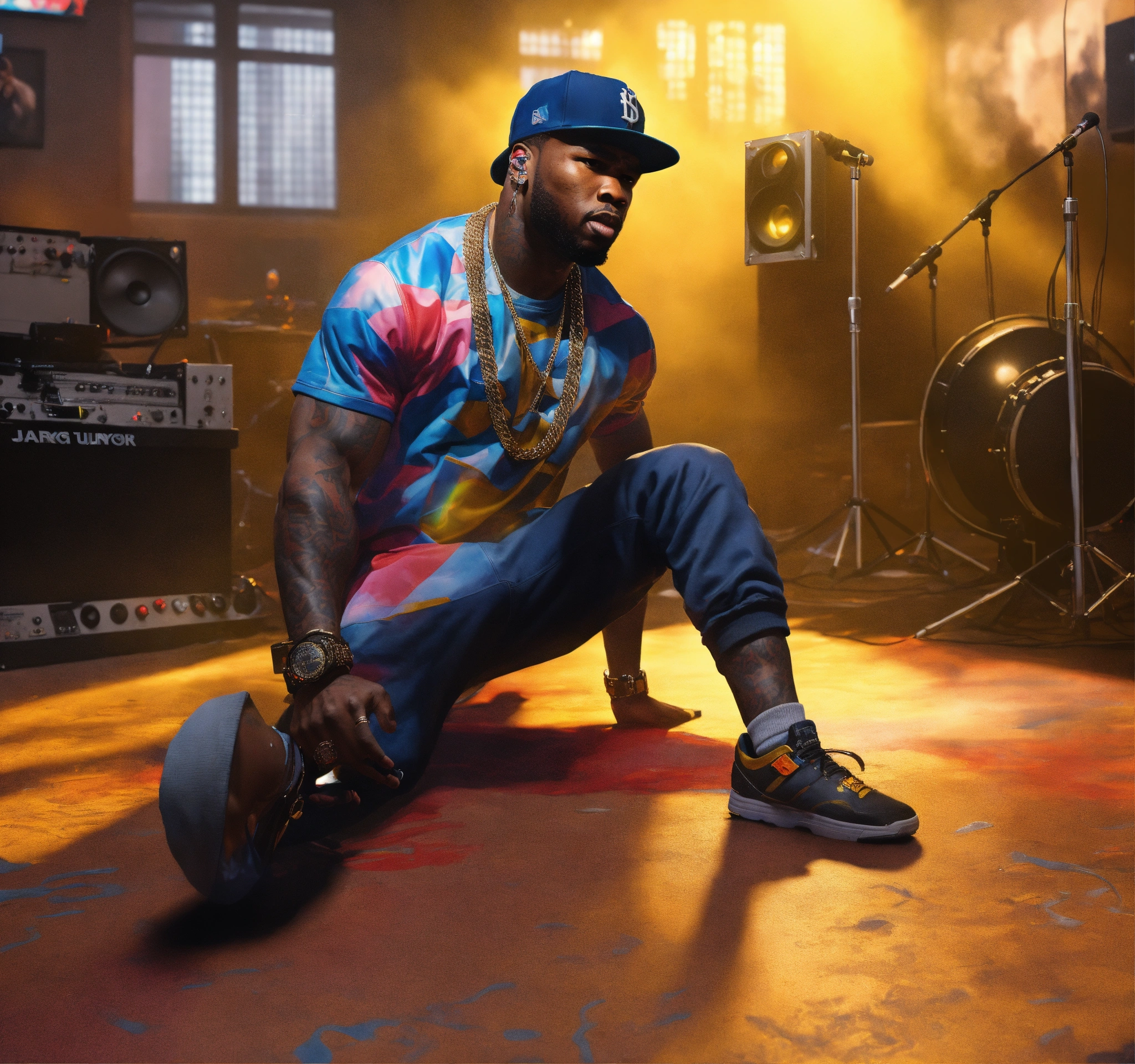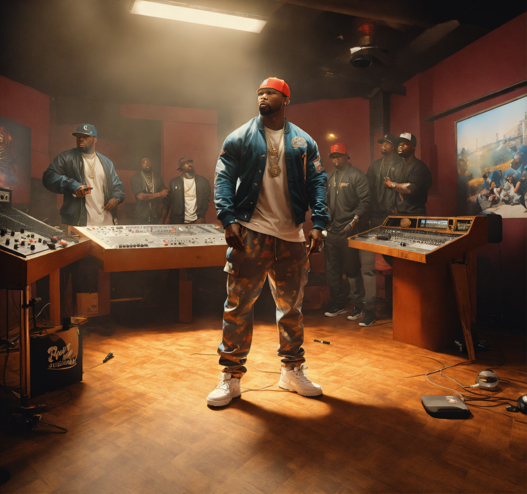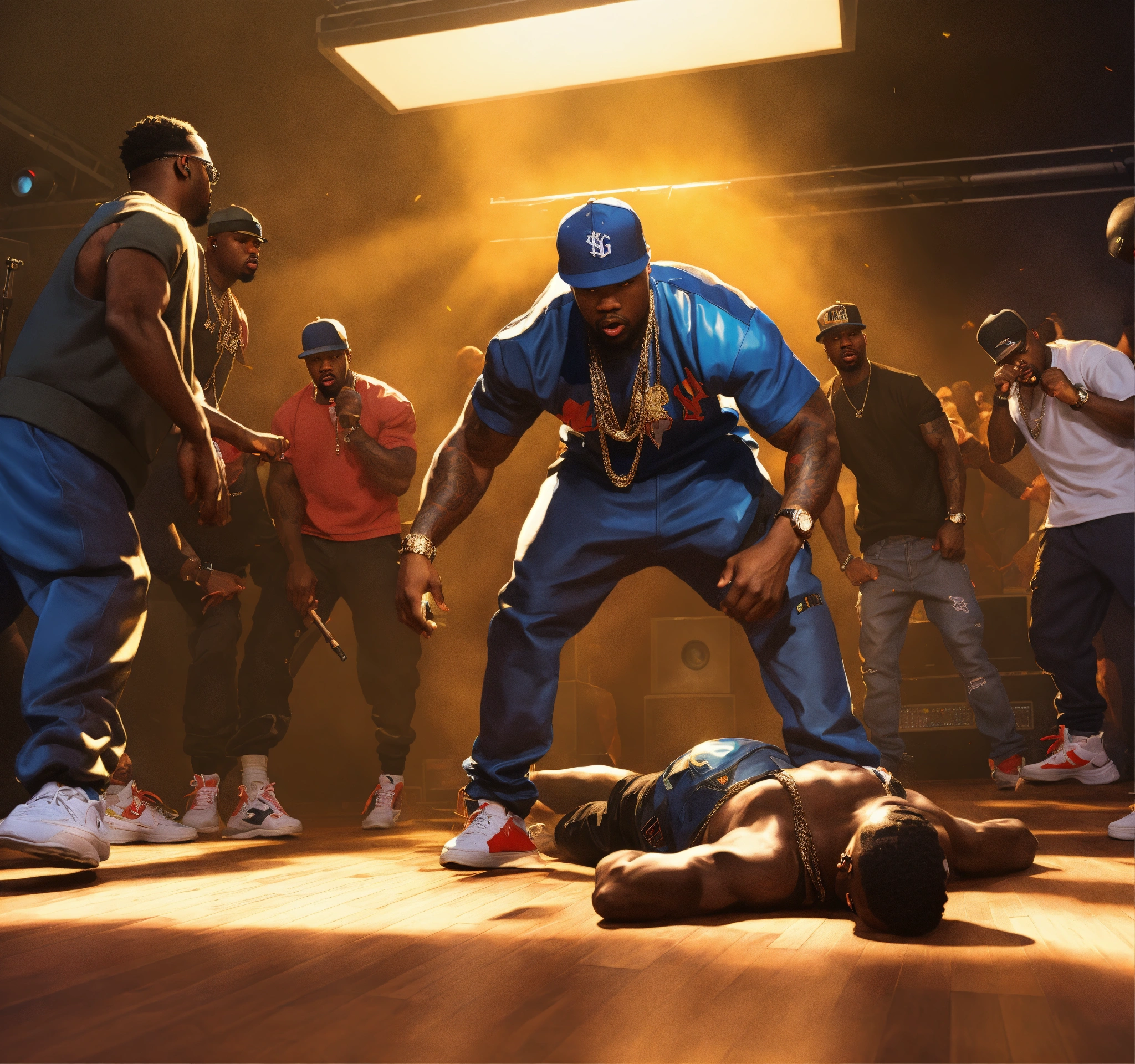 Medium shot angle pop art, hyperrealist full body portrait of black 50 cent looking rapper and g-unit crew fighting in a recording studio rapper ja tule on floor new york street on a sunny day, fantasy art, photo realistic, dynamic lighting, artstation, poster, volumetric lighting, very detailed faces, 4 k, award winning