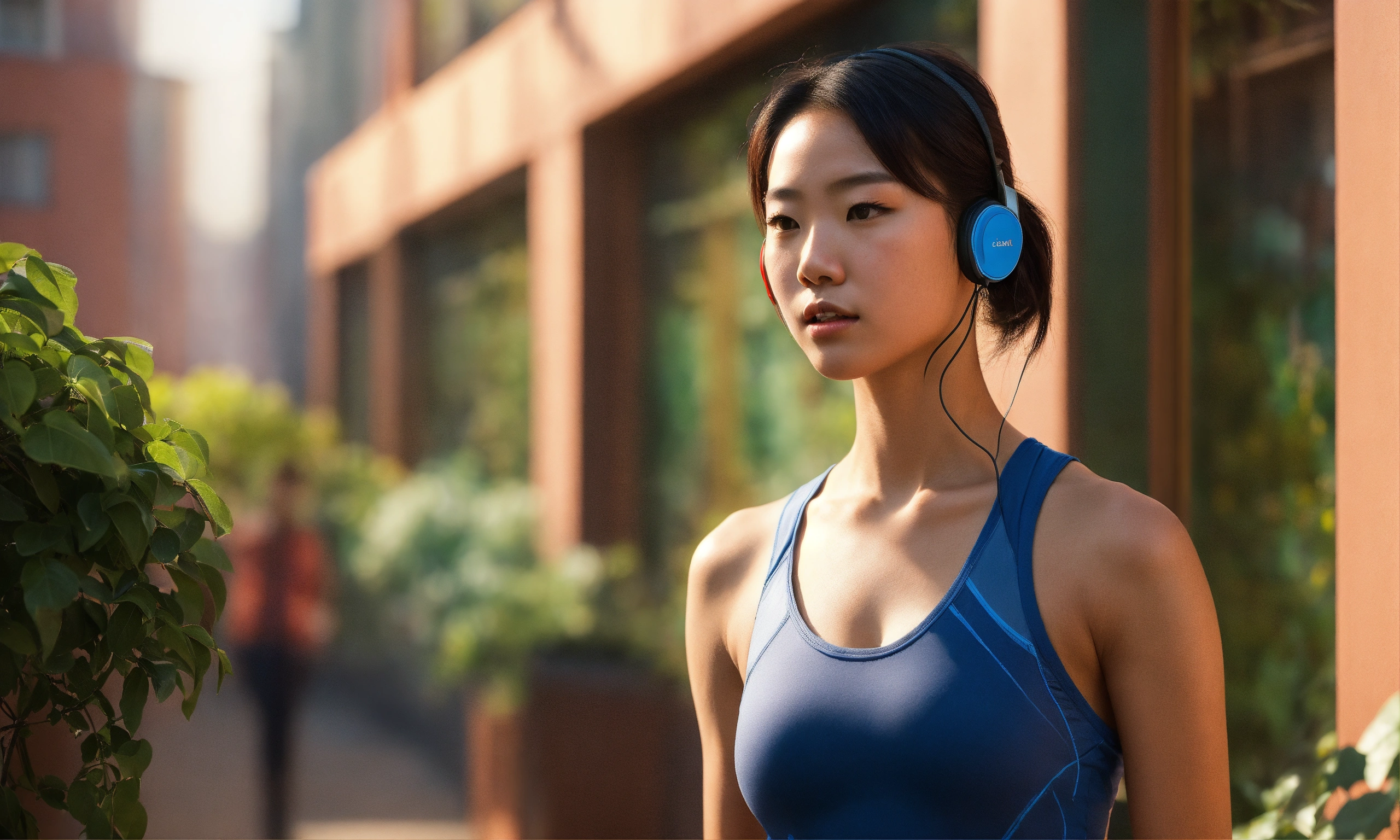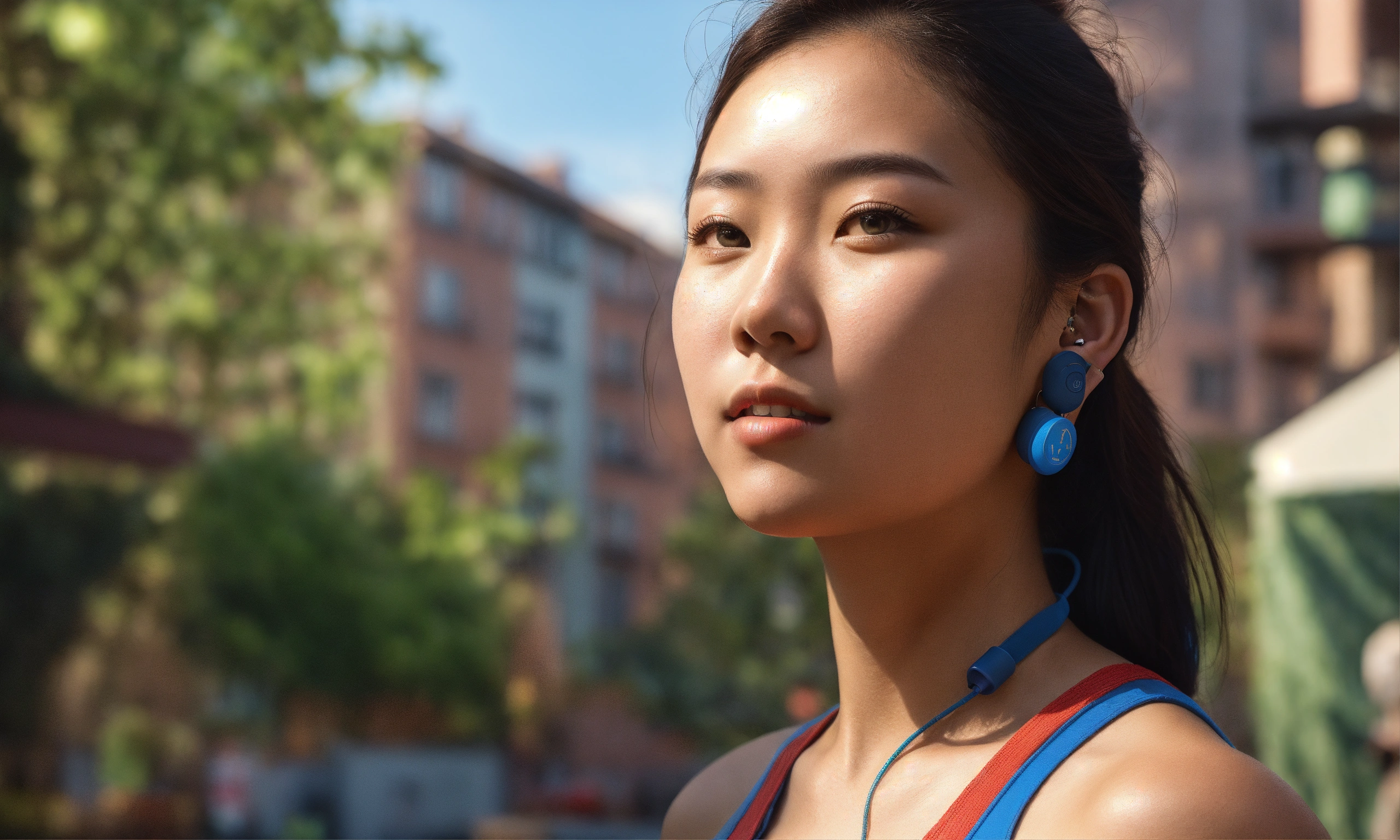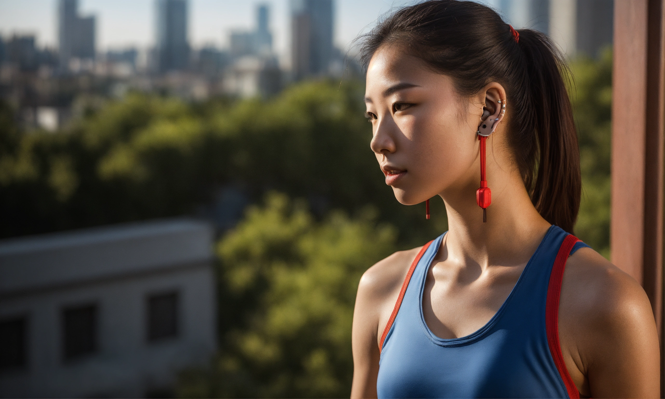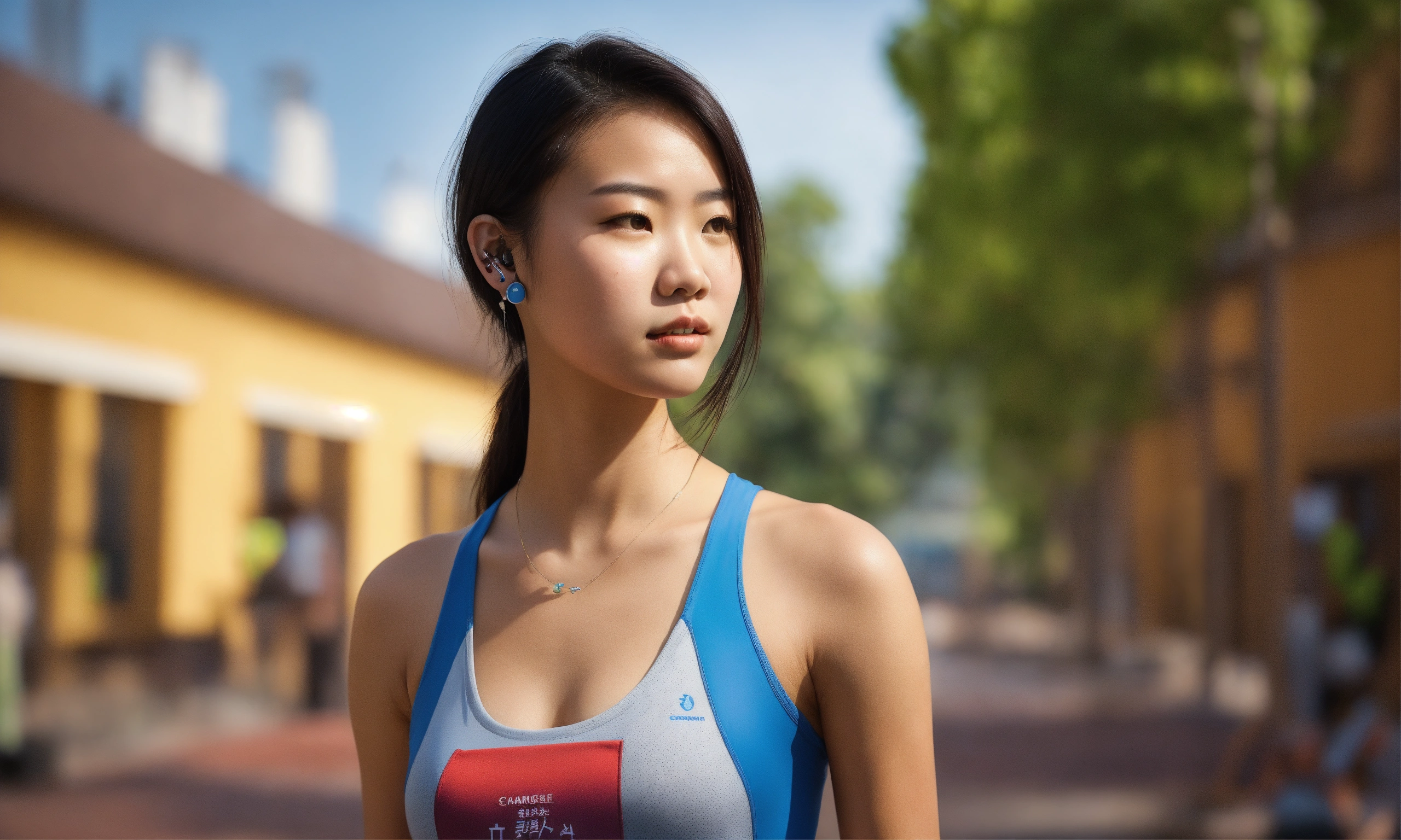 "in a sunlit open area on the first floor of a residential flat, with lush greenery as the backdrop, an 18-year-old tanned, athletic chinese girl confidently stands wearing a high-tech, wireless blue ear bud and a plain red singlet. her demeanor exudes a mix of determination and a hint of annoyance, primarily stemming from the sound emitted by her ai. the natural sunlight creates a striking contrast with the artistically rendered cityscape. captured with a canon eos r5 using a 24mm f/1.4 lens, the medium shot emphasizes the complex emotions on her face. this description is tailored for a text prompt, evoking the essence of a contemporary renaissance portrait and epitomizing the harmonious union of organic warmth and a subtly stylized, painterly cityscape with abundant greenery."