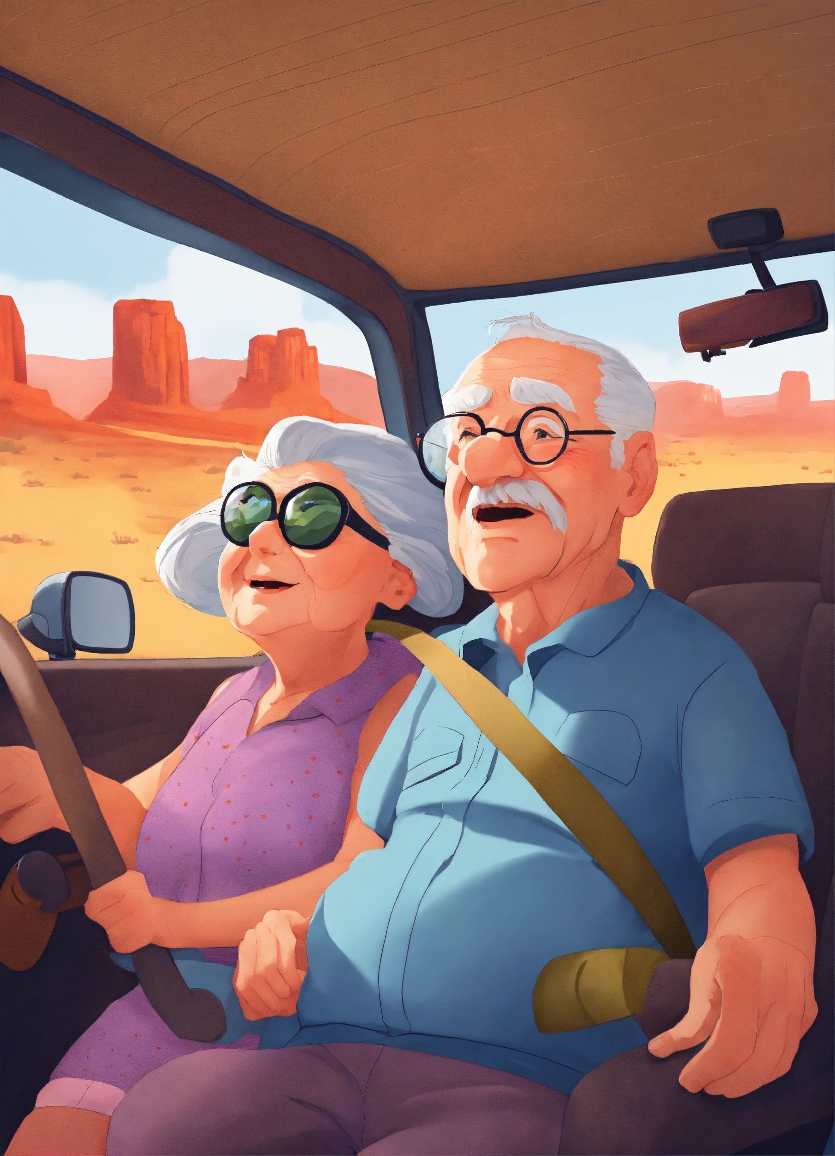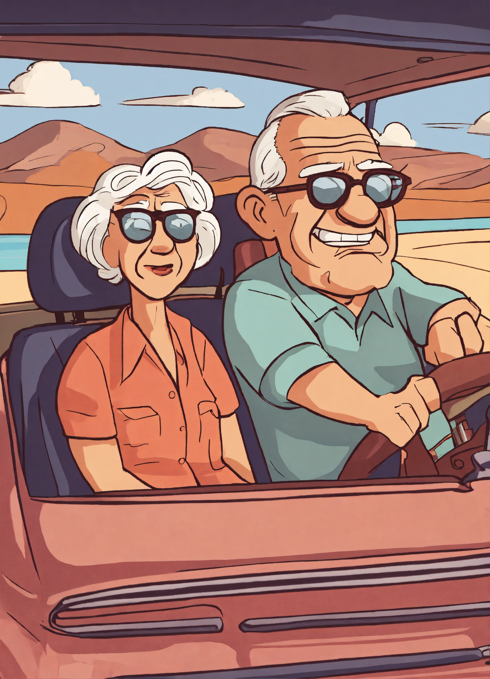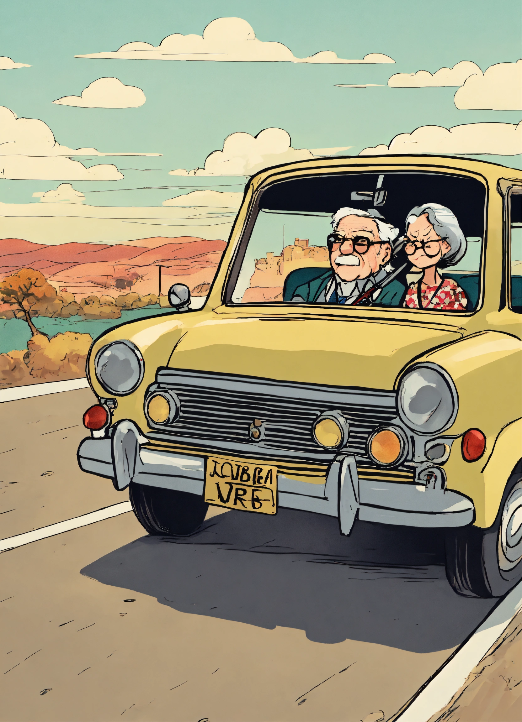 A cartoon of an old couple on a road trip, the man is driving, he is small and jolly-looking, the woman is large and grumpy-looking