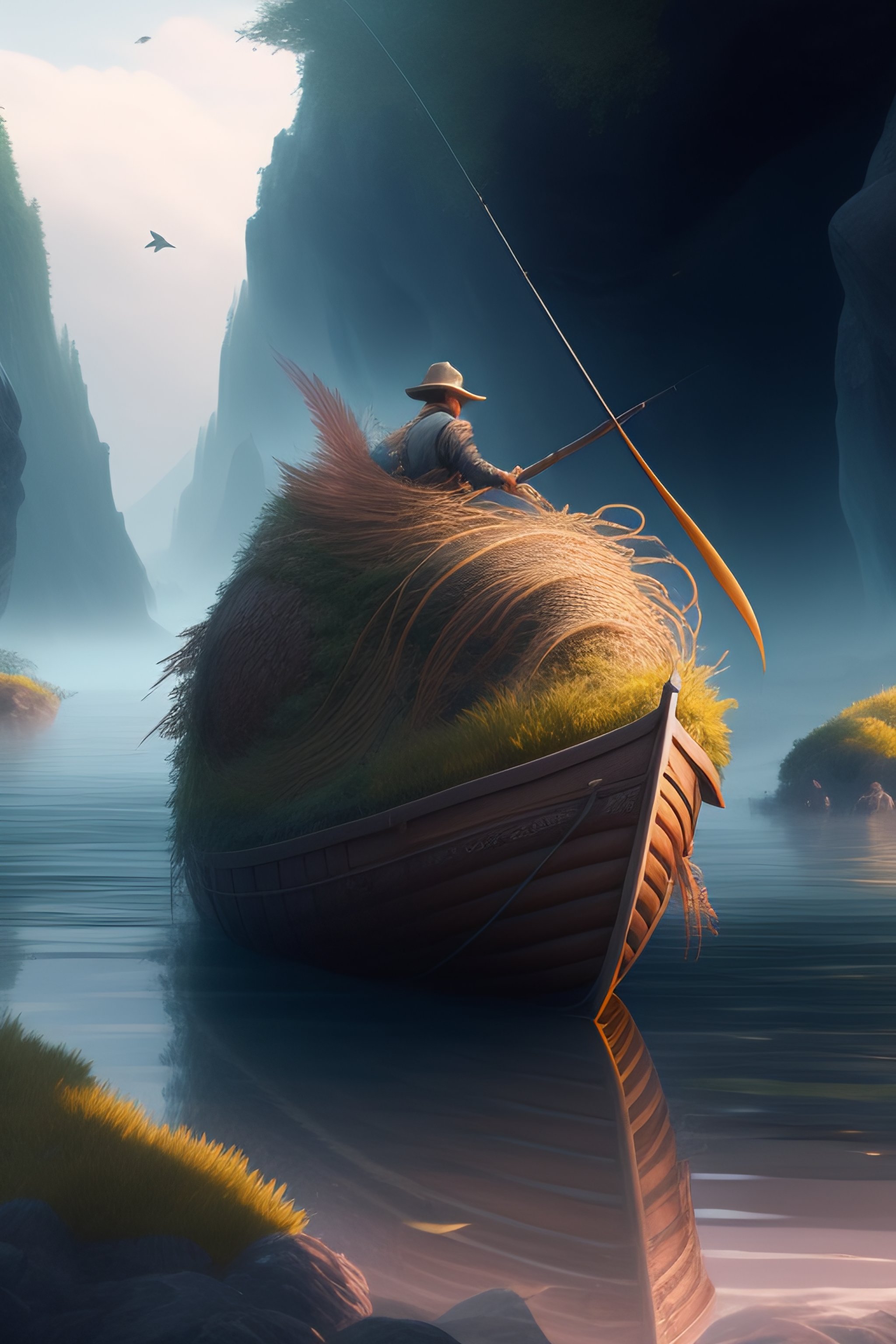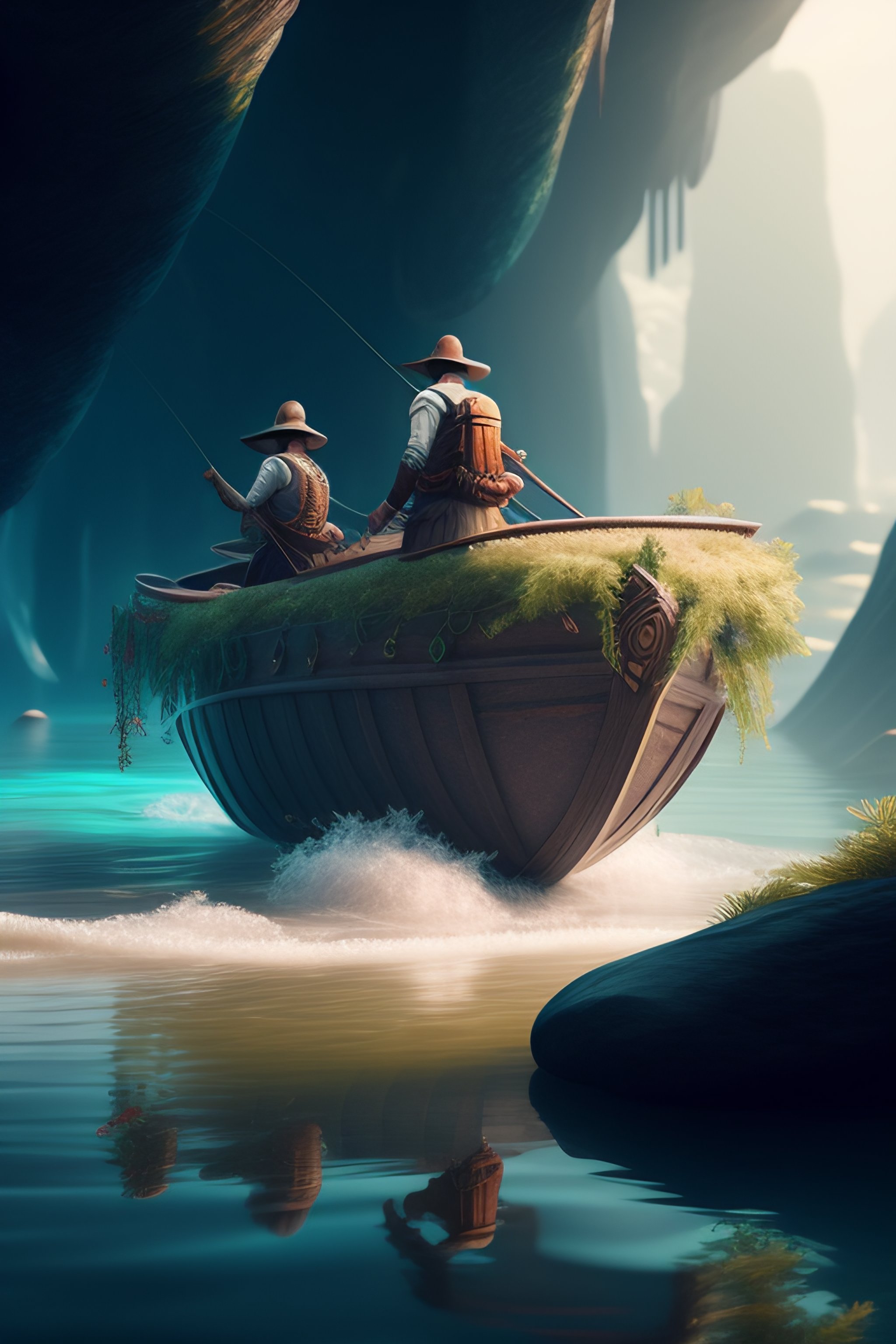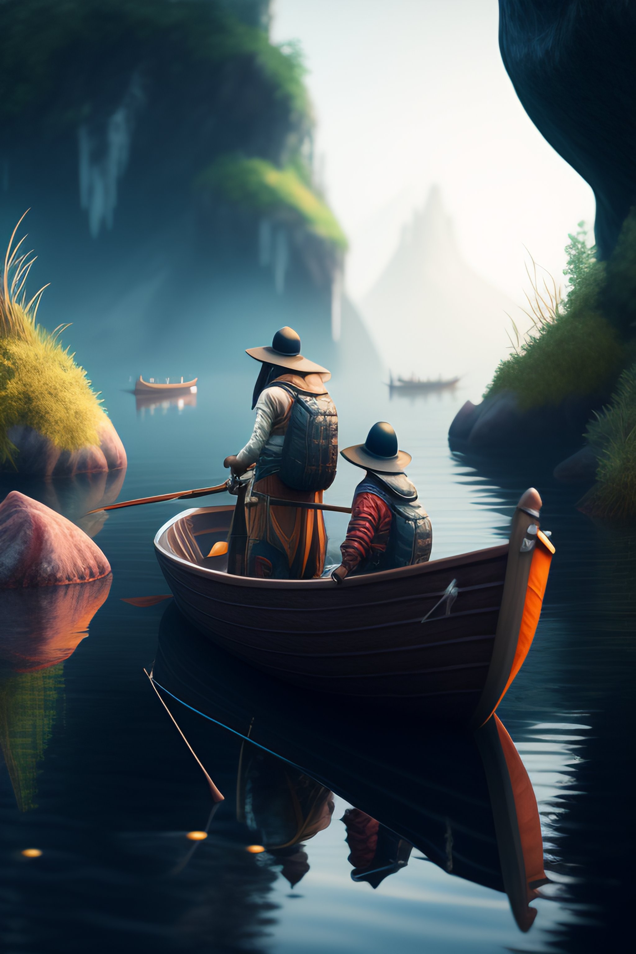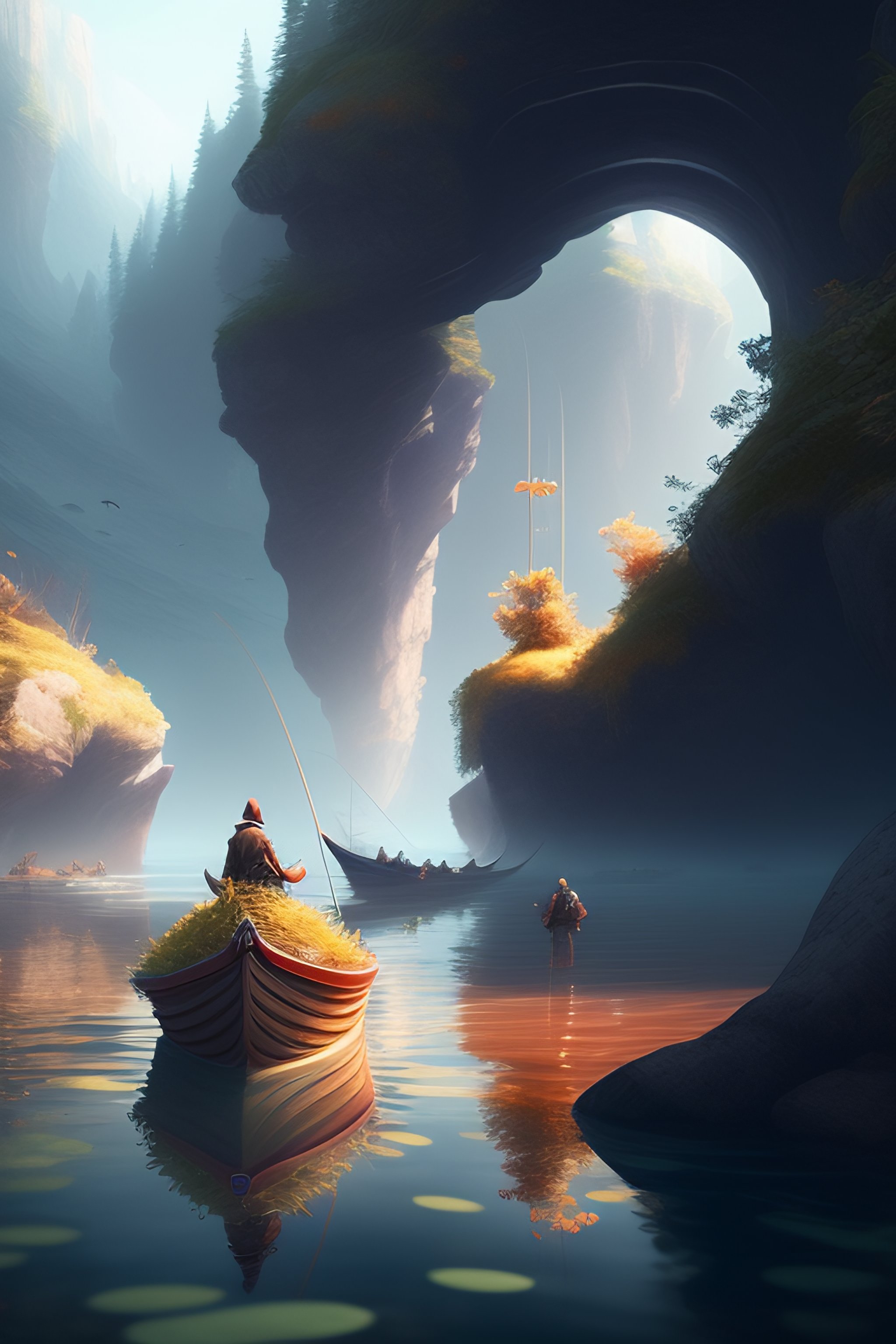 3 friends in a boat collecting a fishing net full of fish in a hidden river, scare, environment art, fantasy art, landscape art, in the style of greg rutkowski, illustration, epic, fantasy, intricate, hyper detailed, artstation, concept art, smooth, sharp focus, ray tracing, 8k