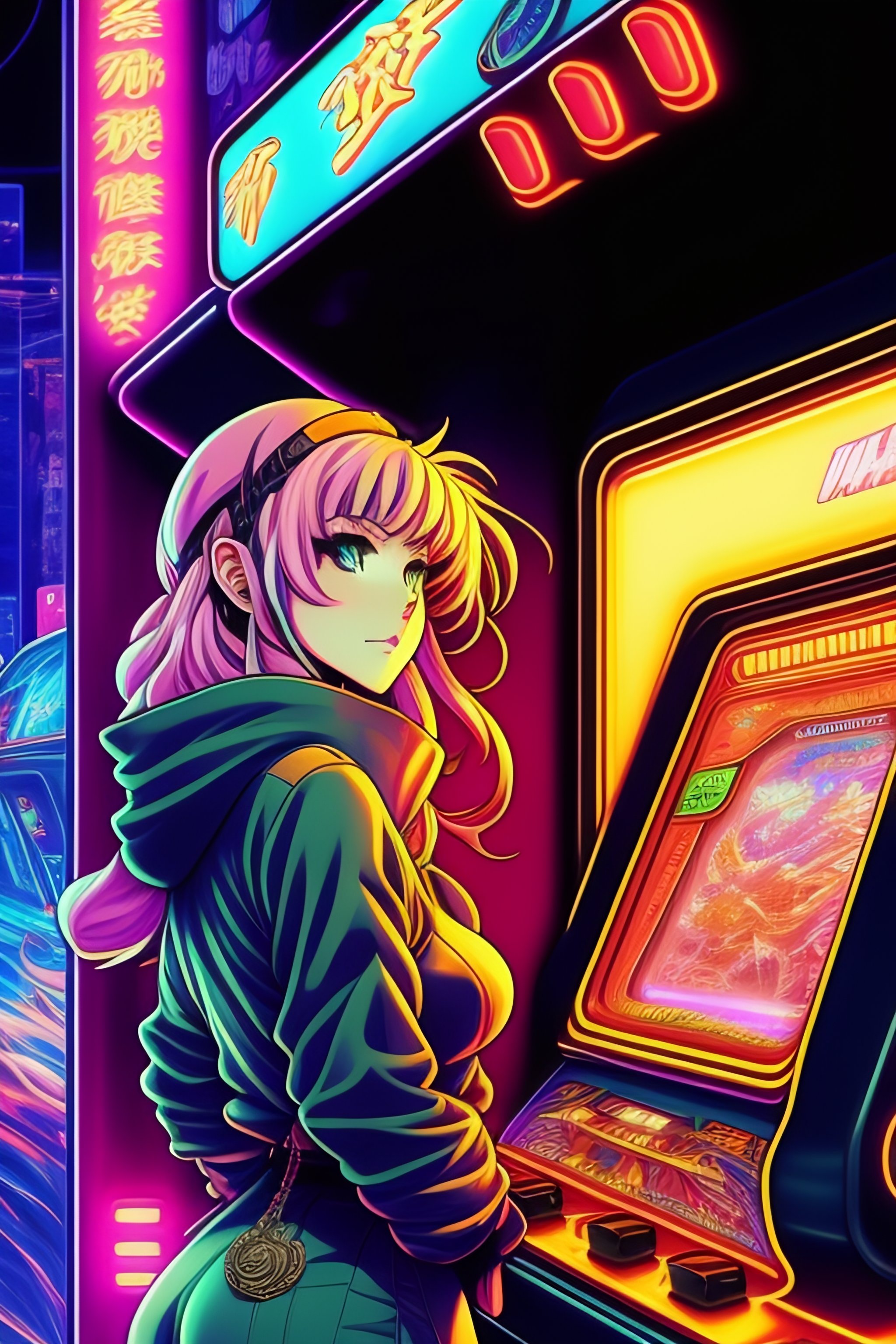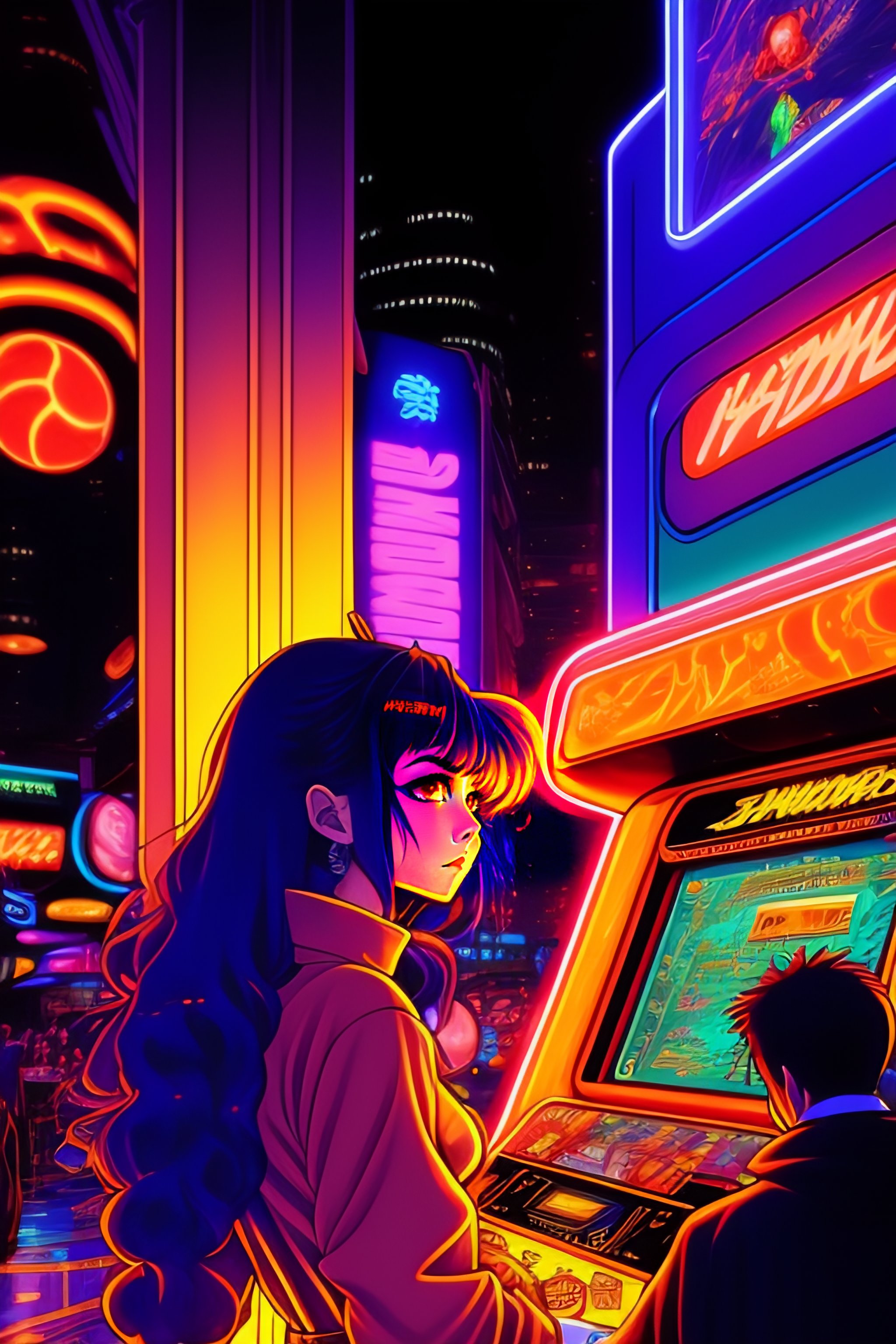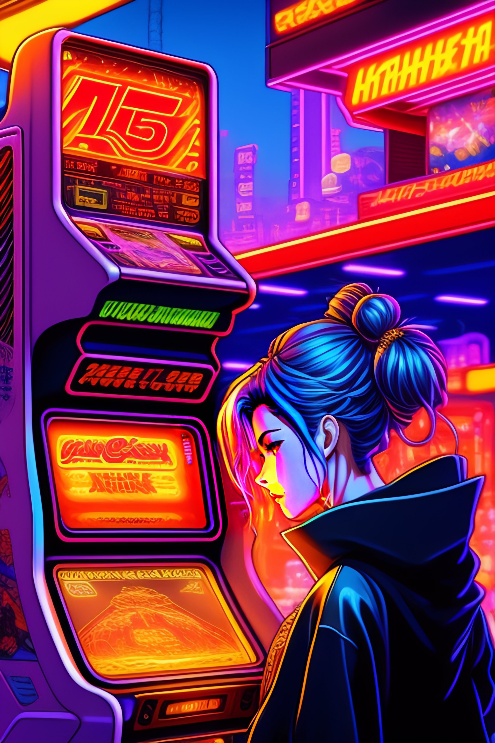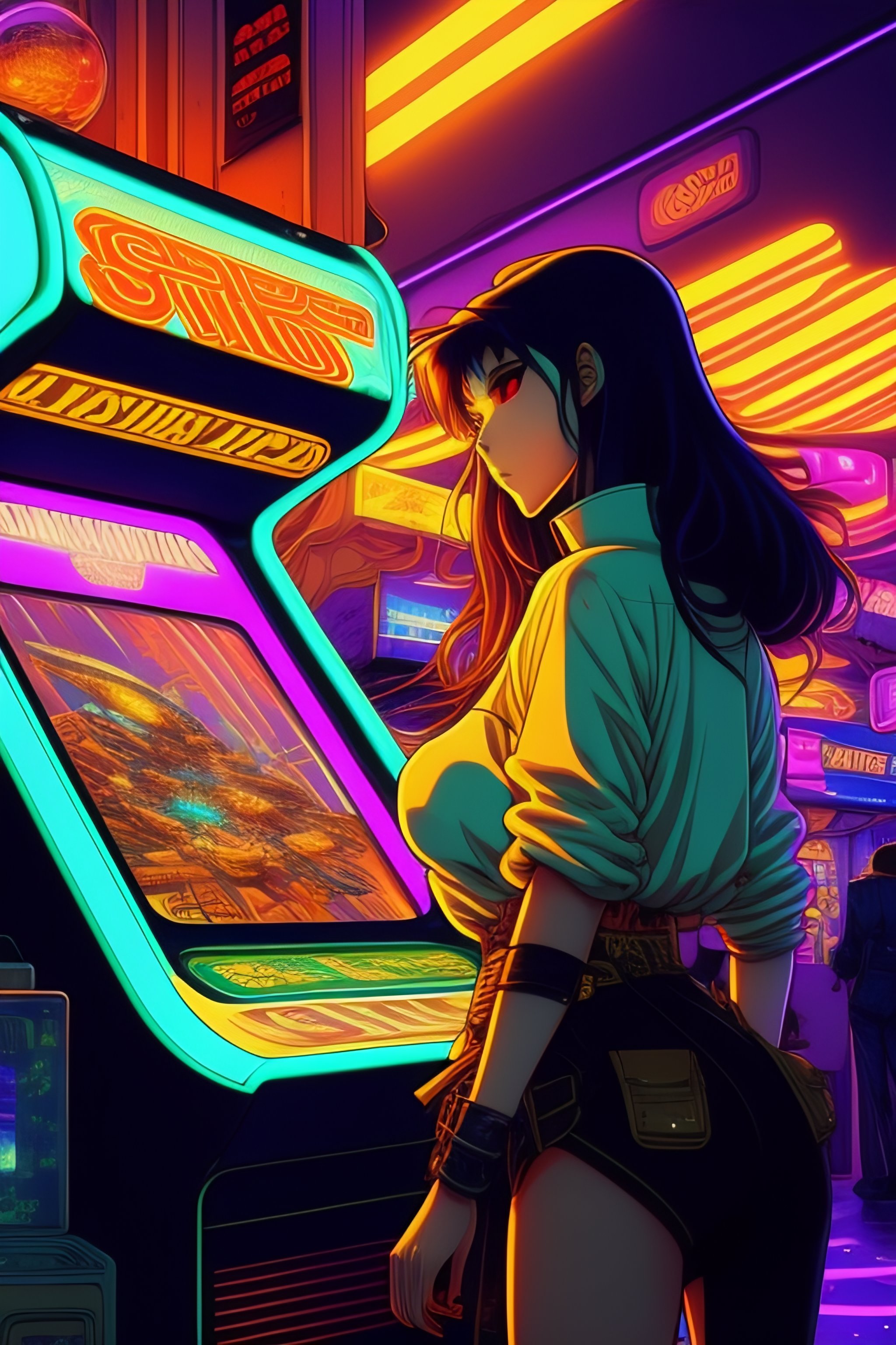 Vintage 90's anime style environmental wide shot of a chaotic arcade at night; a woman wearing streetwear playing an arcade game; by hajime sorayama, greg tocchini, virgil finlay, sci-fi. line art. environmental arcade art.