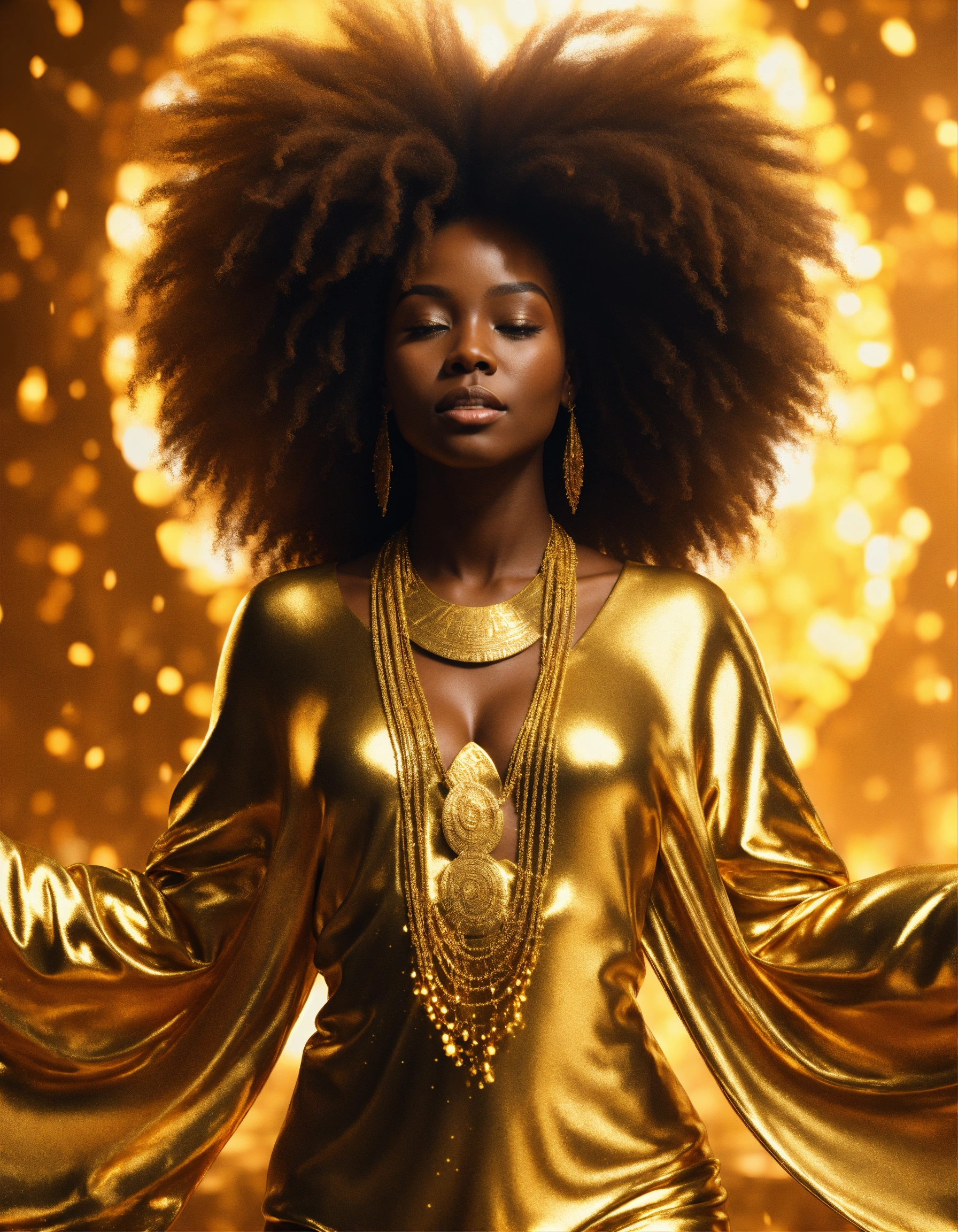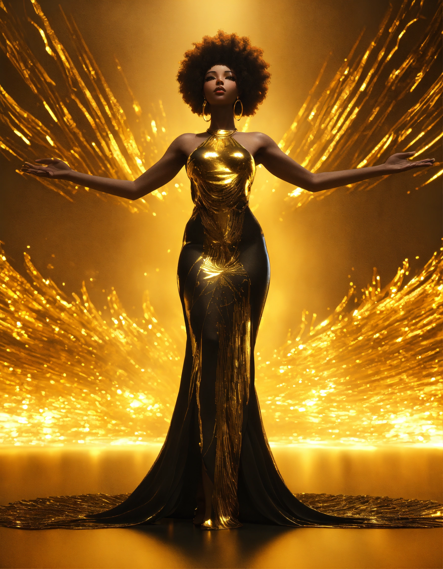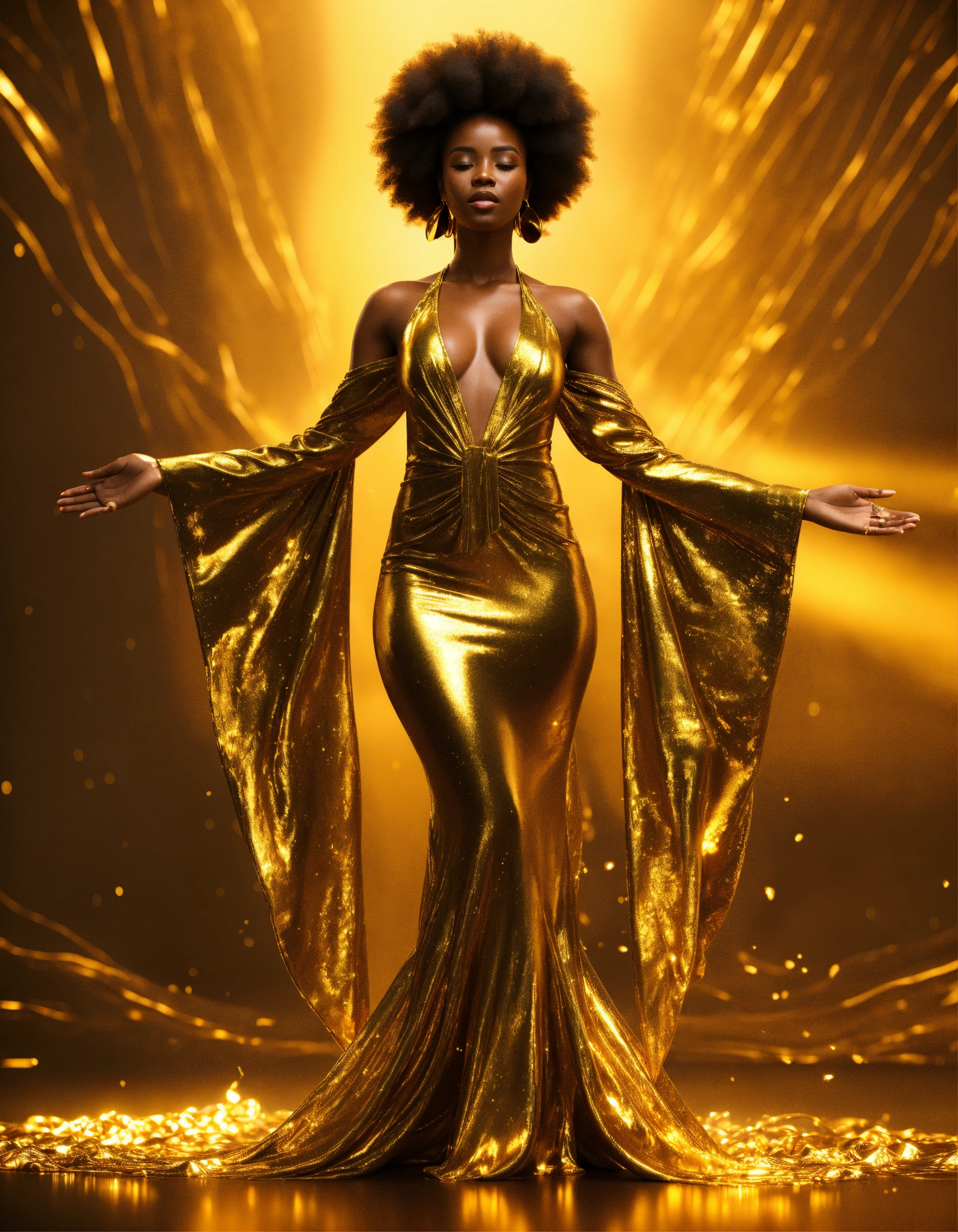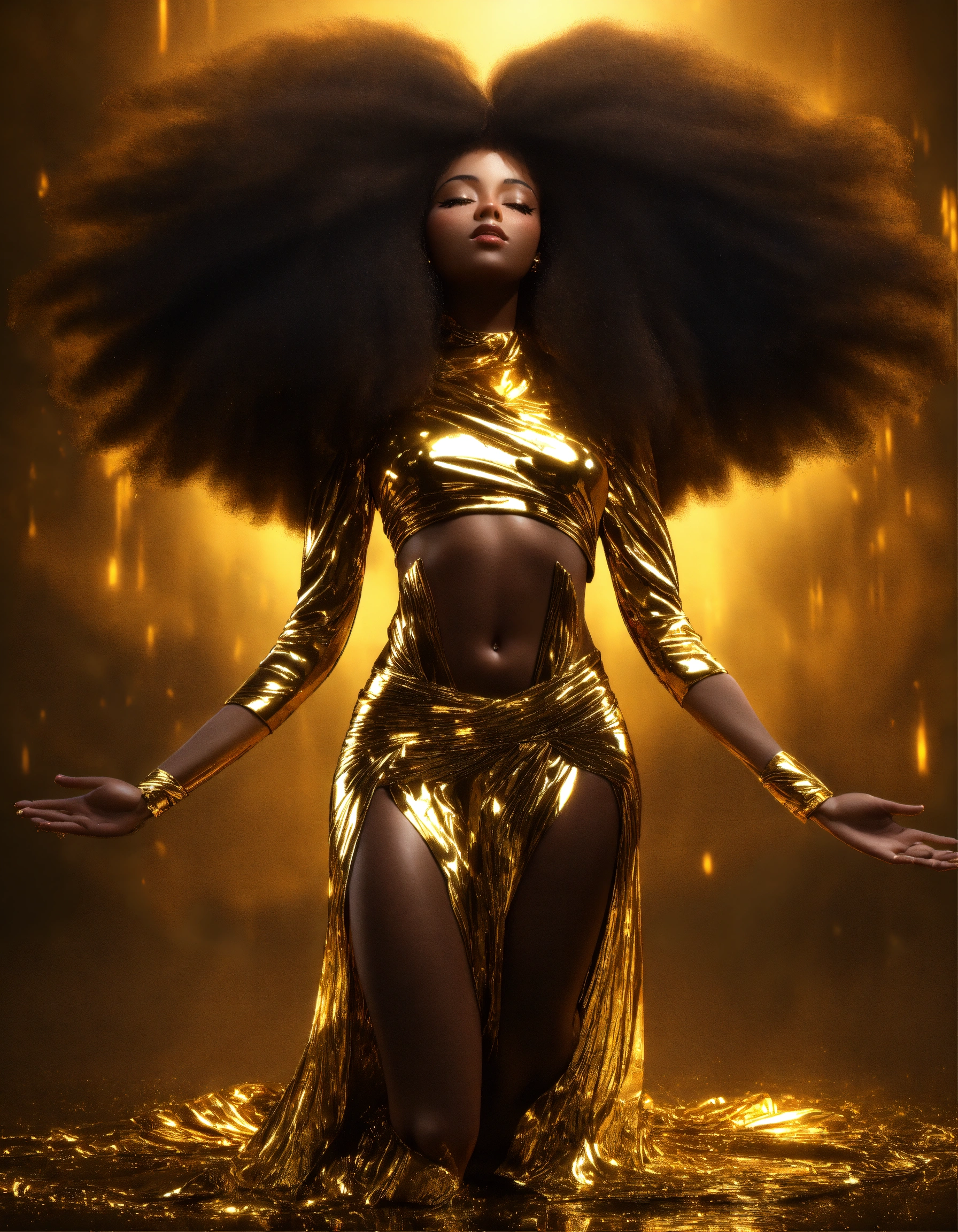 3d render of black woman with afro, full body shot, standing, arms outstretched to sides palms up, eyes open looking directly into camera, liquid gold flows through her entire face and body, illuminating her form from within, wearing long, flowing gold african style clothing