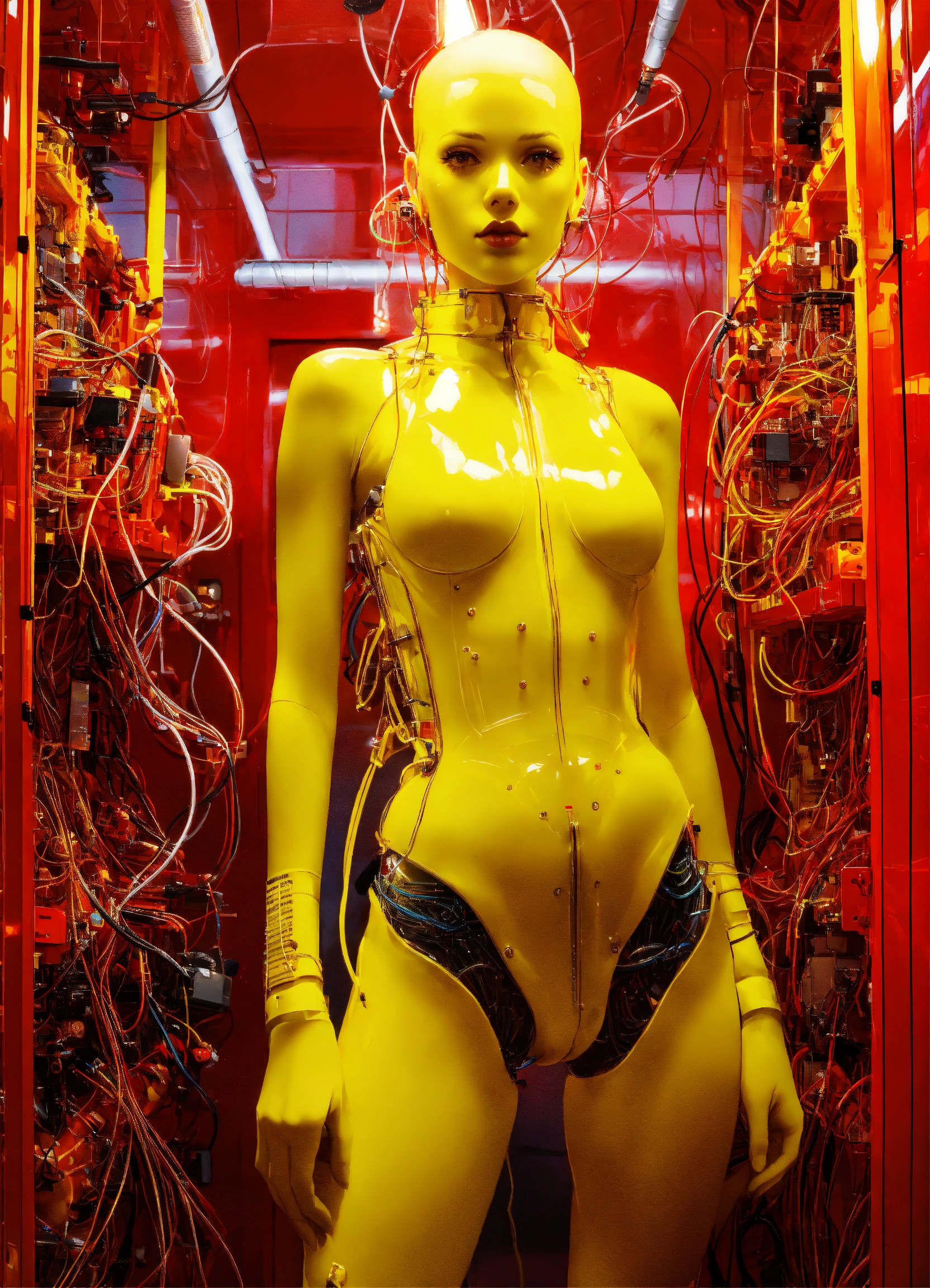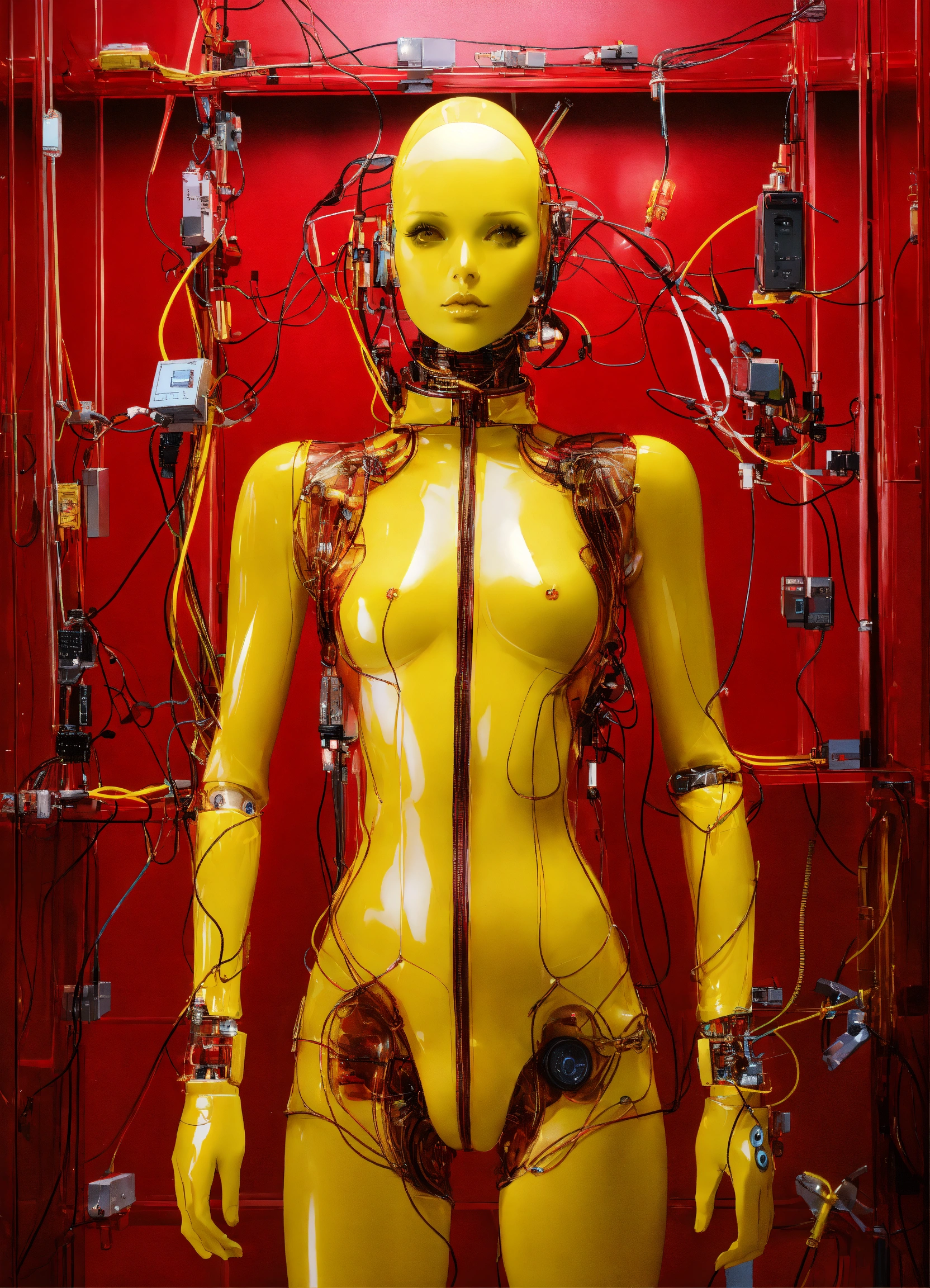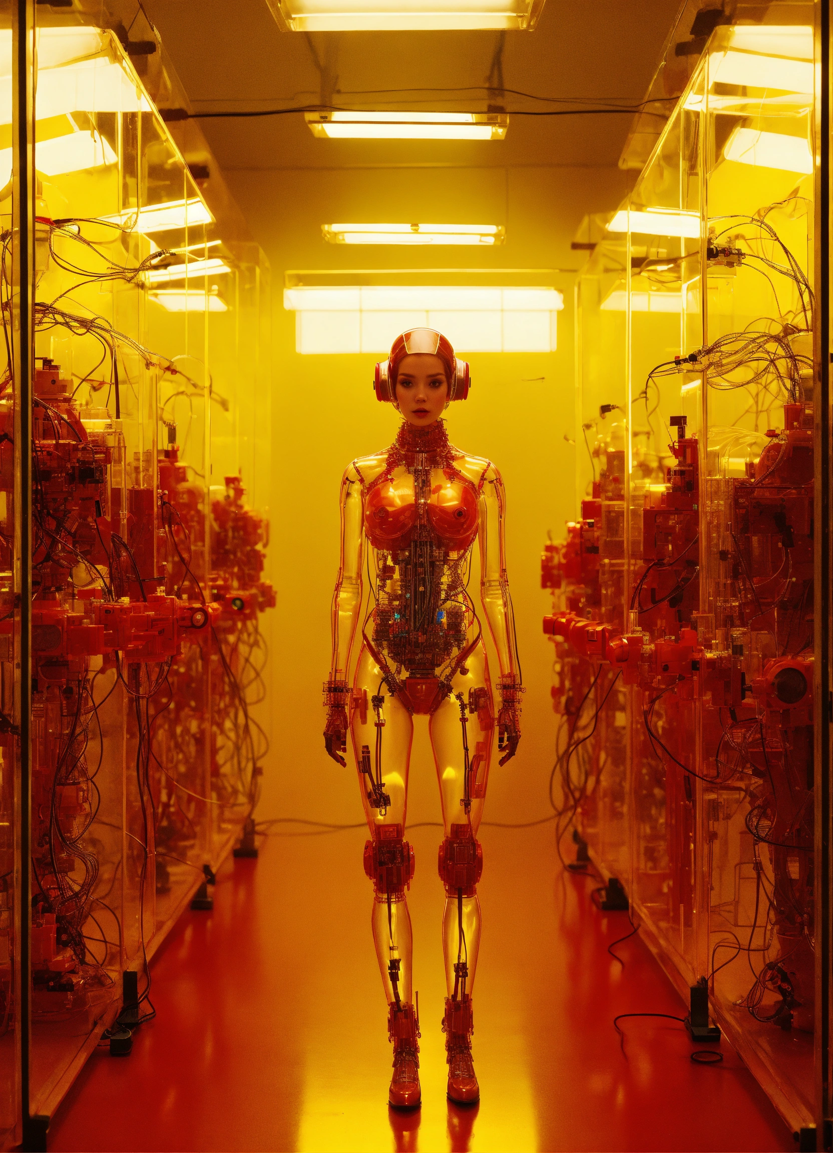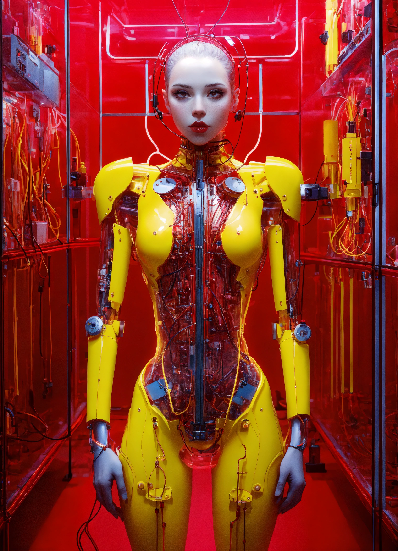 Body portrait photography, in a yellow laboratory full of cables and wires, standing an attractive transparent red plexiglass body cyborg robots, with ray guns, 80 degree view, art by sergio lopez, natalie shau, james jean and salvador dali