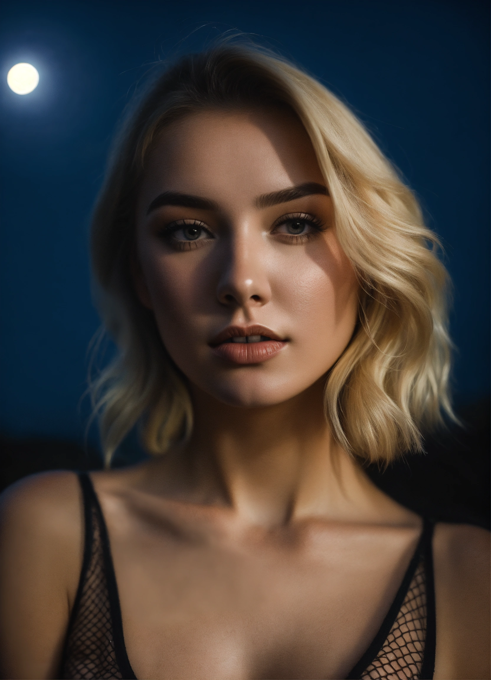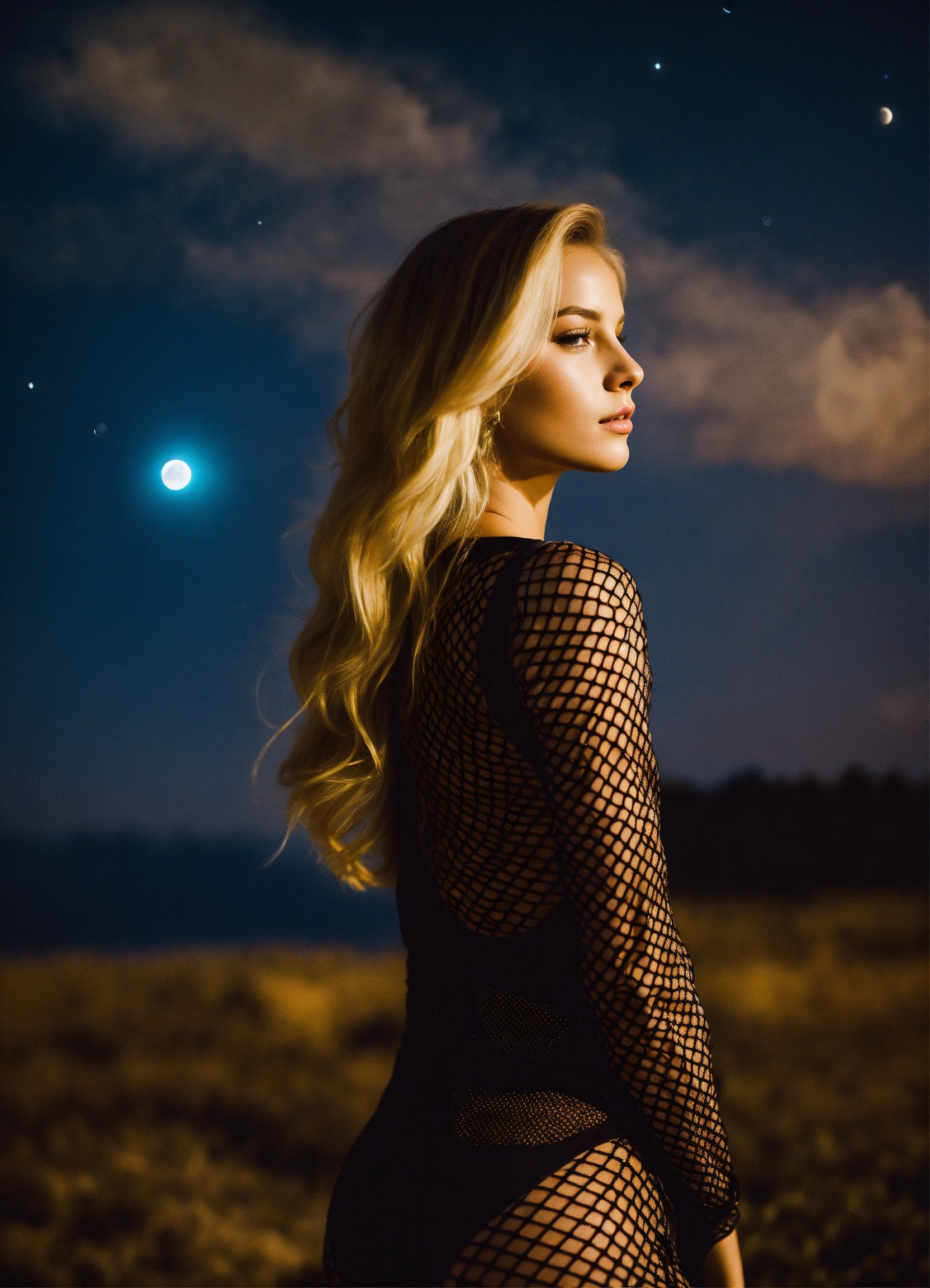 A real portrait photo of a lovely 22 year old very hot blonde girl she is wearing a fishnet catsuit, she looks very in loved, in the sky we see the moon and the milkyway