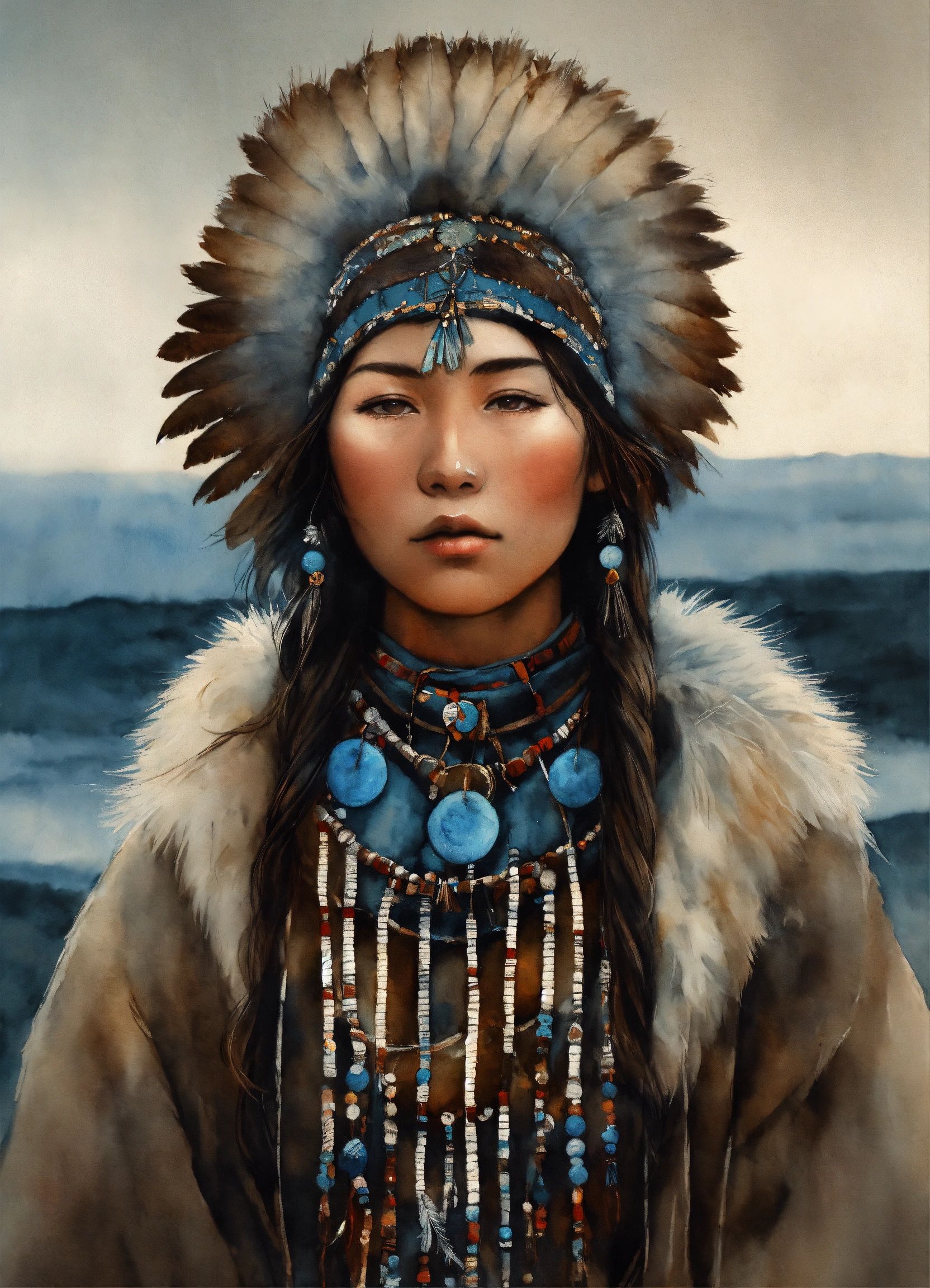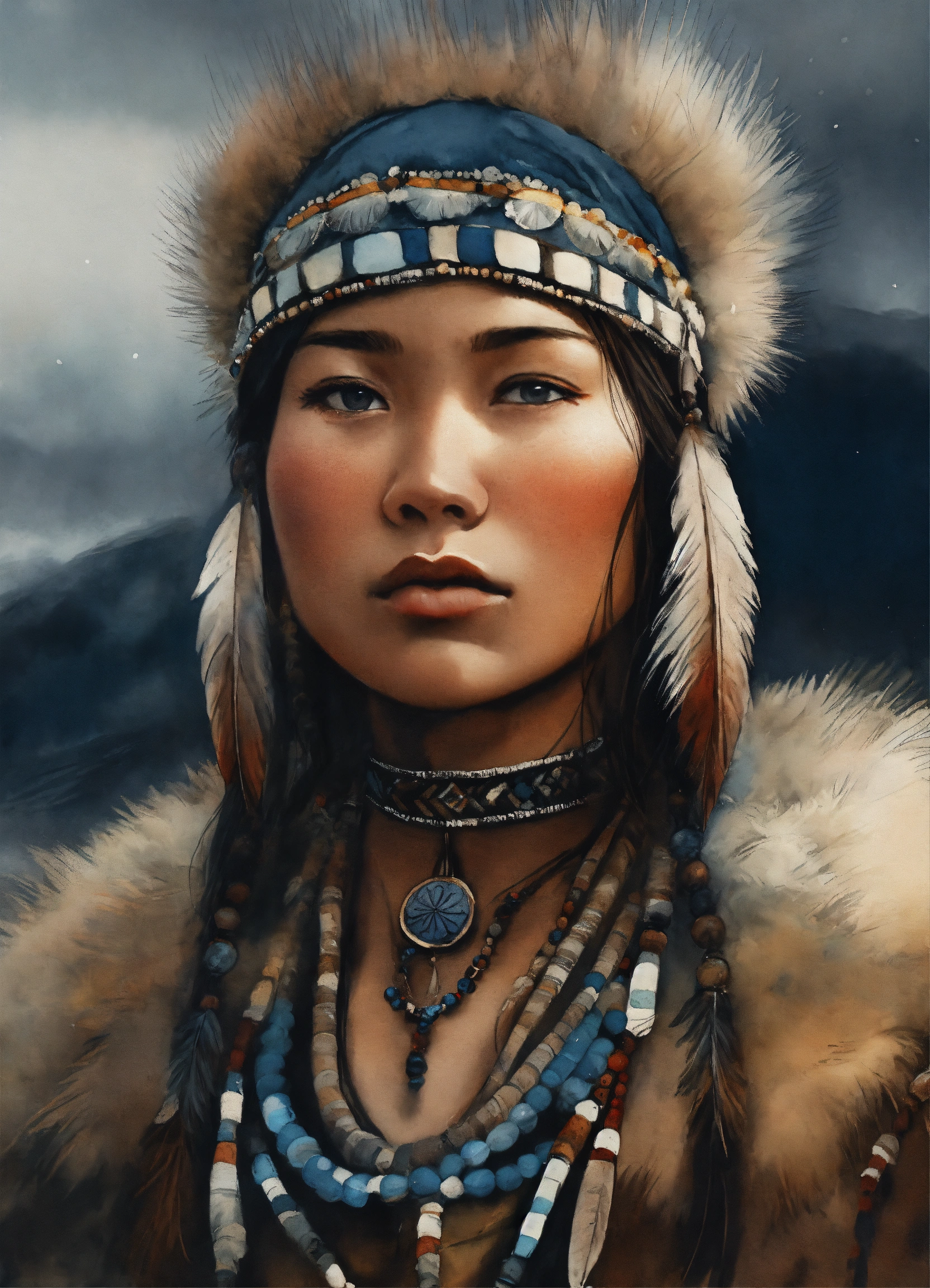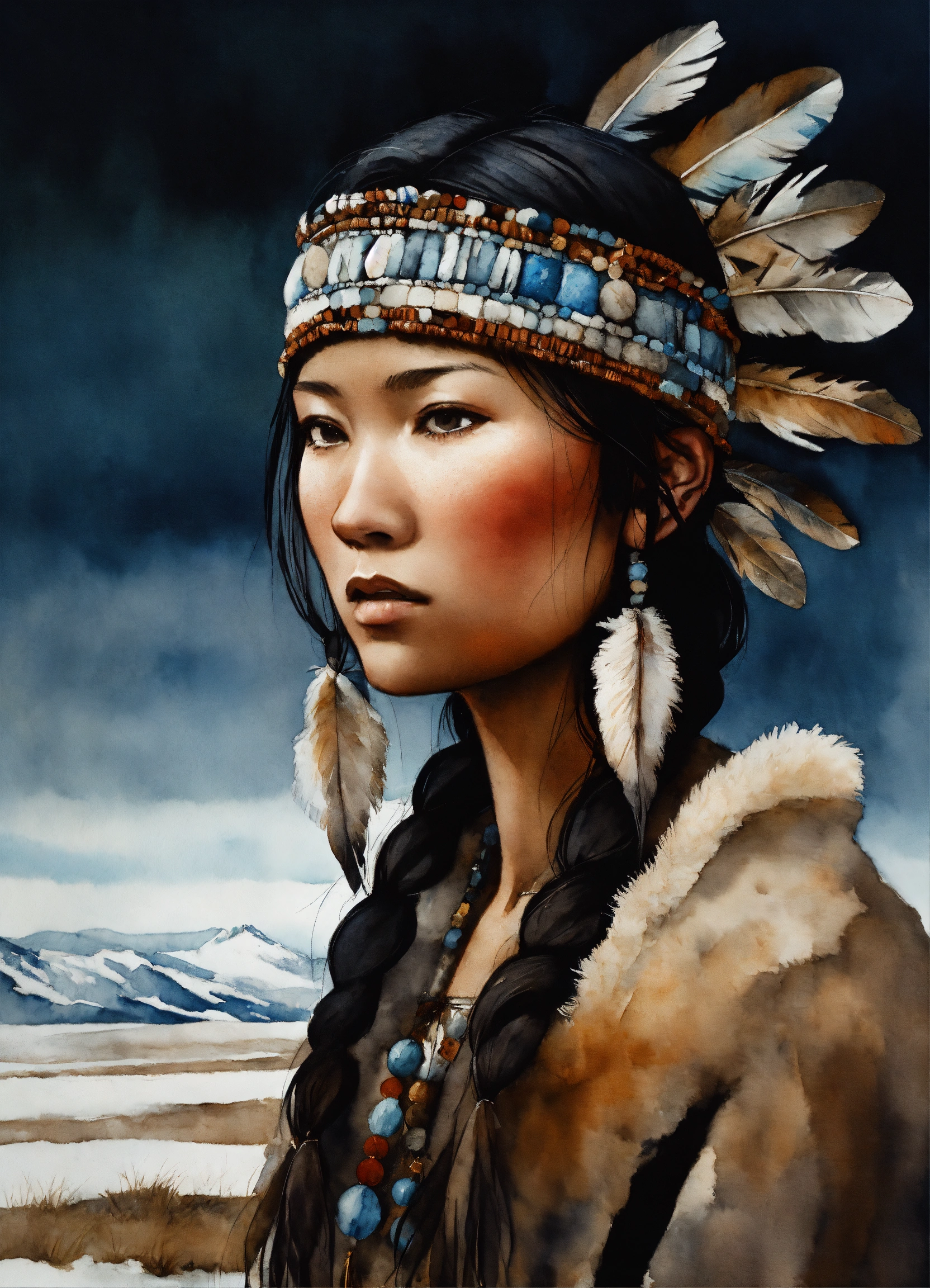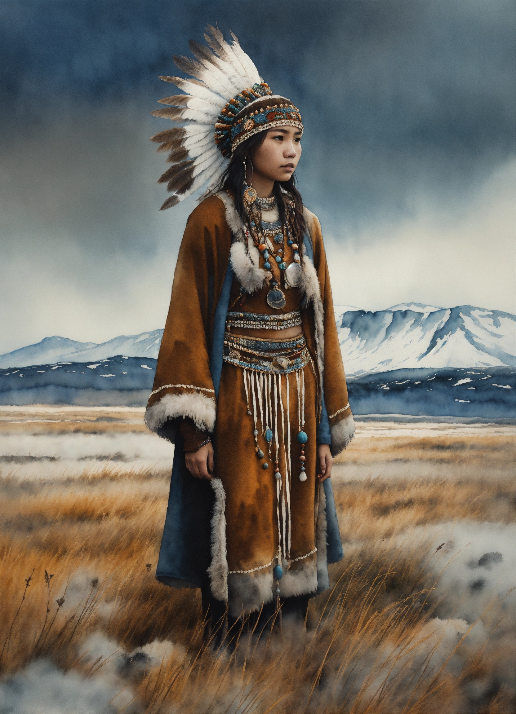 Chukchi woman, young, 18 years old, beautiful, wearing paleolithic customes, adorned with beads, shells and feathers, stading on the tundra steppe landscape with a minimalist look. illustration by tom björklund, watercolors, cool colors, dark colors, gloomy and depressing ambient, dramatic lighting, high detailed.