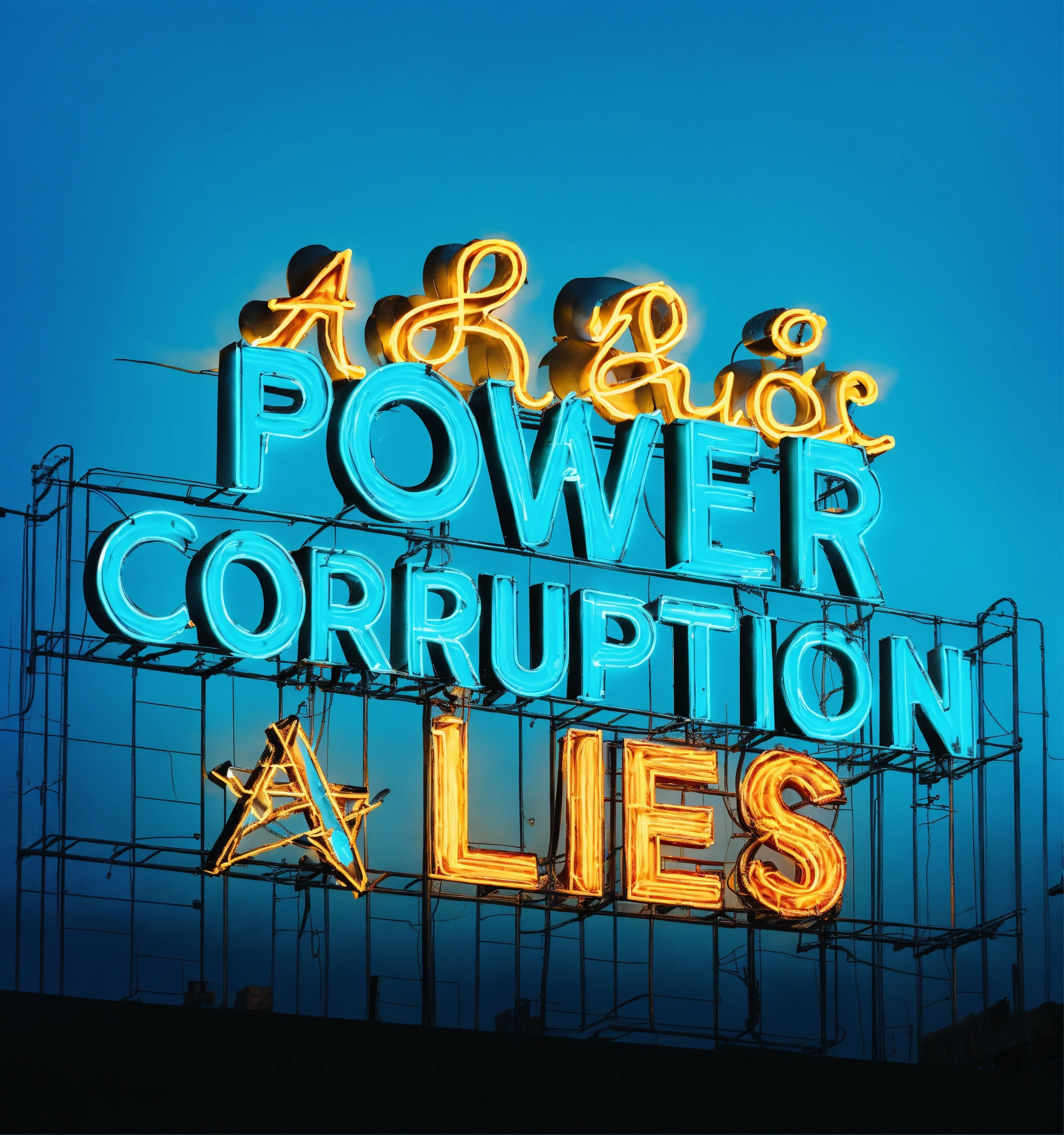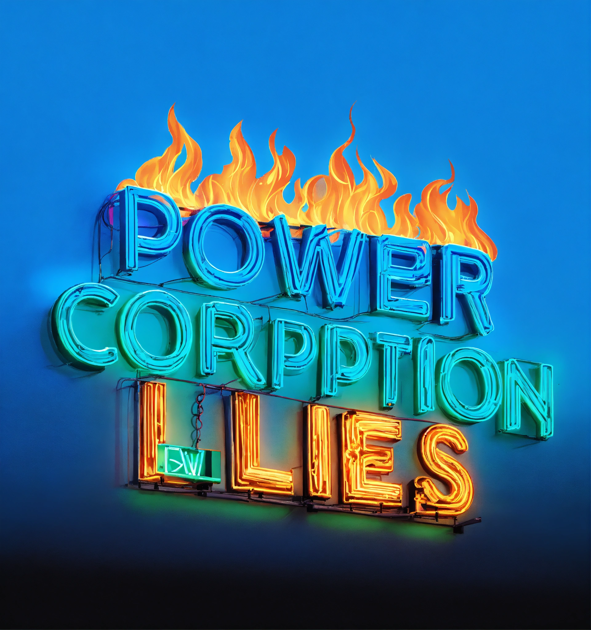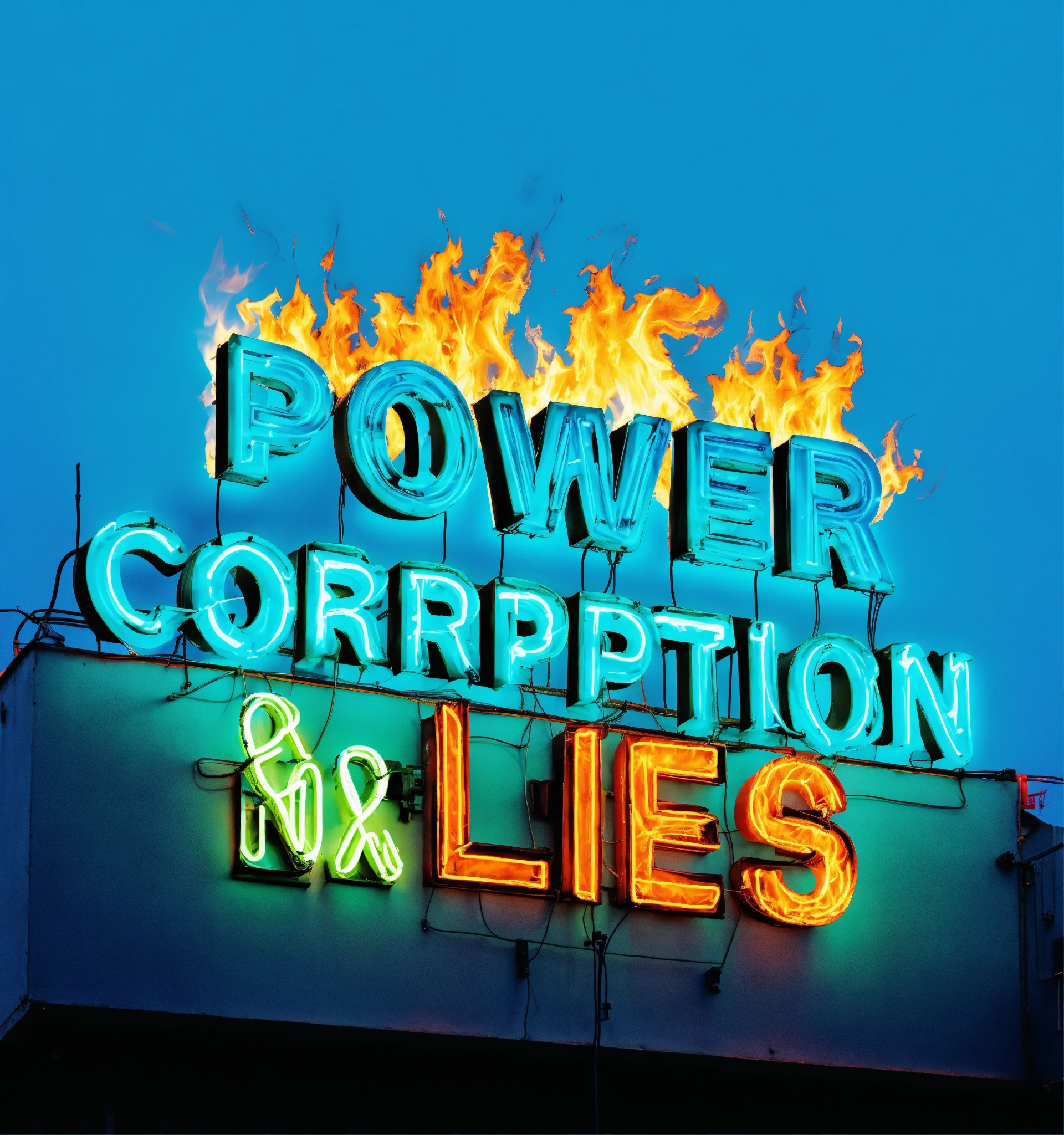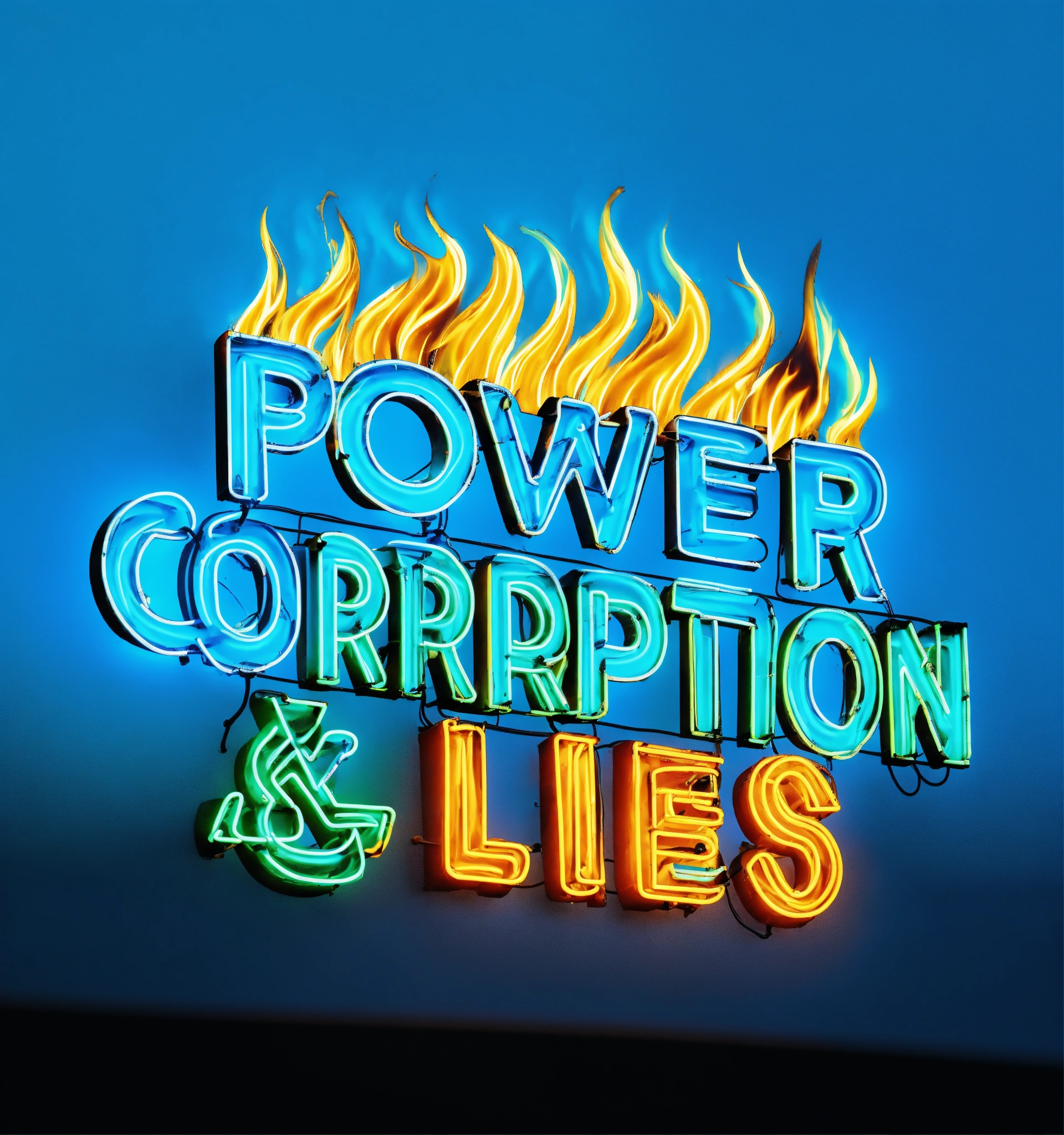 Make this image more realistic with harsh artificial light. first line should say "power", above this word, are flames, second line should say "corruption" third line & (ampersand) "lies" all this letters with neon sign aesthetic.