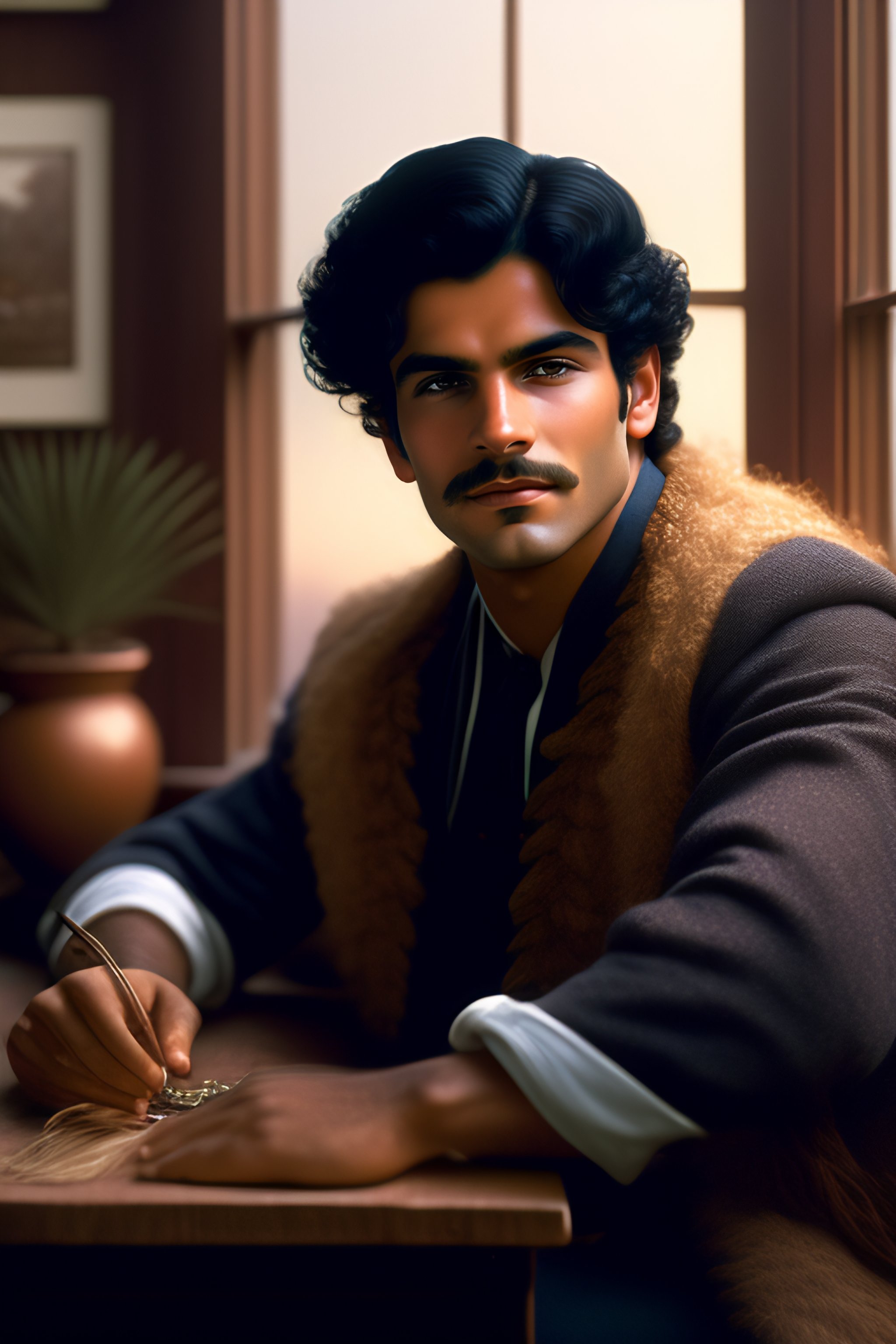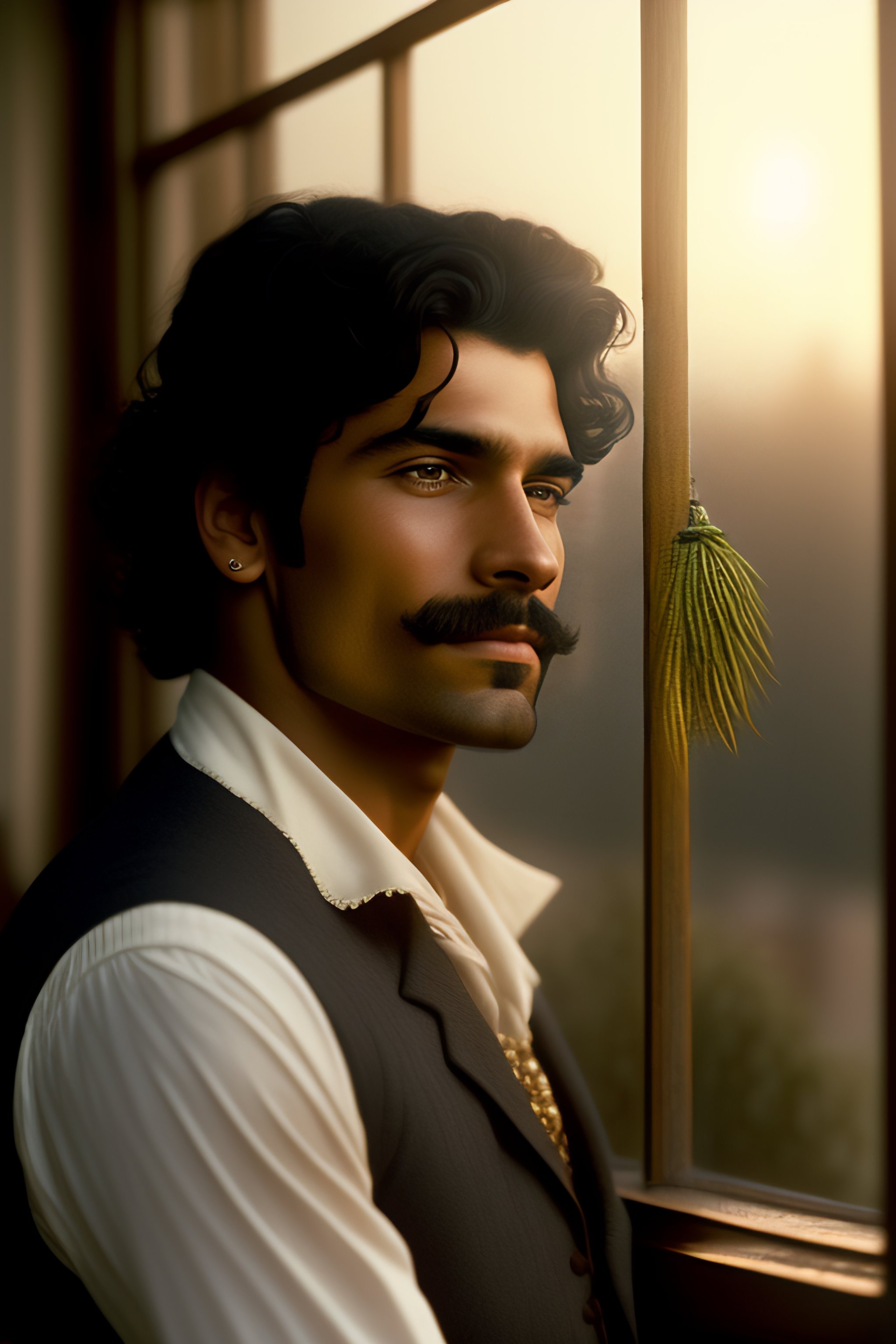 An exhausted young doomer wojack latino, with wavy slightly curly black hair in ponytail, in his studio sewing by his window, palm trees outside window in los angeles, key lighting, soft lights, foggy, by steve hanks, by lisa yuskavage, by serov valentin, by tarkovsky, 8 k render, detailed, very cute face, mexican oil painting 1900s