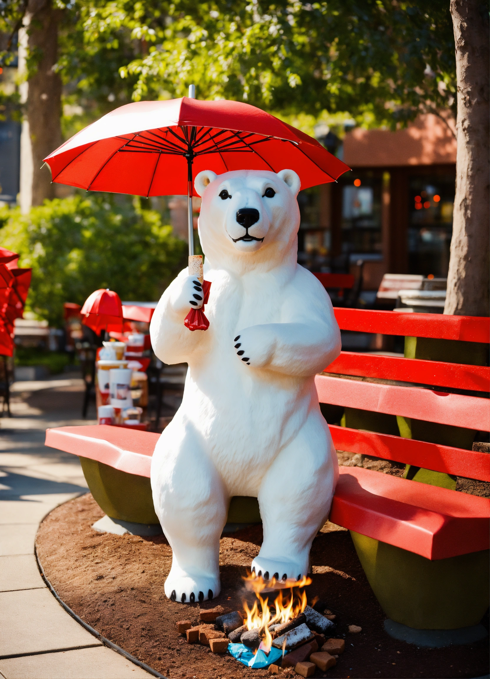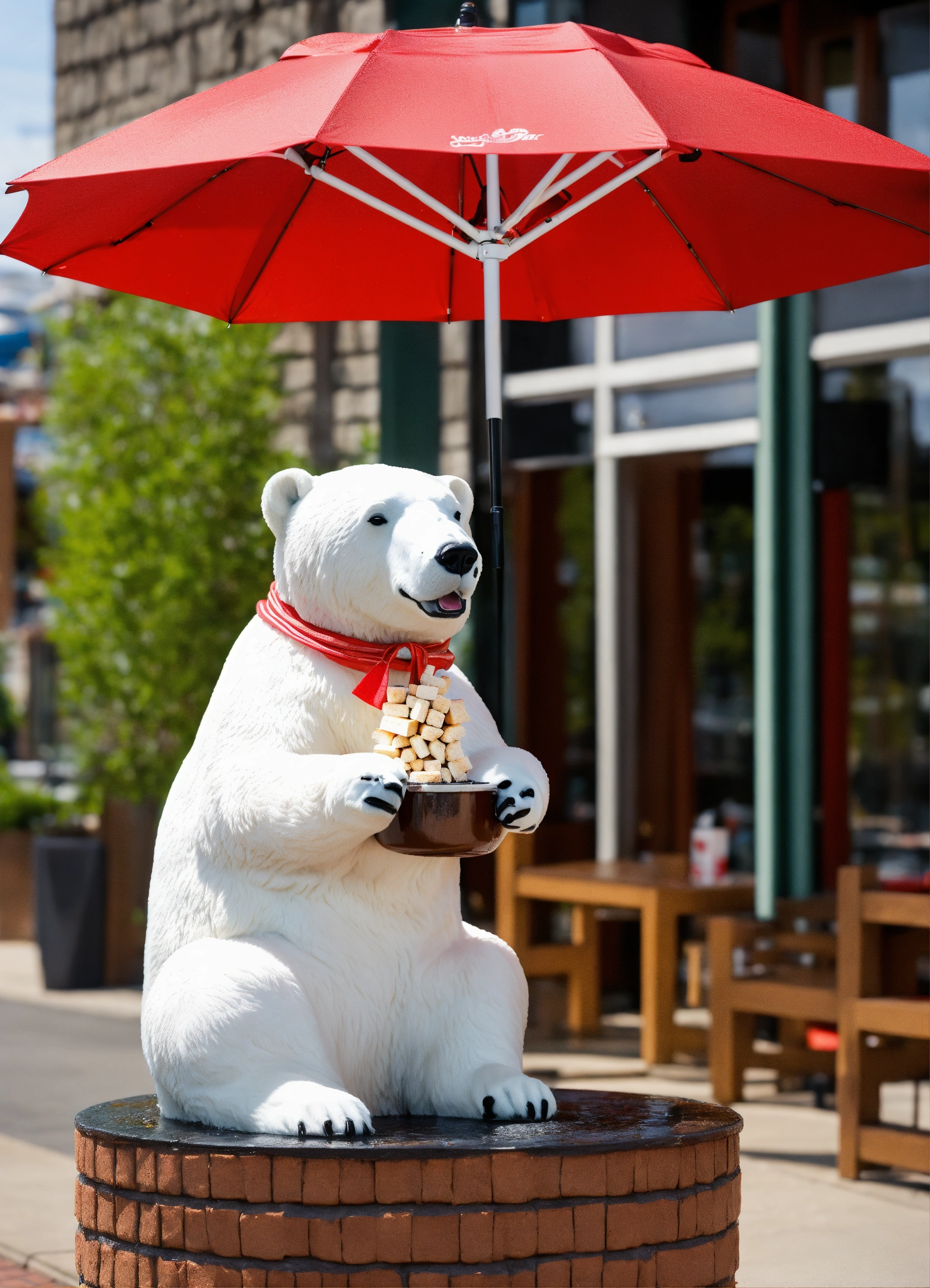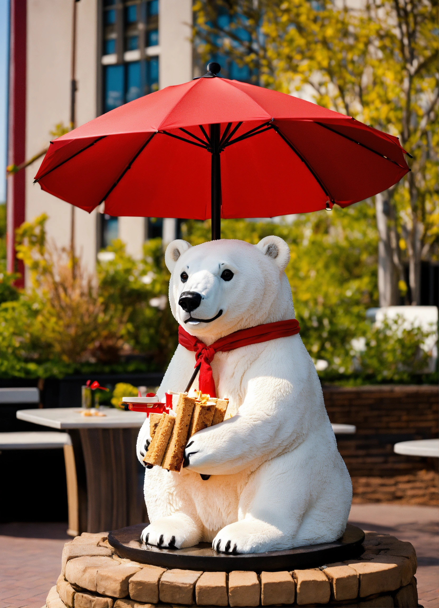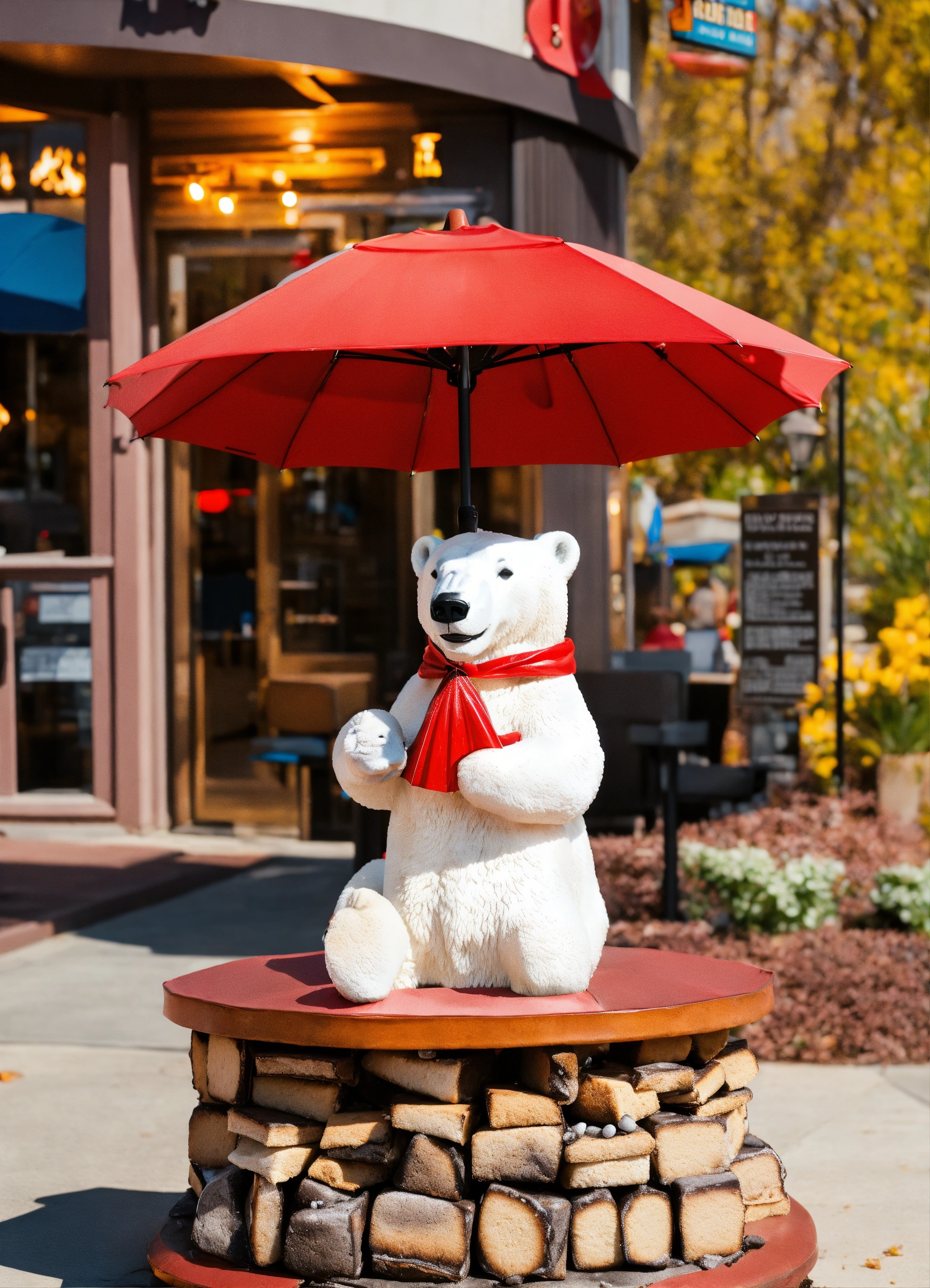 Polar bear statue holding a red umbrella and smores outside restaurant