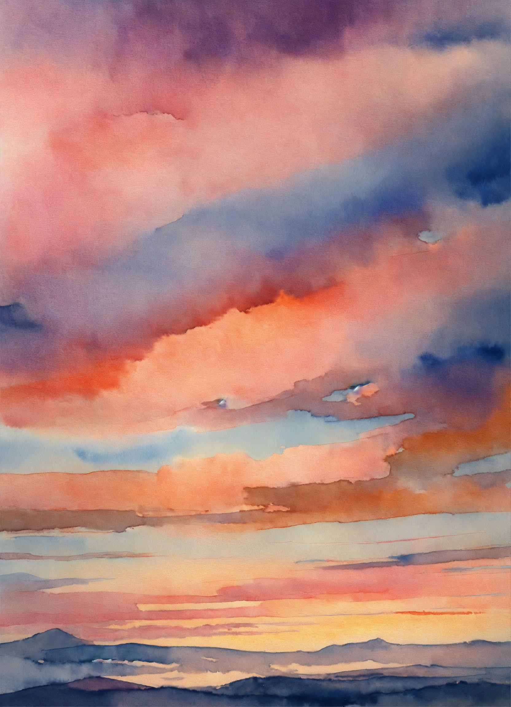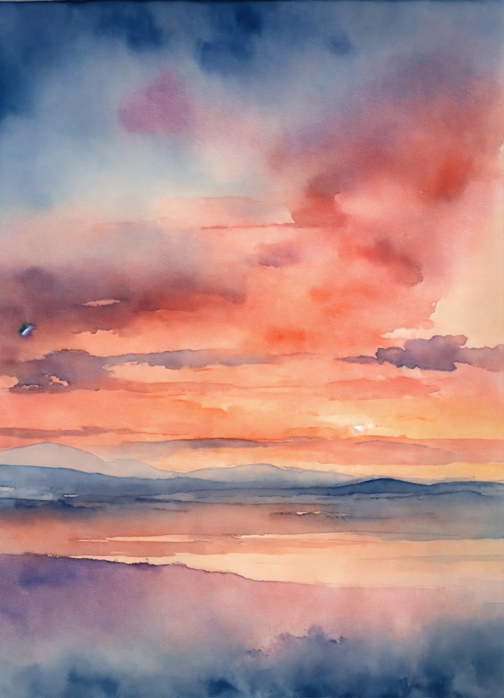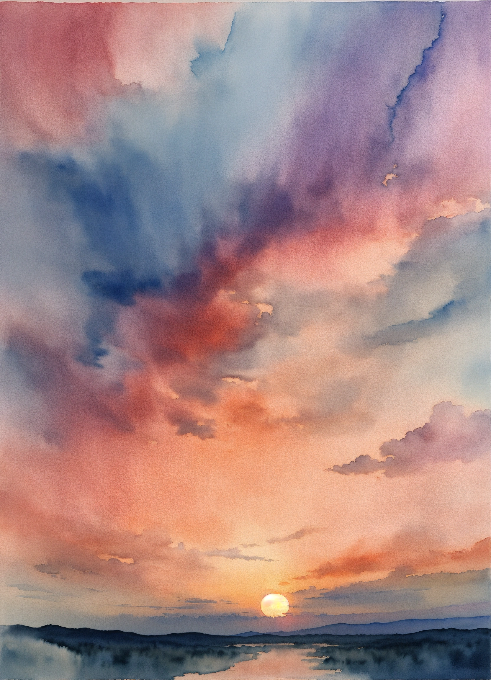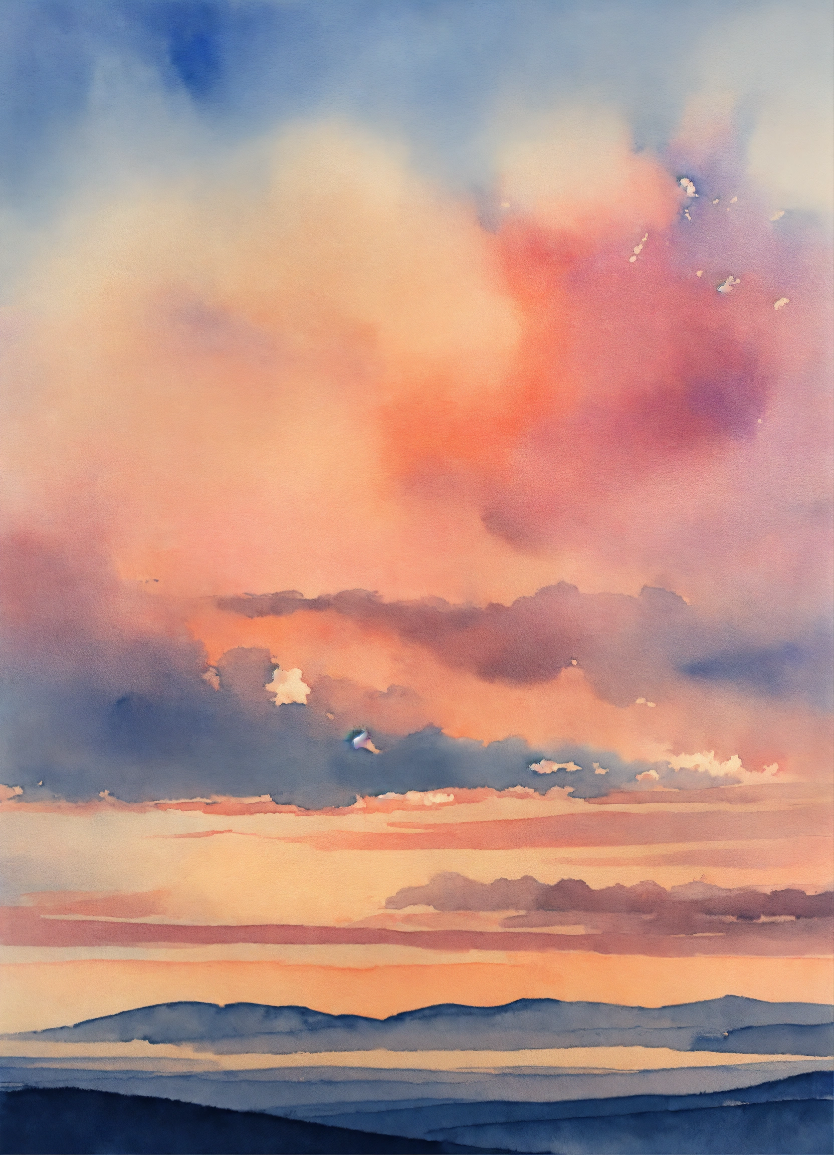 Watercolor sunset with muted colors of blue