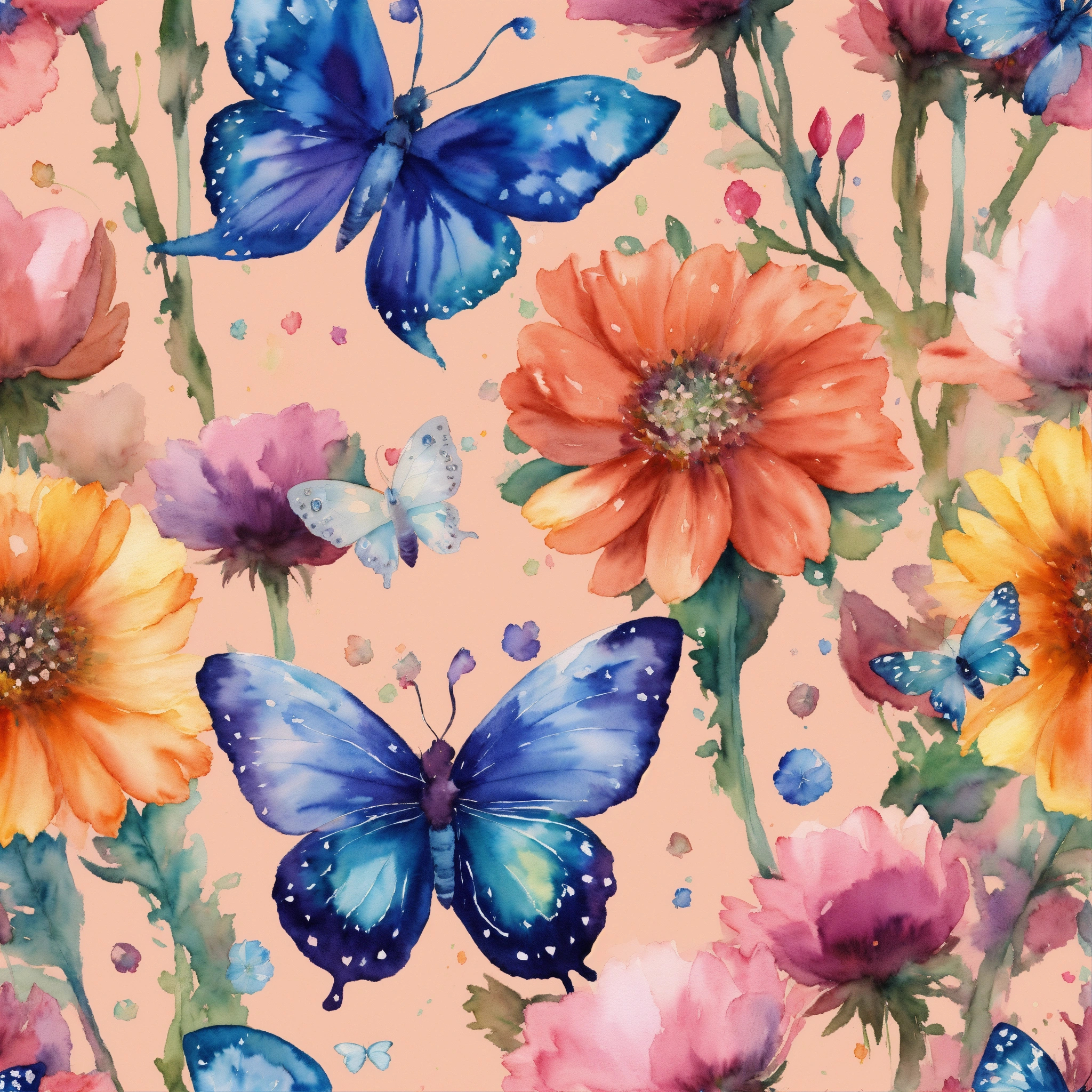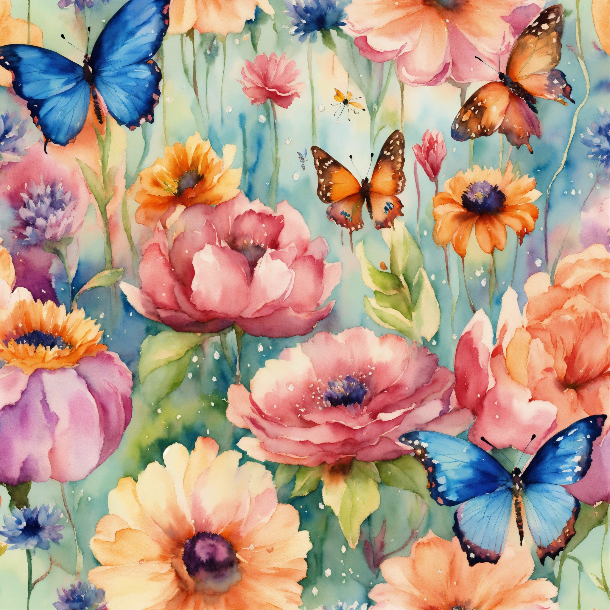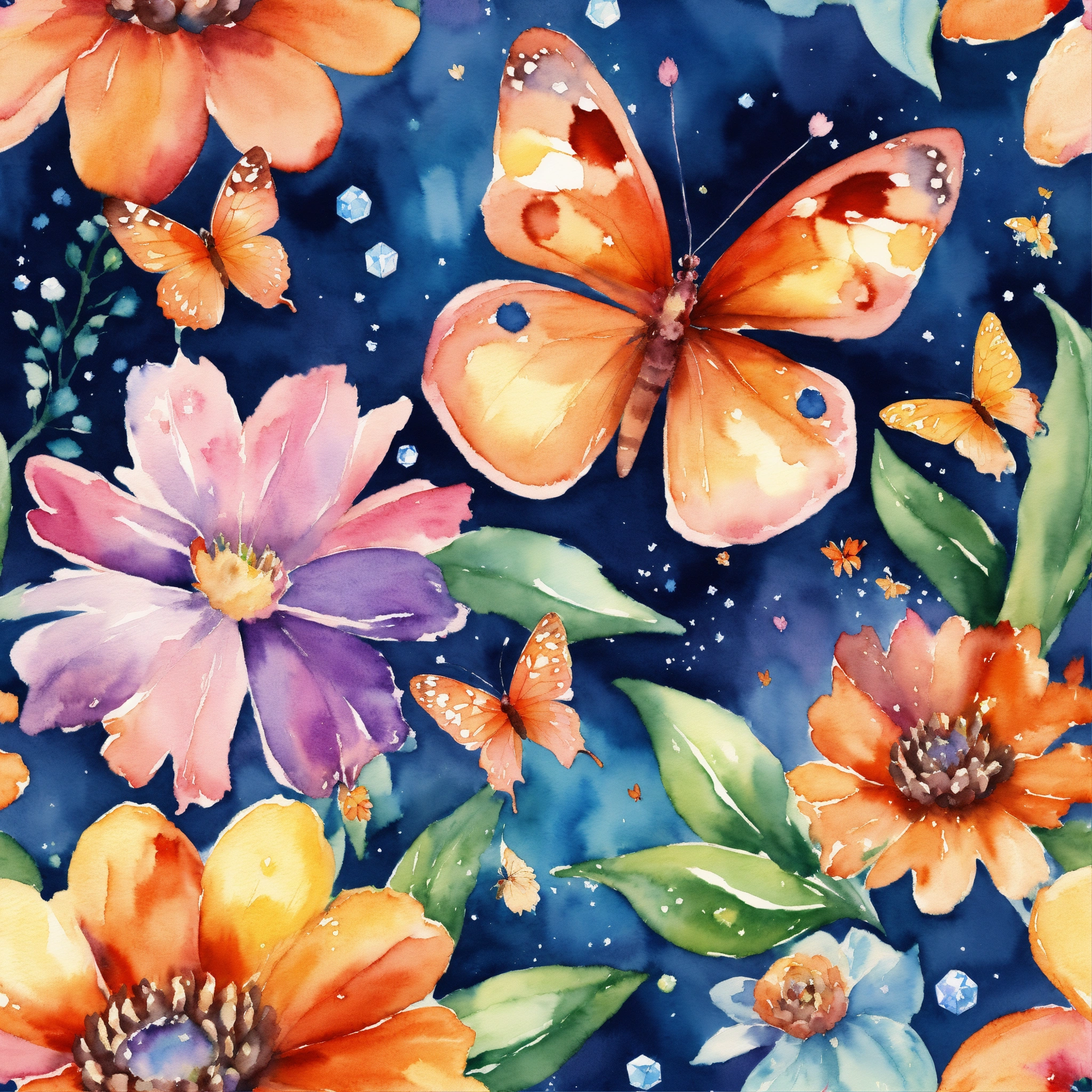 Floral vignette, colorful paint dripping flowers, diamonds, butterflies. intricate detail, illustration, painting, whimsical, dreamlike. butterflies, cartoon ghibli style . watercolor. seamless pattern