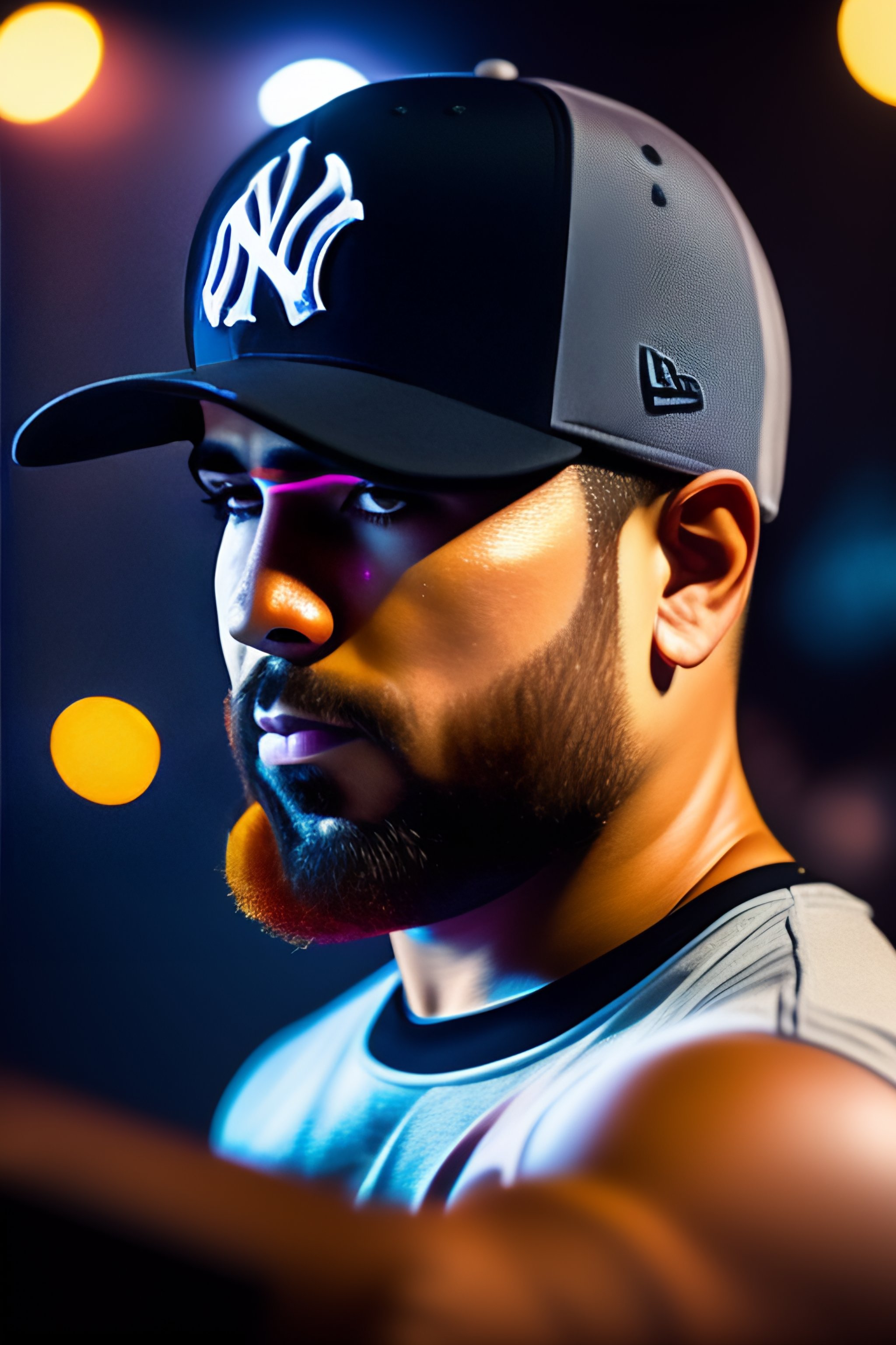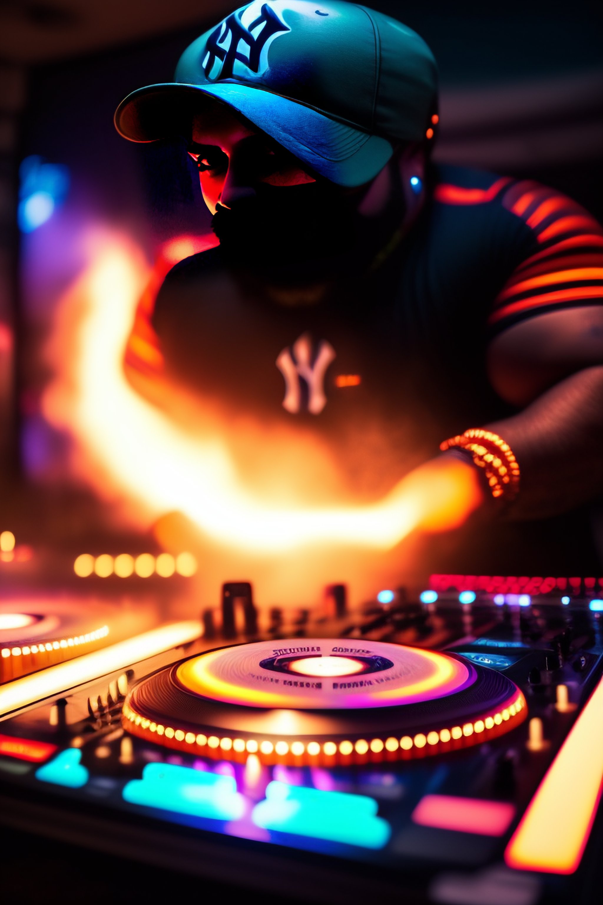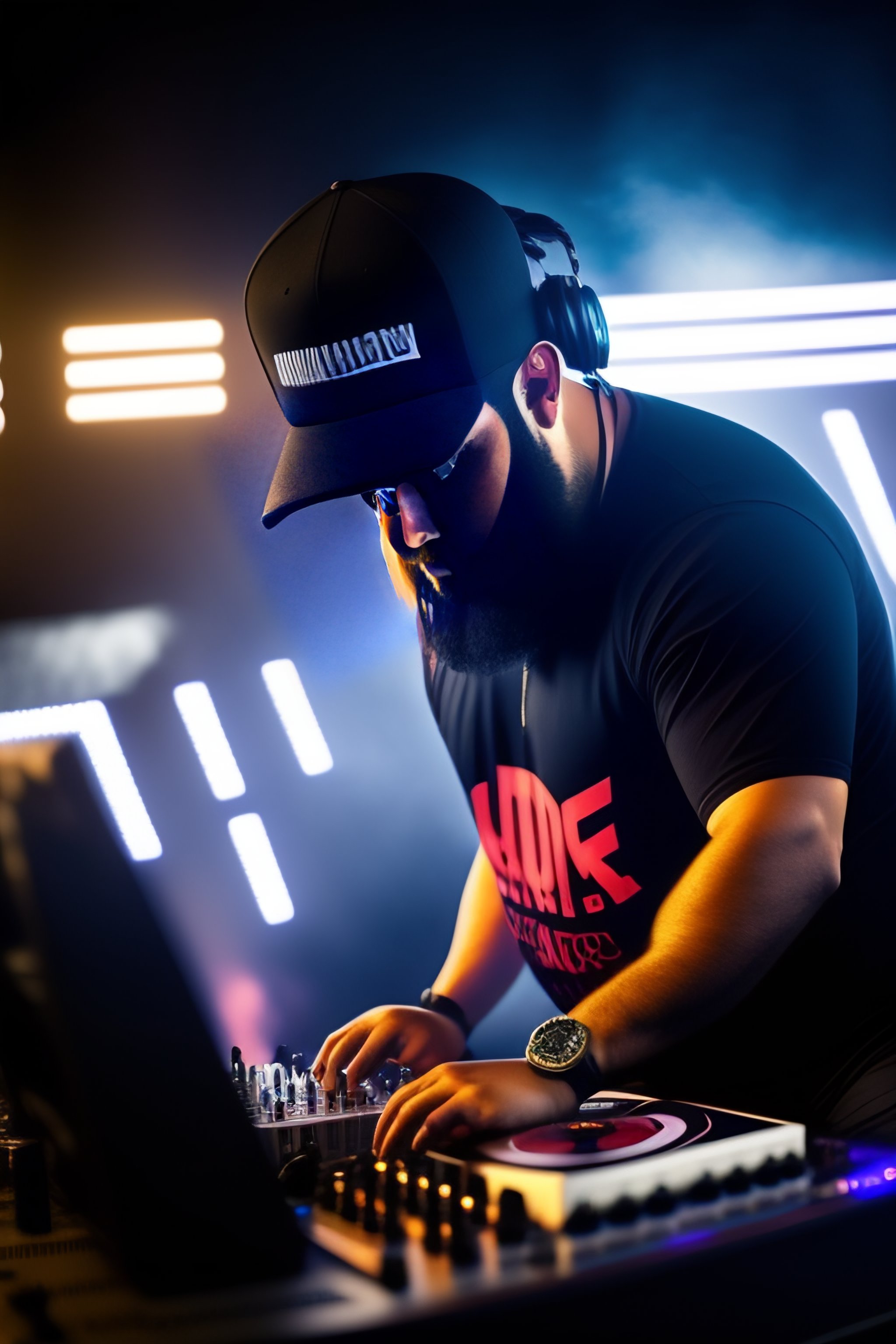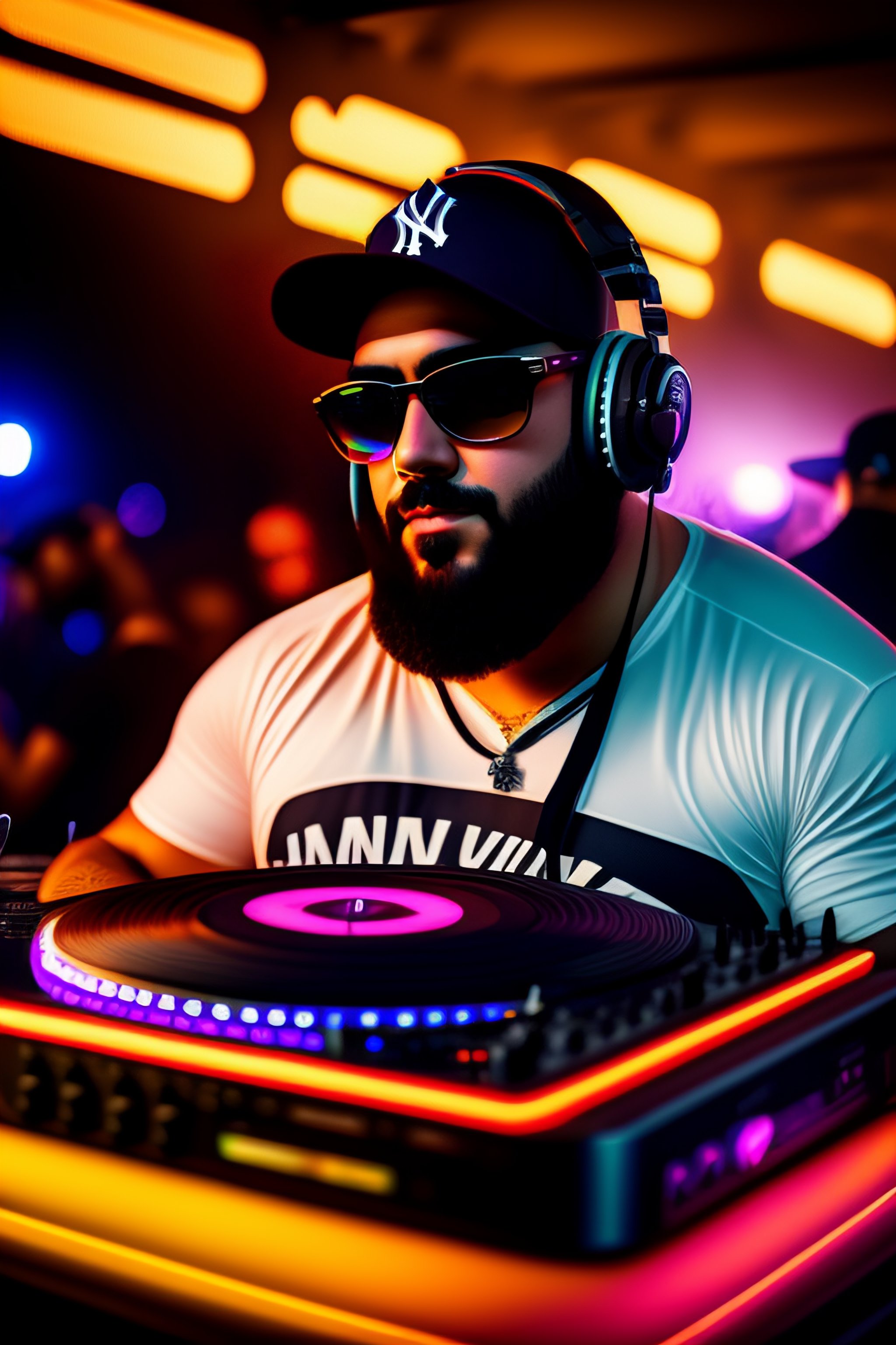 Un dj un poco gordo con gorra de los yankees tocando una cdj pioneer tocando edm con lentes barba y pelado