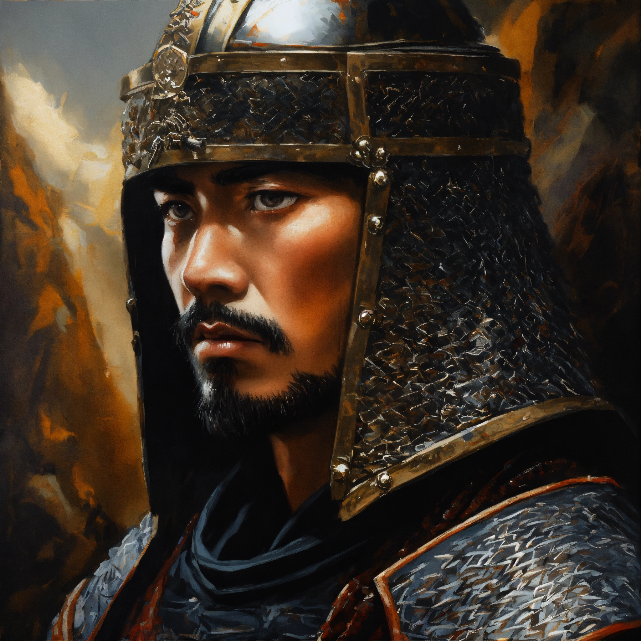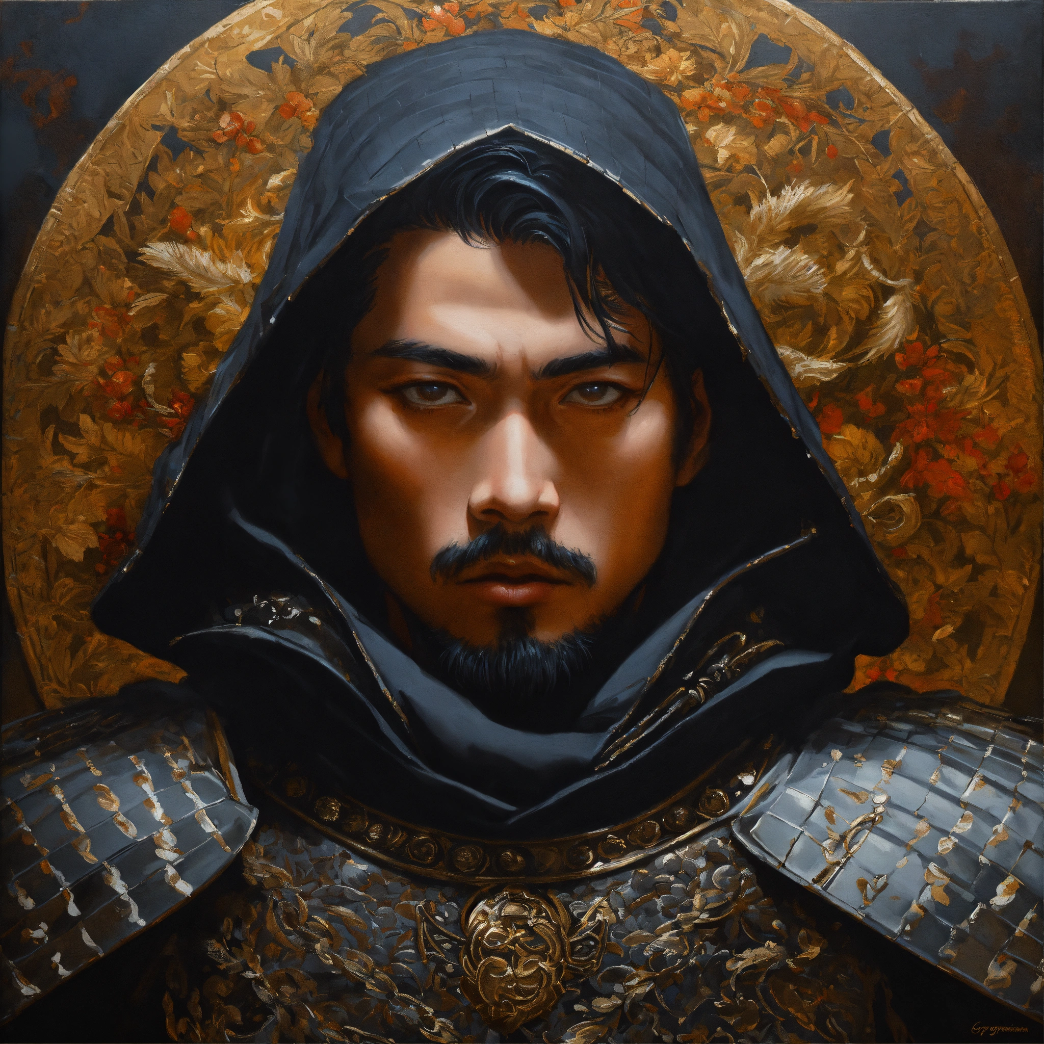 Medieval portrait of a samurai warrior wearing black chainmail armor and a cloak sharp features, grim, cold stare, dark colors, winds of winter, volumetric lighting, baroque oil painting by greg rutkowski, dynamic lighting hyperdetailed intricately detailed
