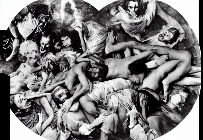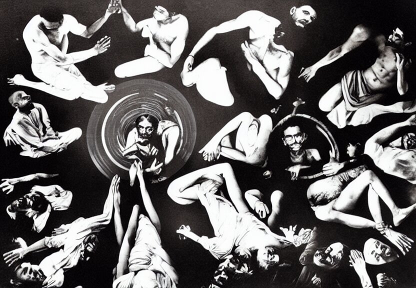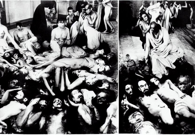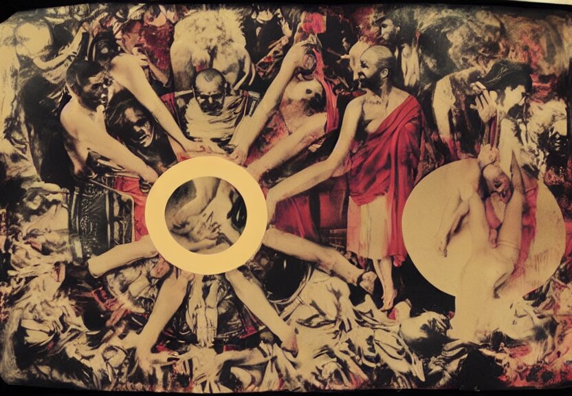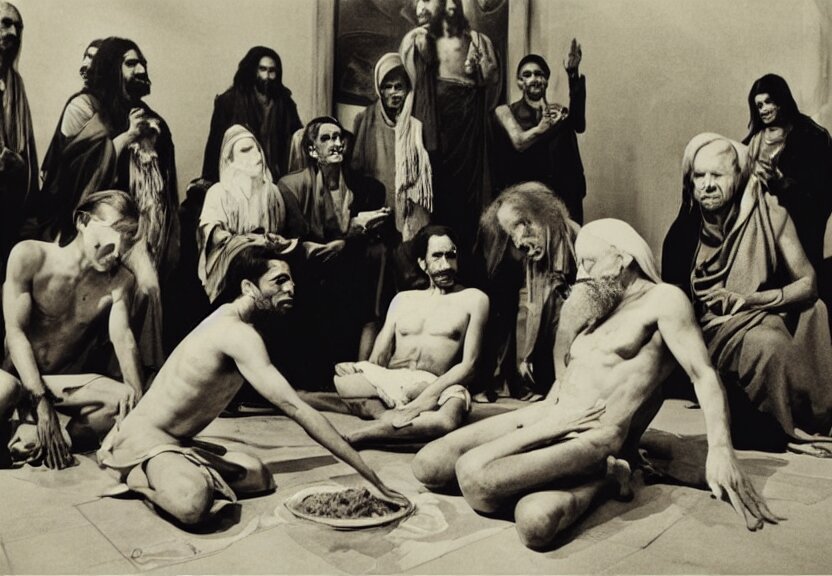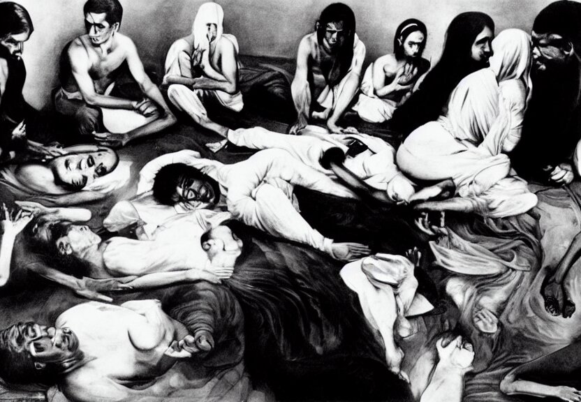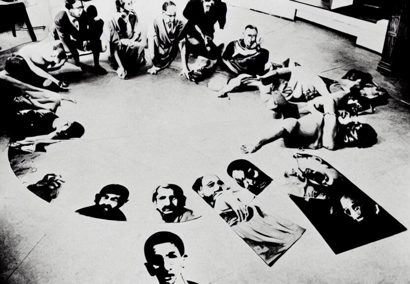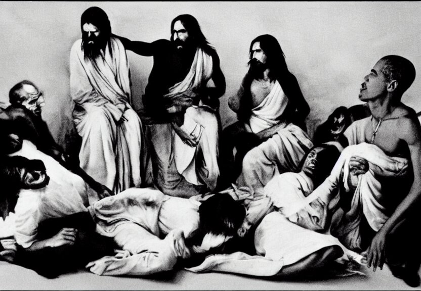 Smoke session for the ages: gandhi, obama, jesus, and lady gaga in a circle on the floor getting high by andy warhol and edward curtis