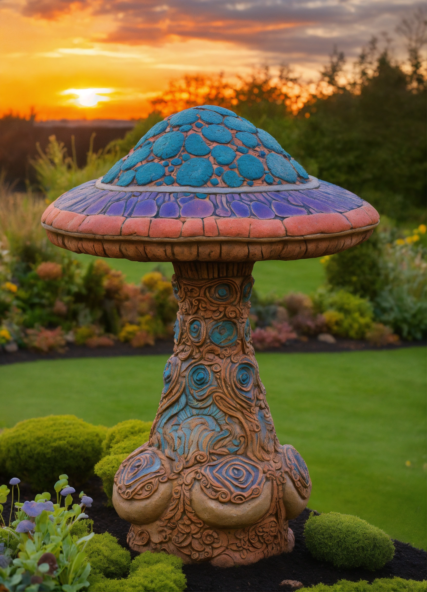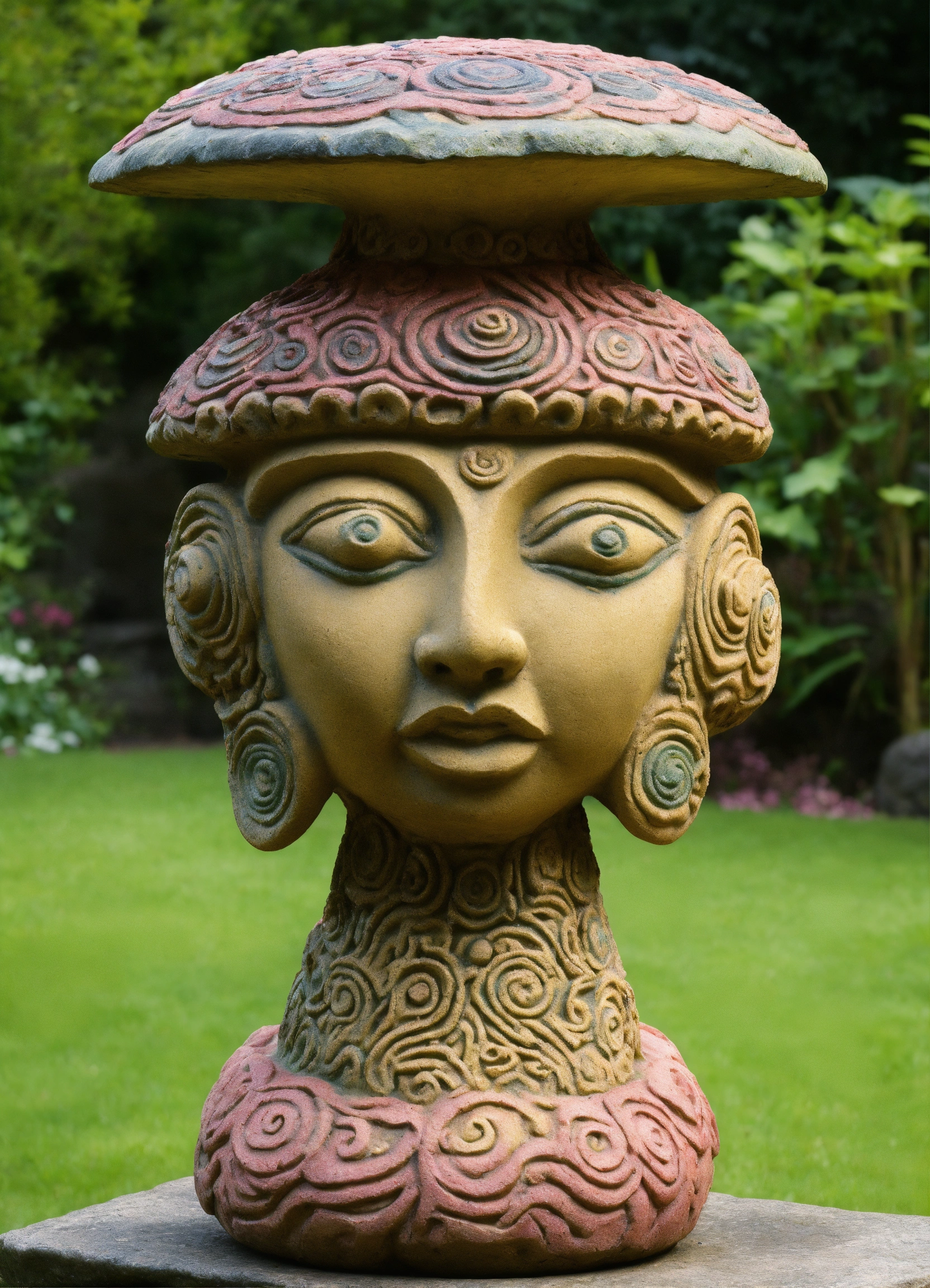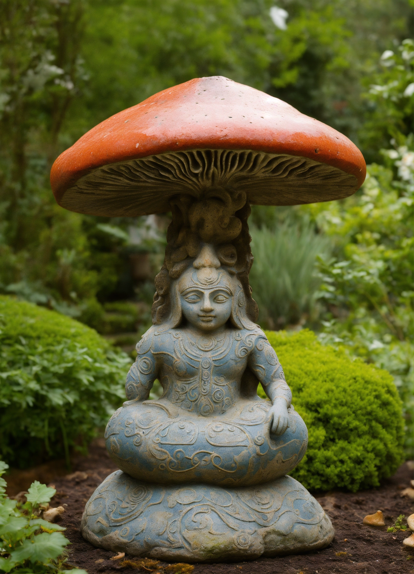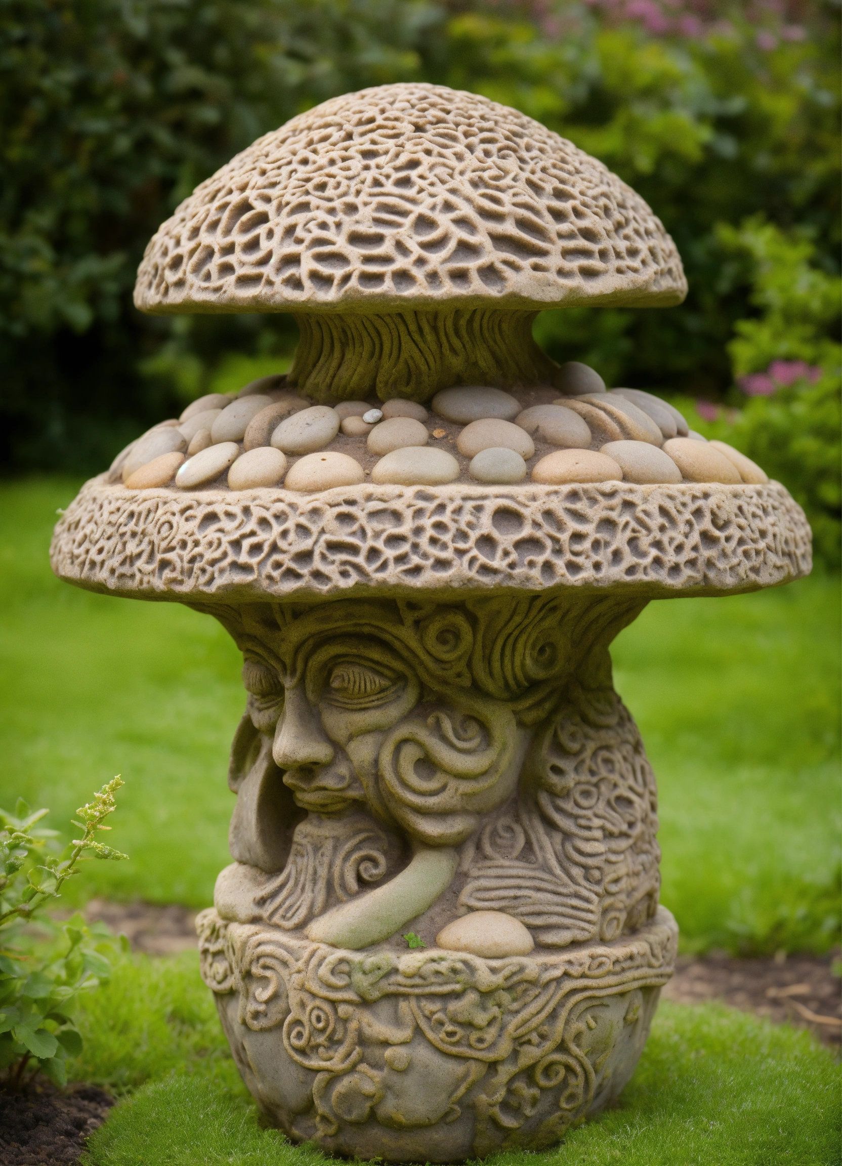 Ancient stone mushroom deity sculpted garden ornament in the style of alex grey